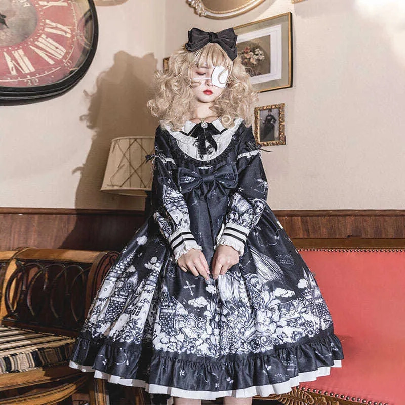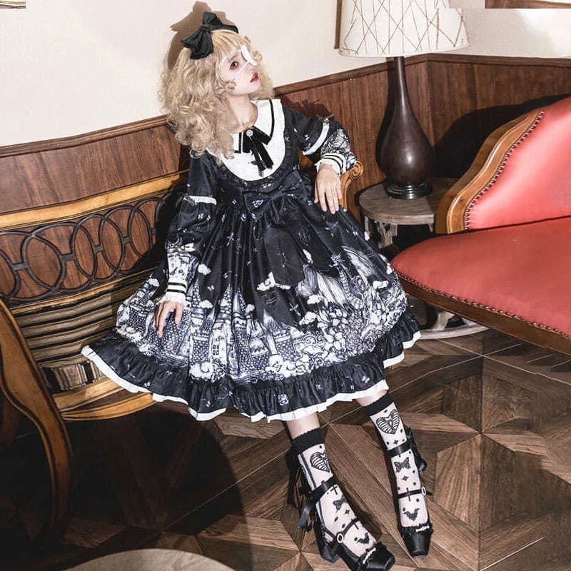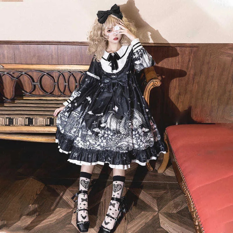 Plus Size 300 Jin Dark Lolita Bow Dress Female Plus Size Lolita Soft Girl Long Sleeve Cos Skirt