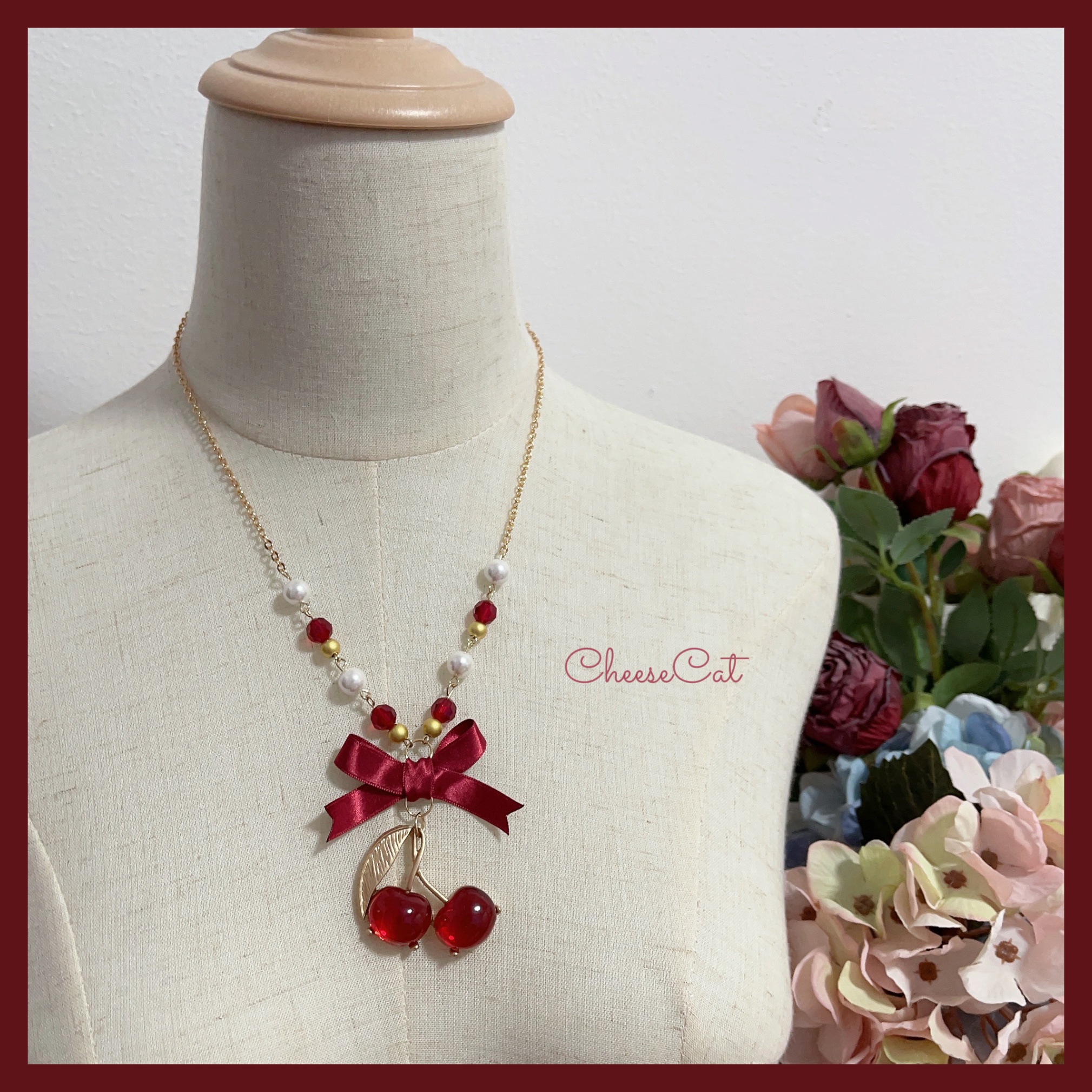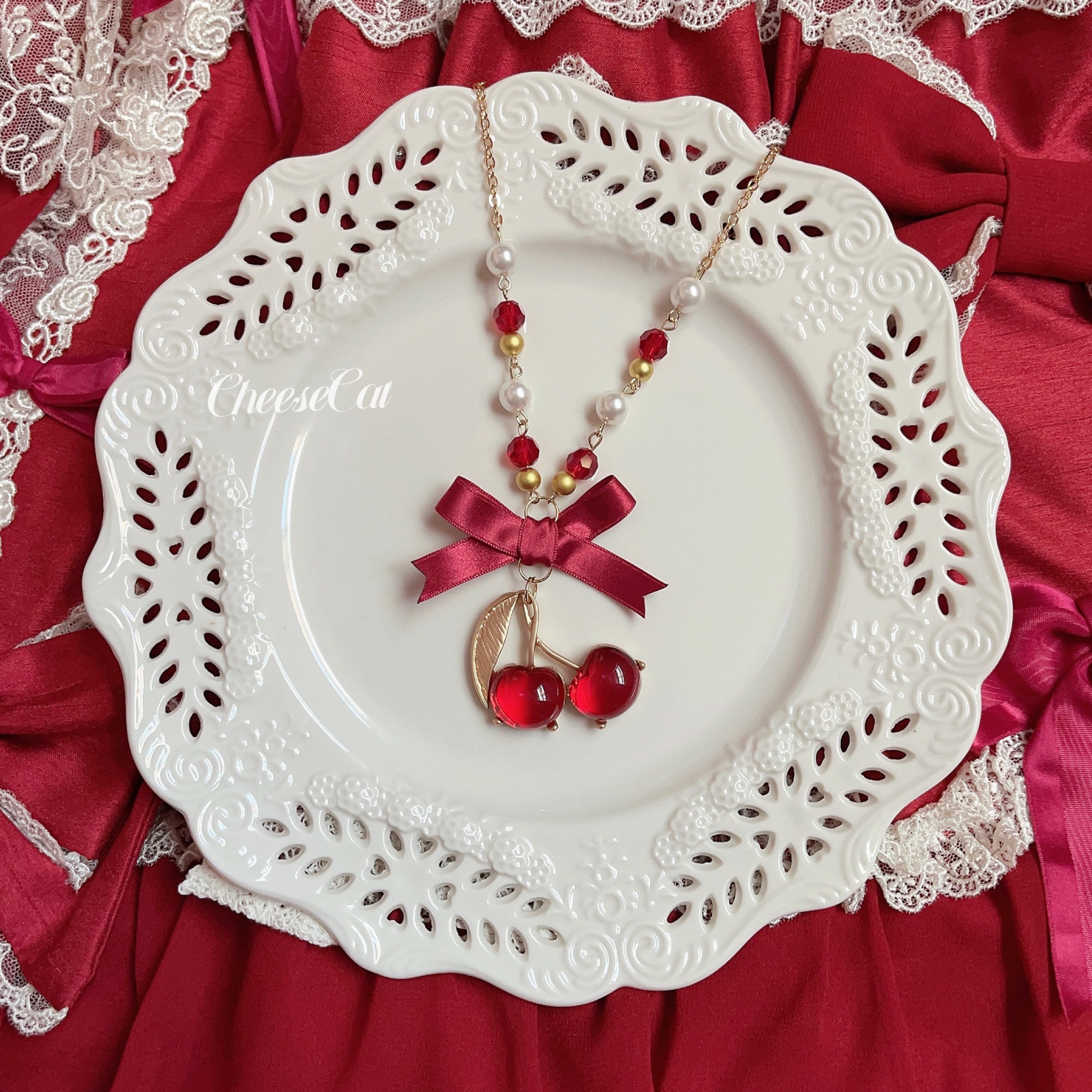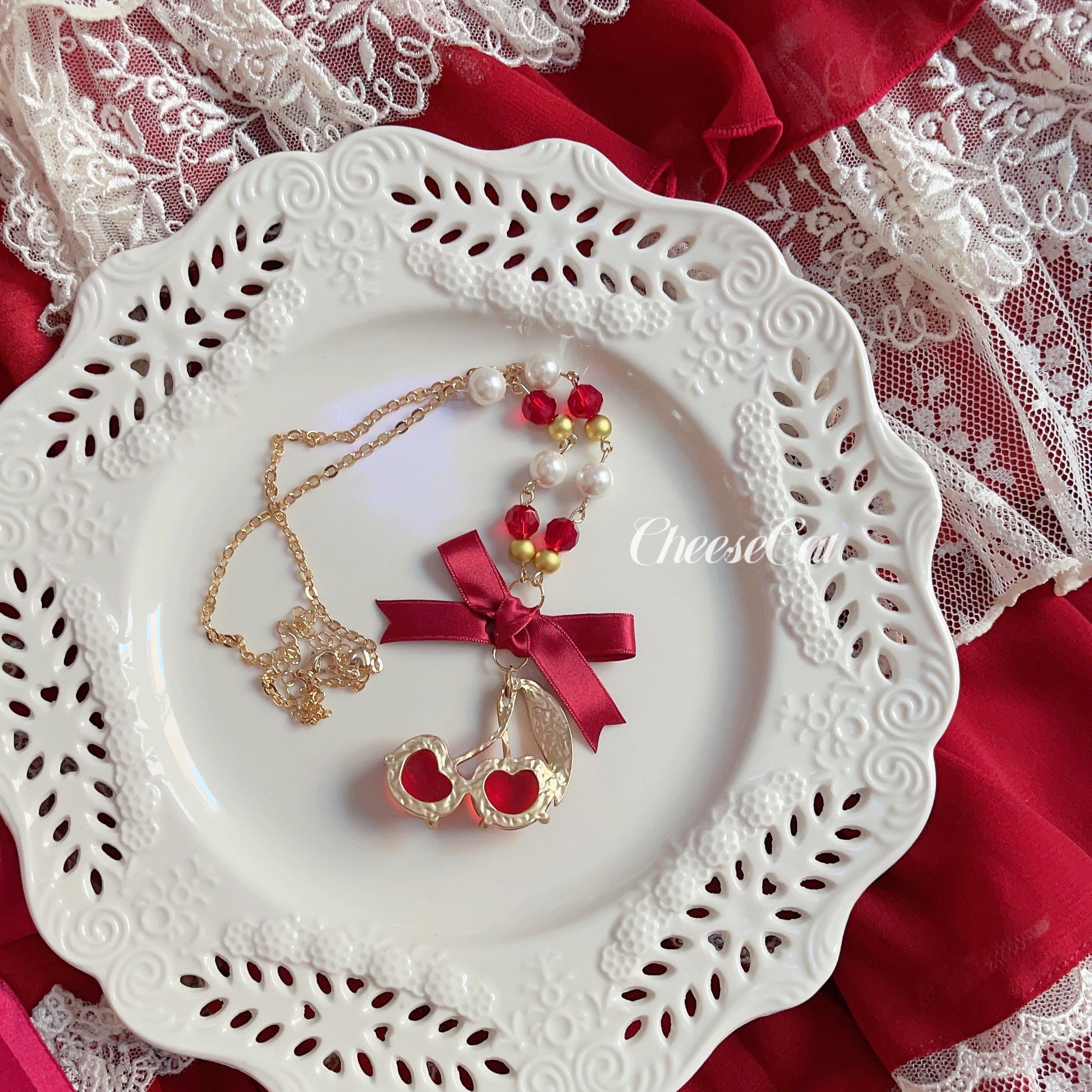 [Cheese Cat Handmade] Cherry Cherry Elegant Pearl Versatile Love Princess Lolita Small Jewelry Necklace