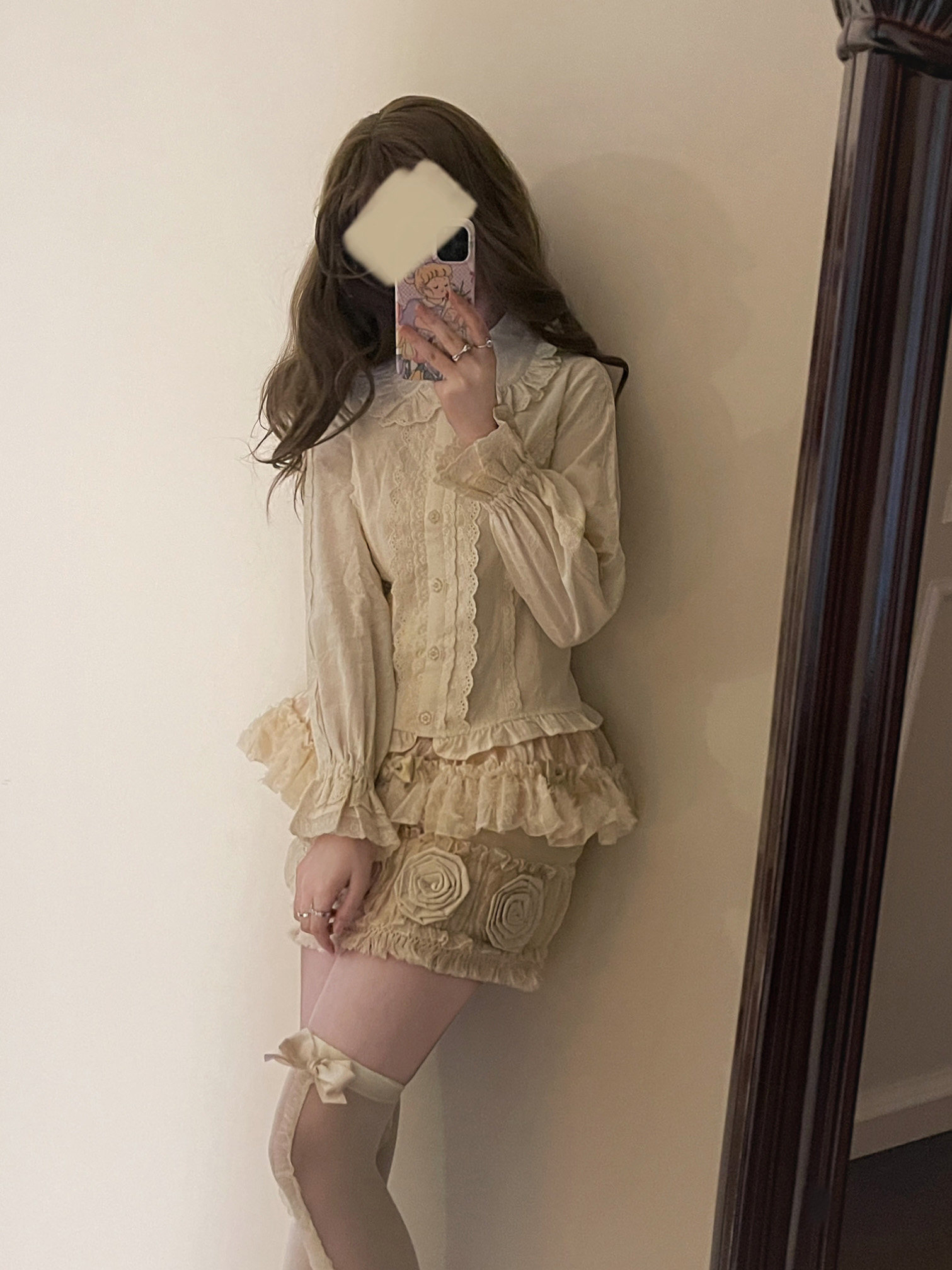 [Lily] Lolita-style long-sleeved Lolita shirt with puff sleeves, Peter Pan collar, and vintage lace, perfect for a cute and soft girl look.