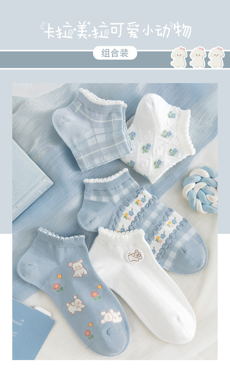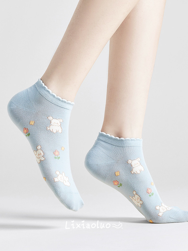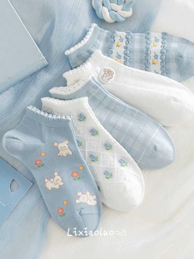 Caramella women's summer thin cartoon cute blue college short socks, breathable invisible cotton socks