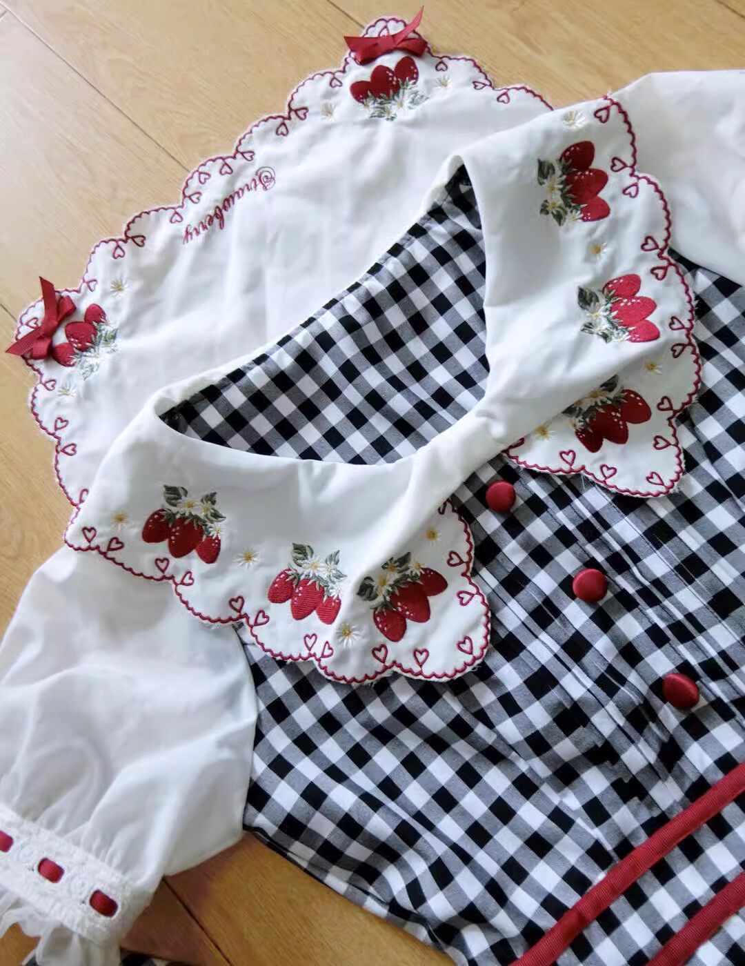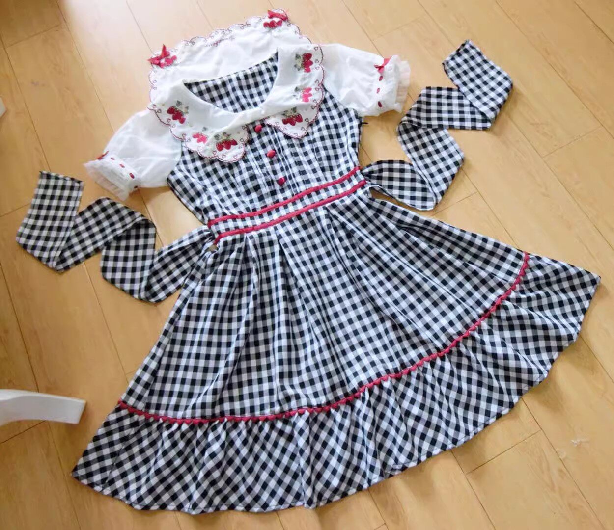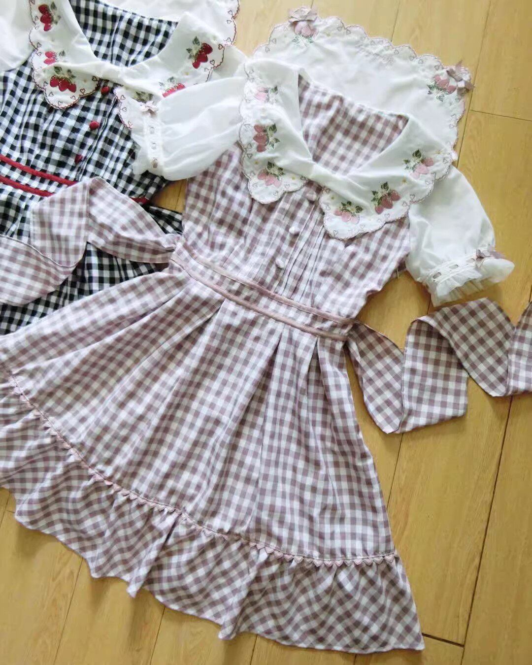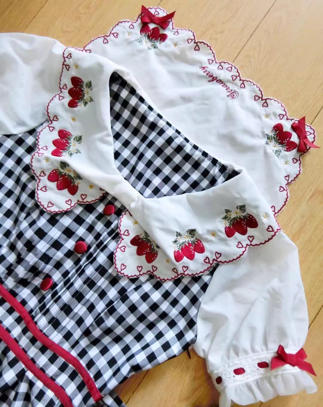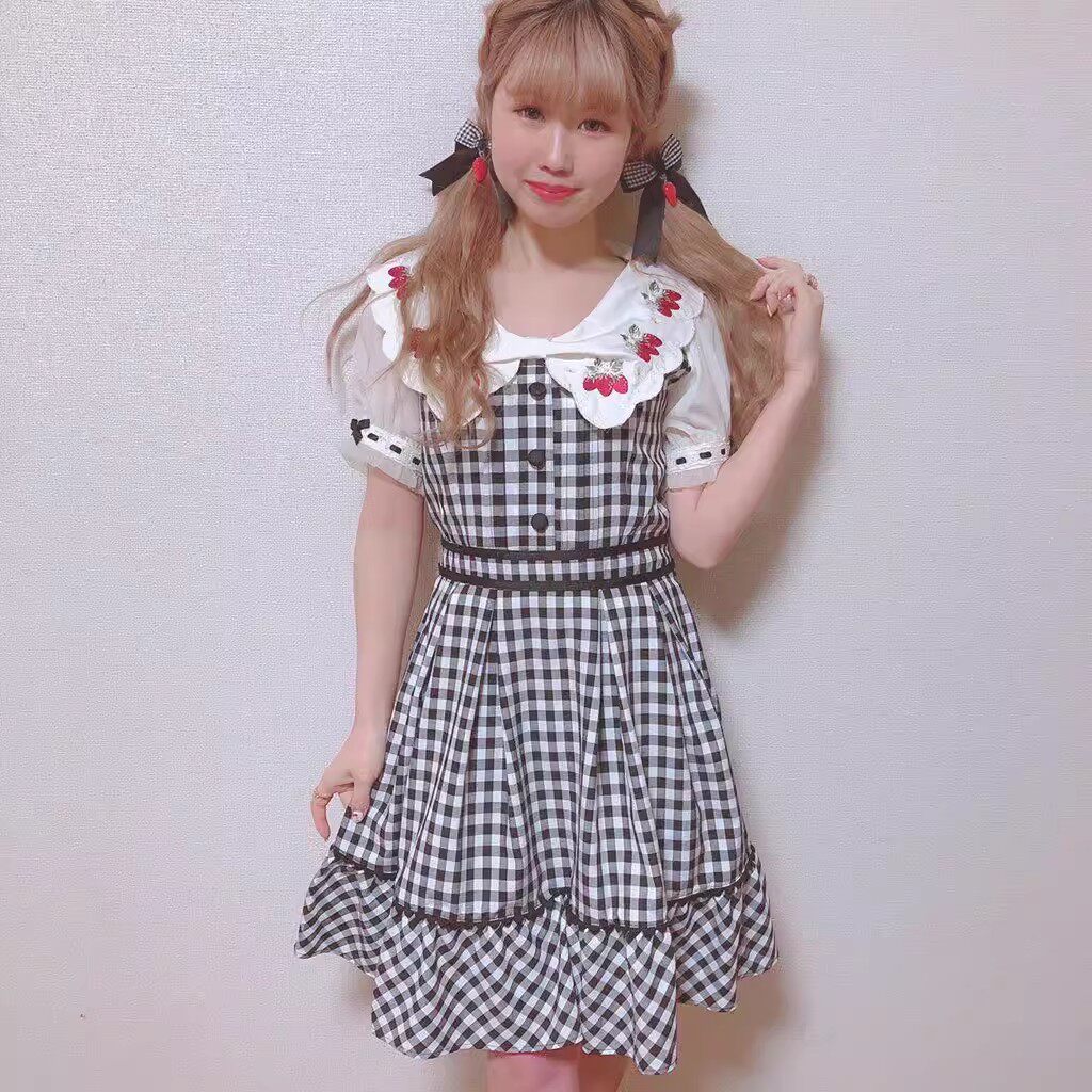 2026夏季日系蝴蝶结甜美草莓刺绣量产型海军领格子连衣裙高腰修身 [Original Page Link]