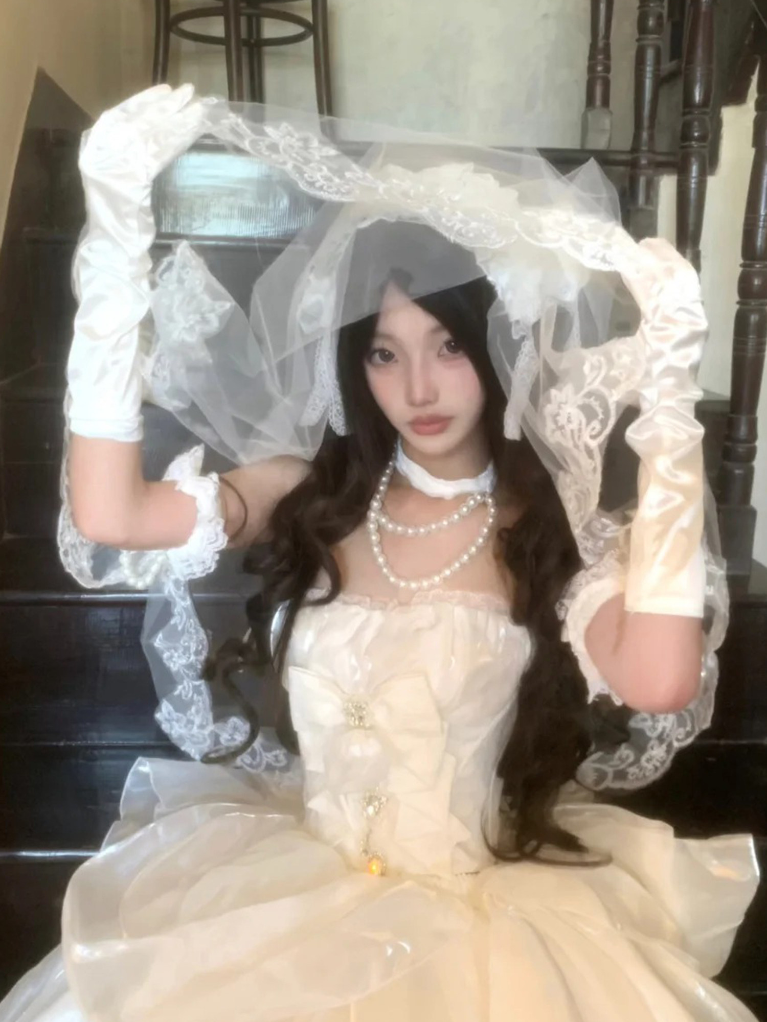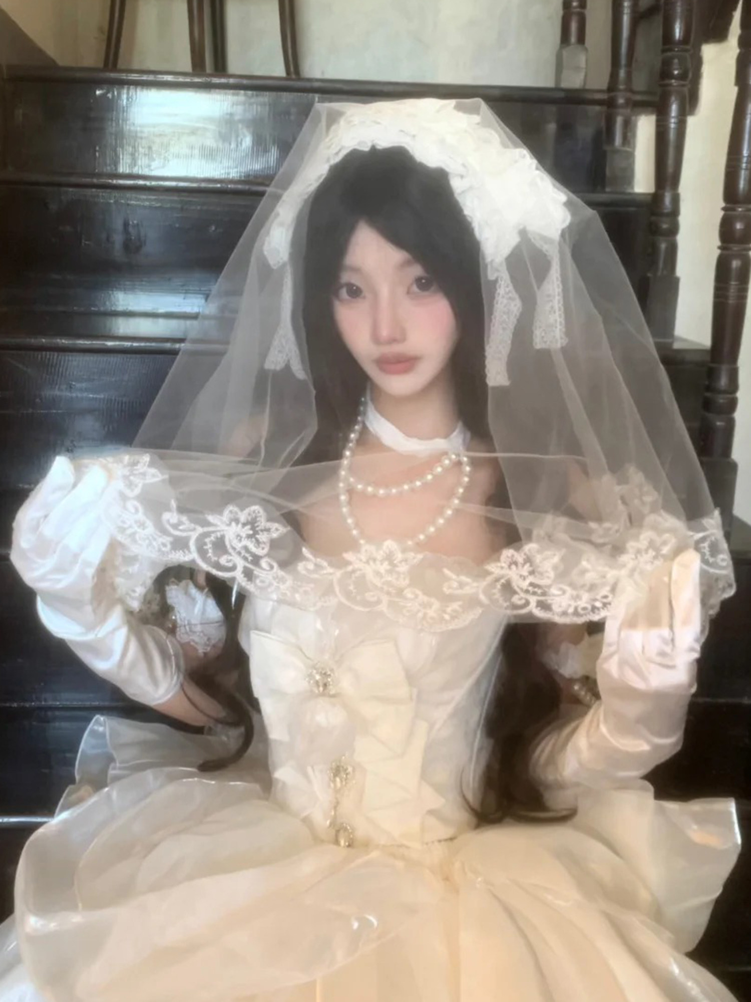 洛丽塔lolita手作花嫁头纱新娘结婚领证头饰白色覆古蕾丝花边头巾 [Original Page Link]