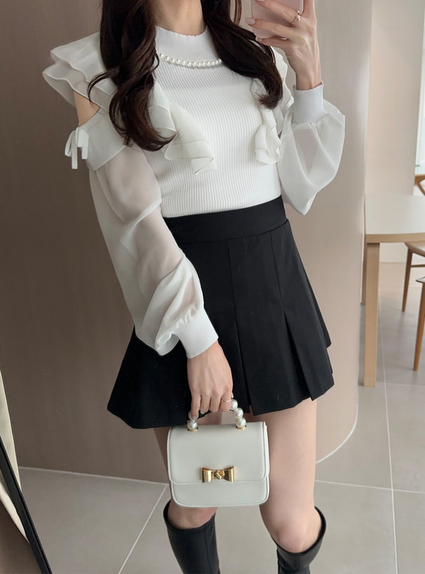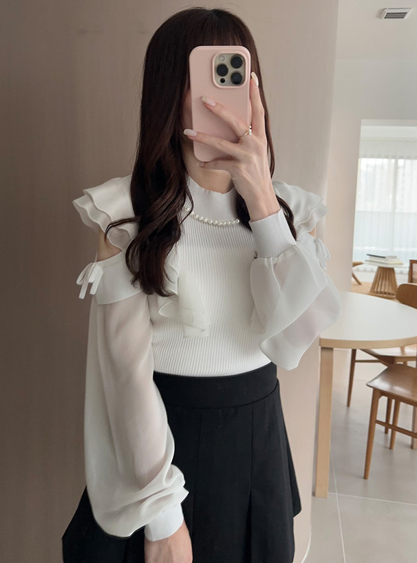 正品日本代购GRL日系女士夏季新款可爱珍珠蝴蝶结荷叶边露肩上衣 [Original Page Link]