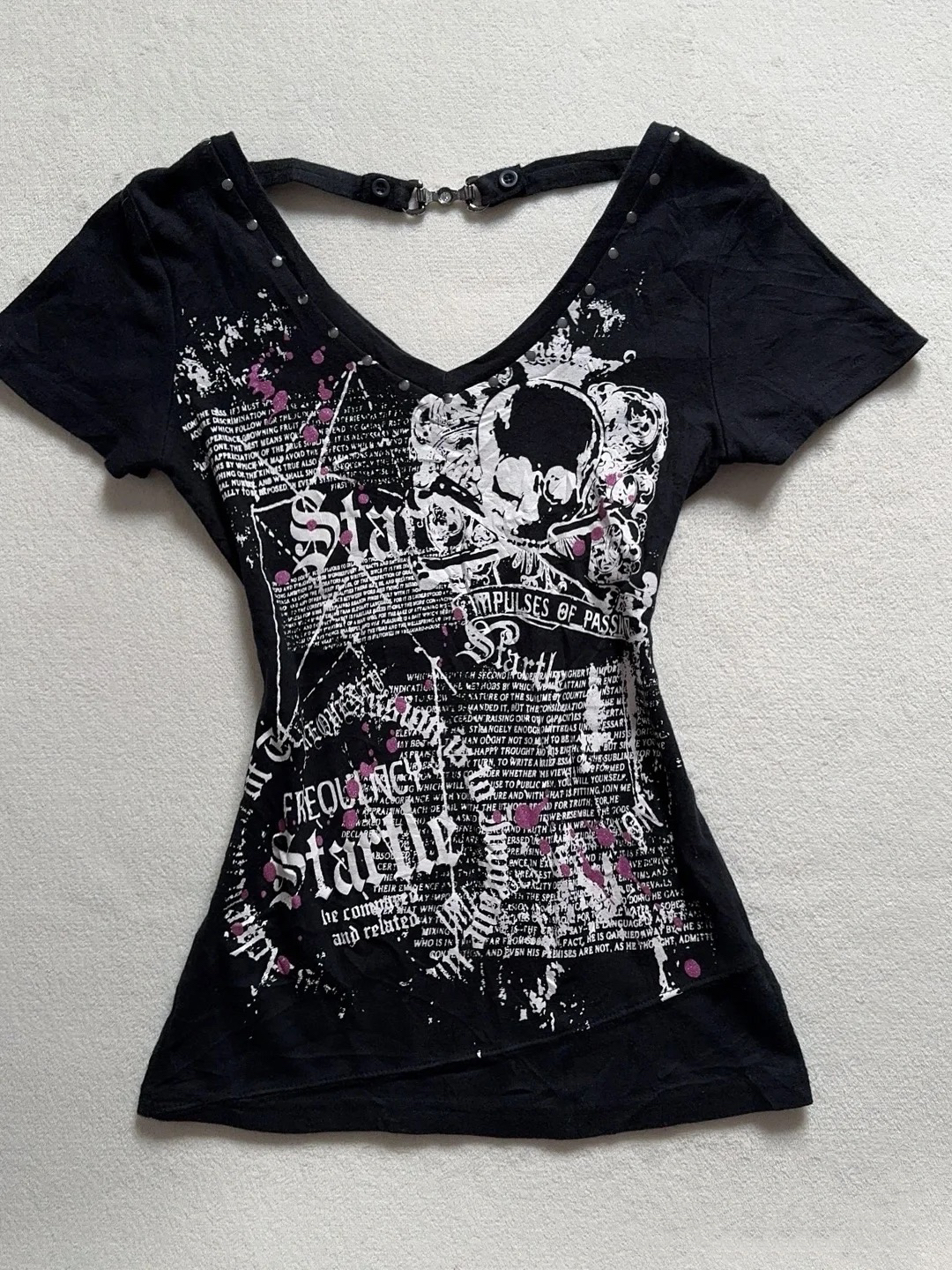 亚文化朋克y2k千禧辣妹覆古铆钉V领印花T恤女露背金属扣短袖上衣 [Original Page Link]