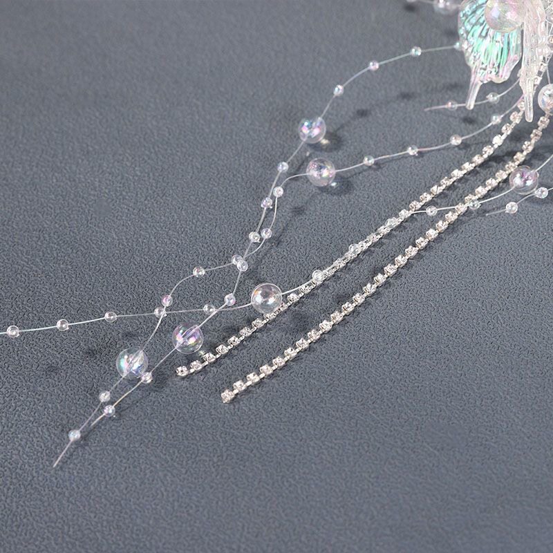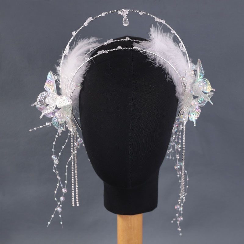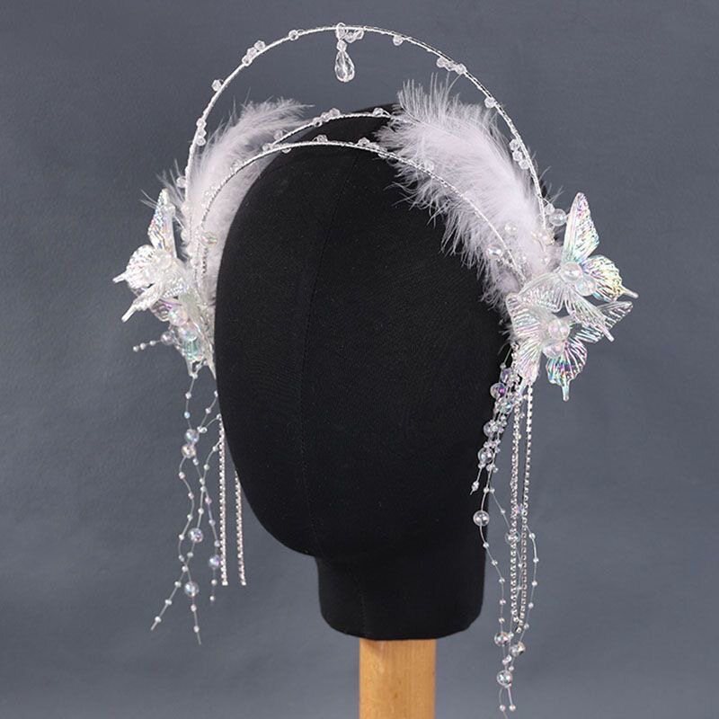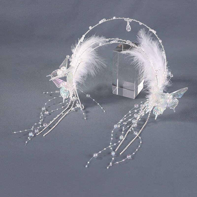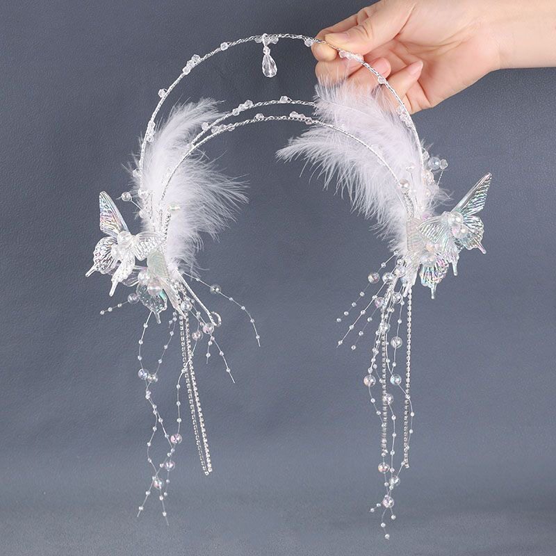Handmade original Hanfu headband hair ornaments, tassel hair crown, girlish ancient style fairy white feather hair accessory butterfly headband