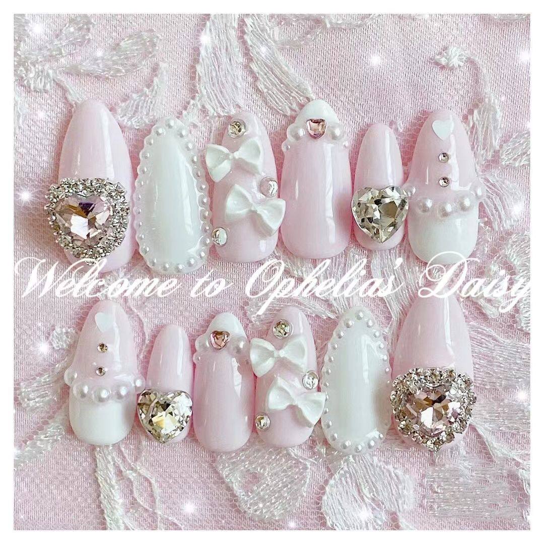 日式粉白款L码光疗甲片 蝴蝶结爱心钻设计 美甲穿戴片台湾制造 [Original Page Link]