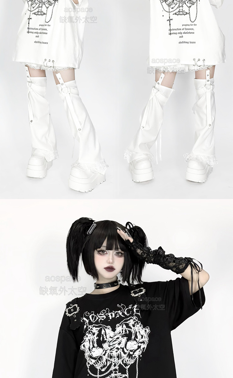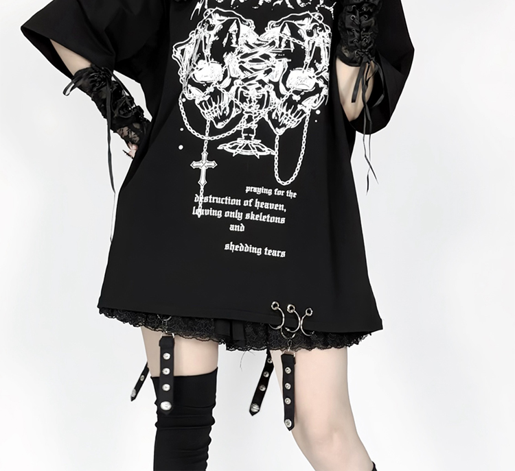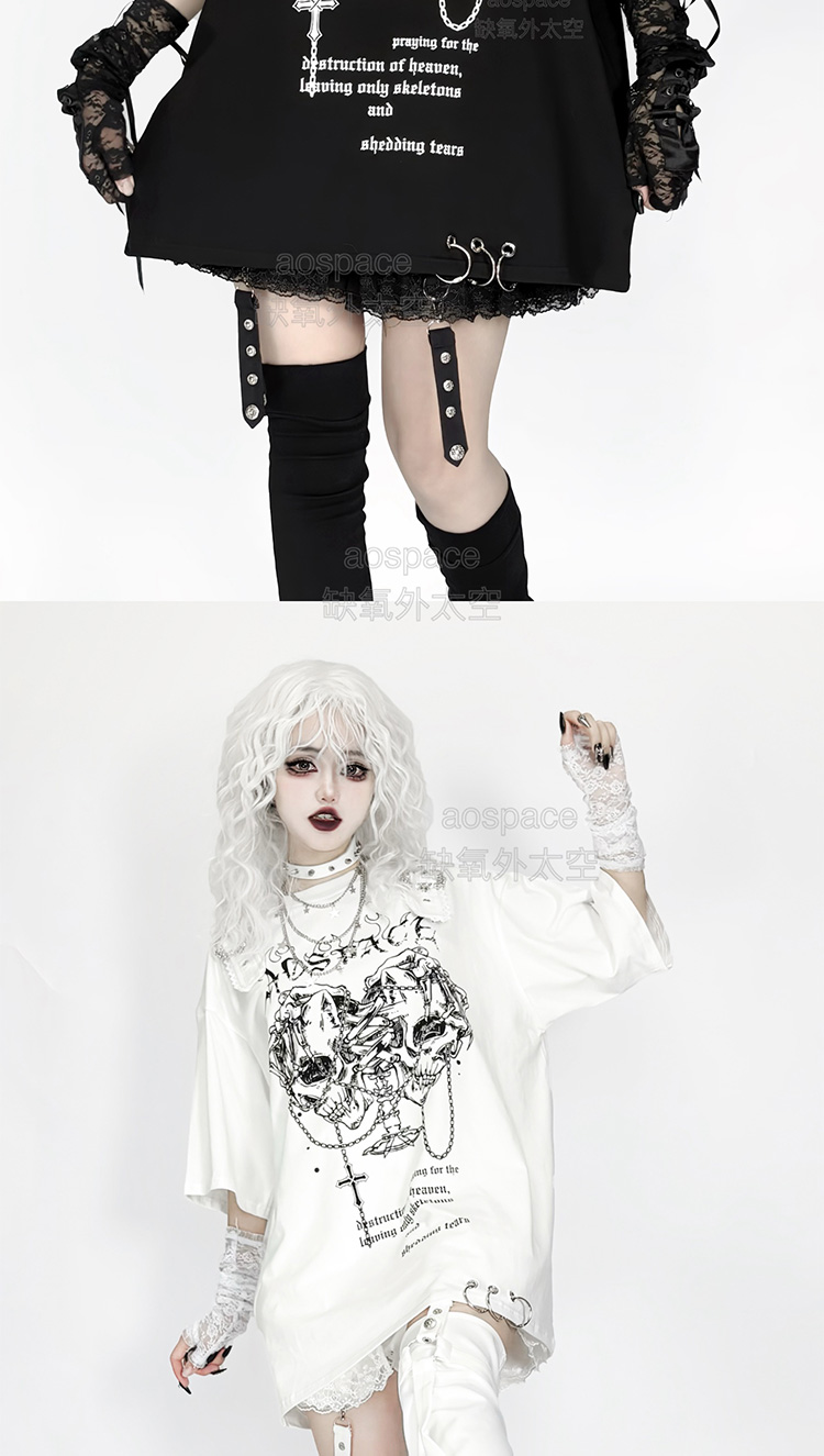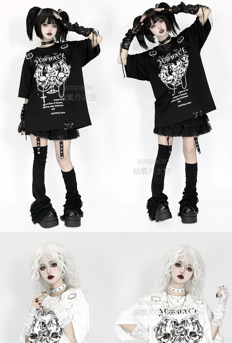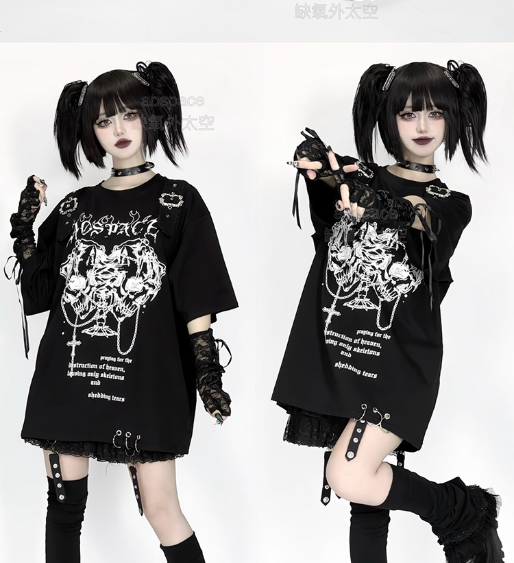 Oxygen-deficient outer space [Worldly Netherworld] Original subculture punk double skull print dark short sleeves