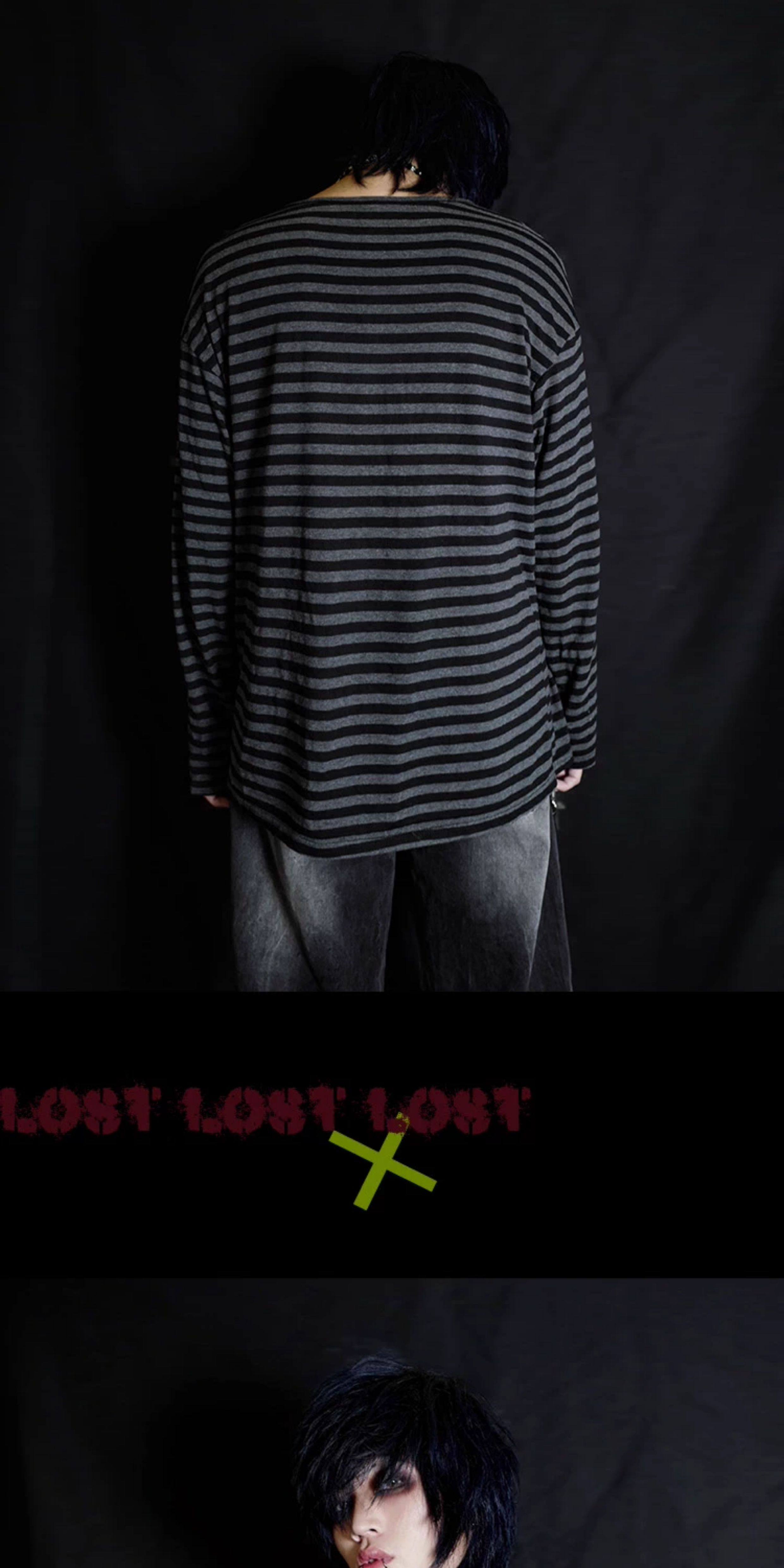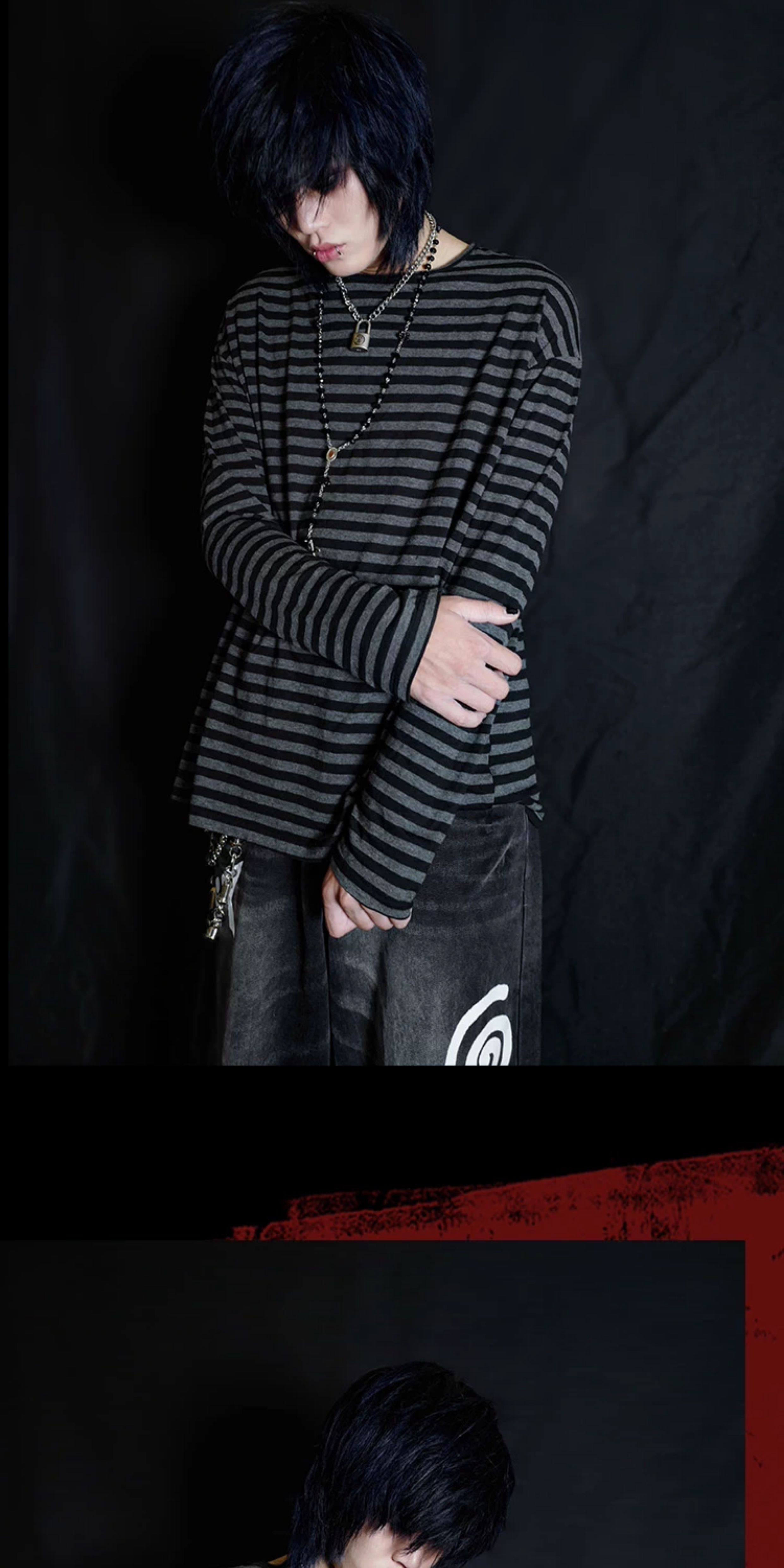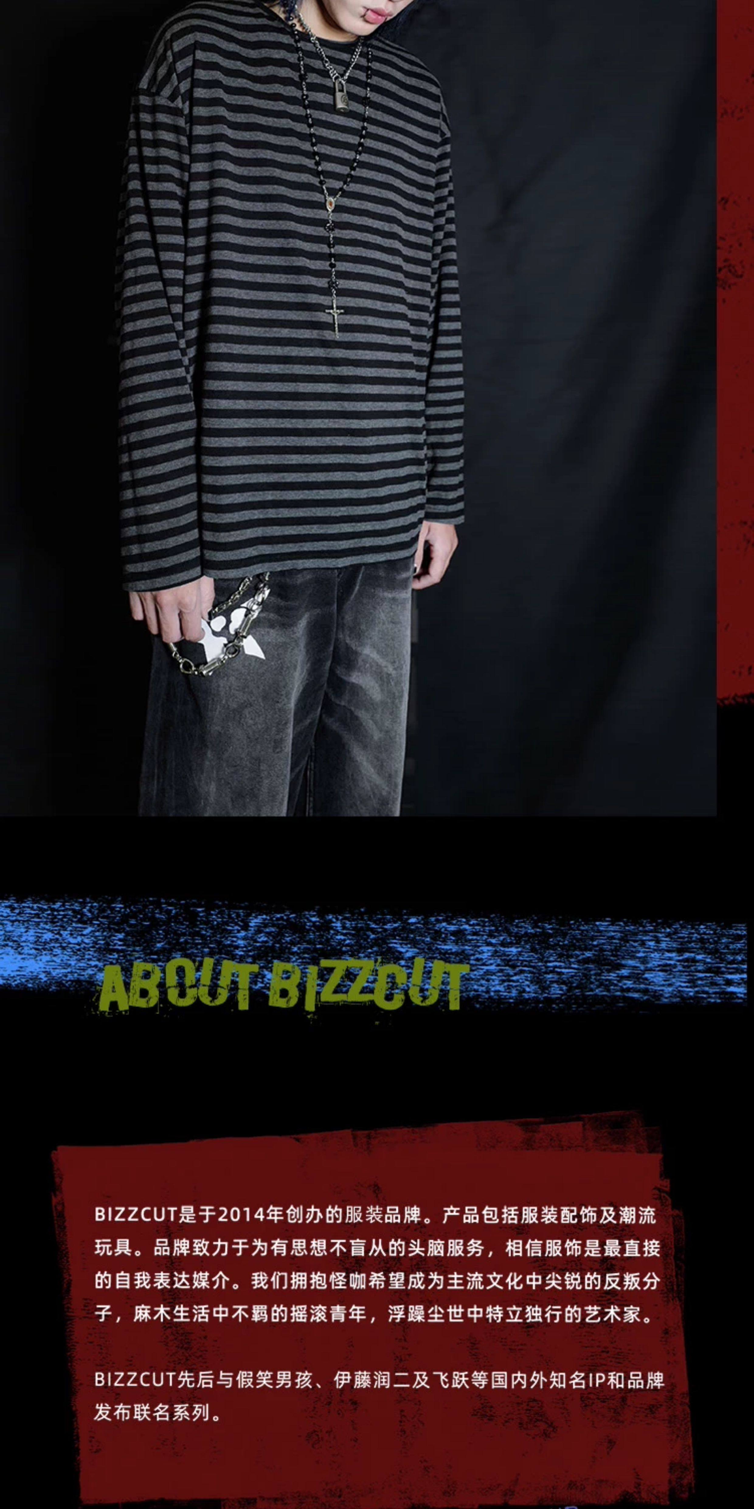 别闹BIZZCUT/阴郁emo/亚文化上衣宽松落肩黑灰条纹打底长袖T恤 [Original Page Link]