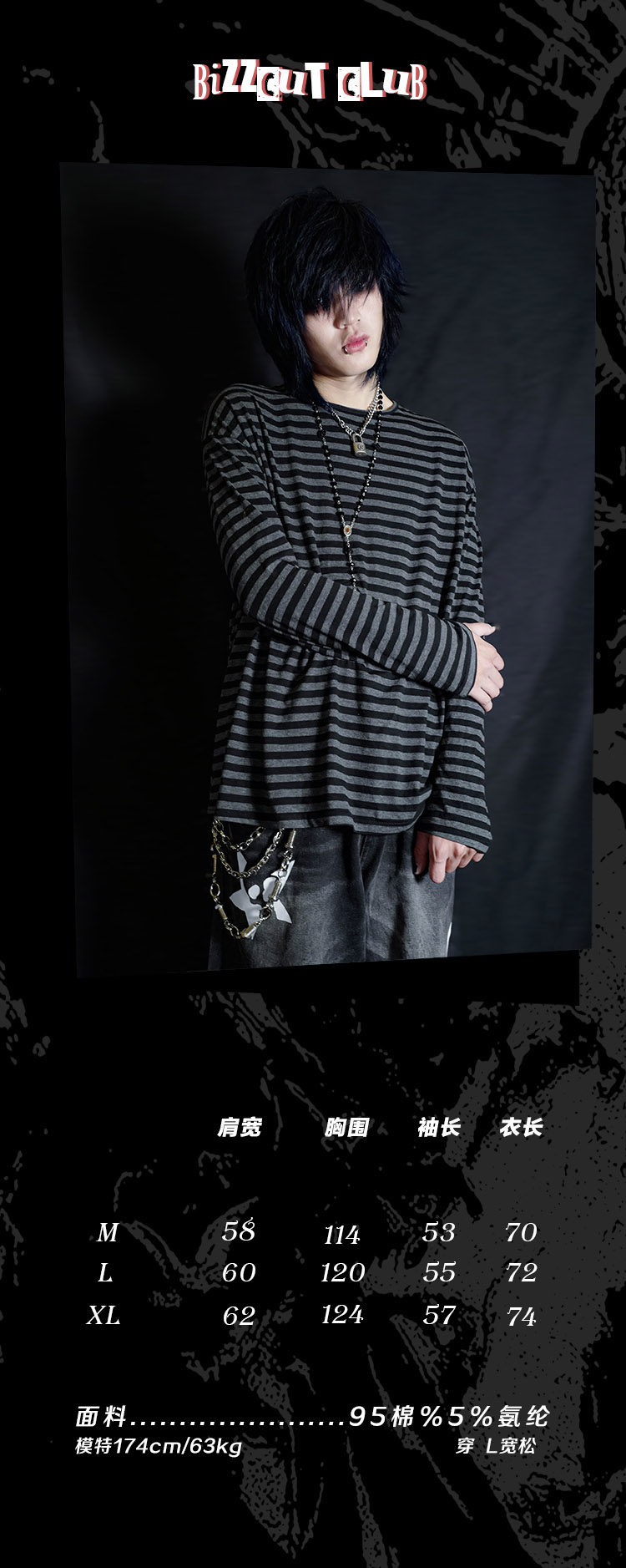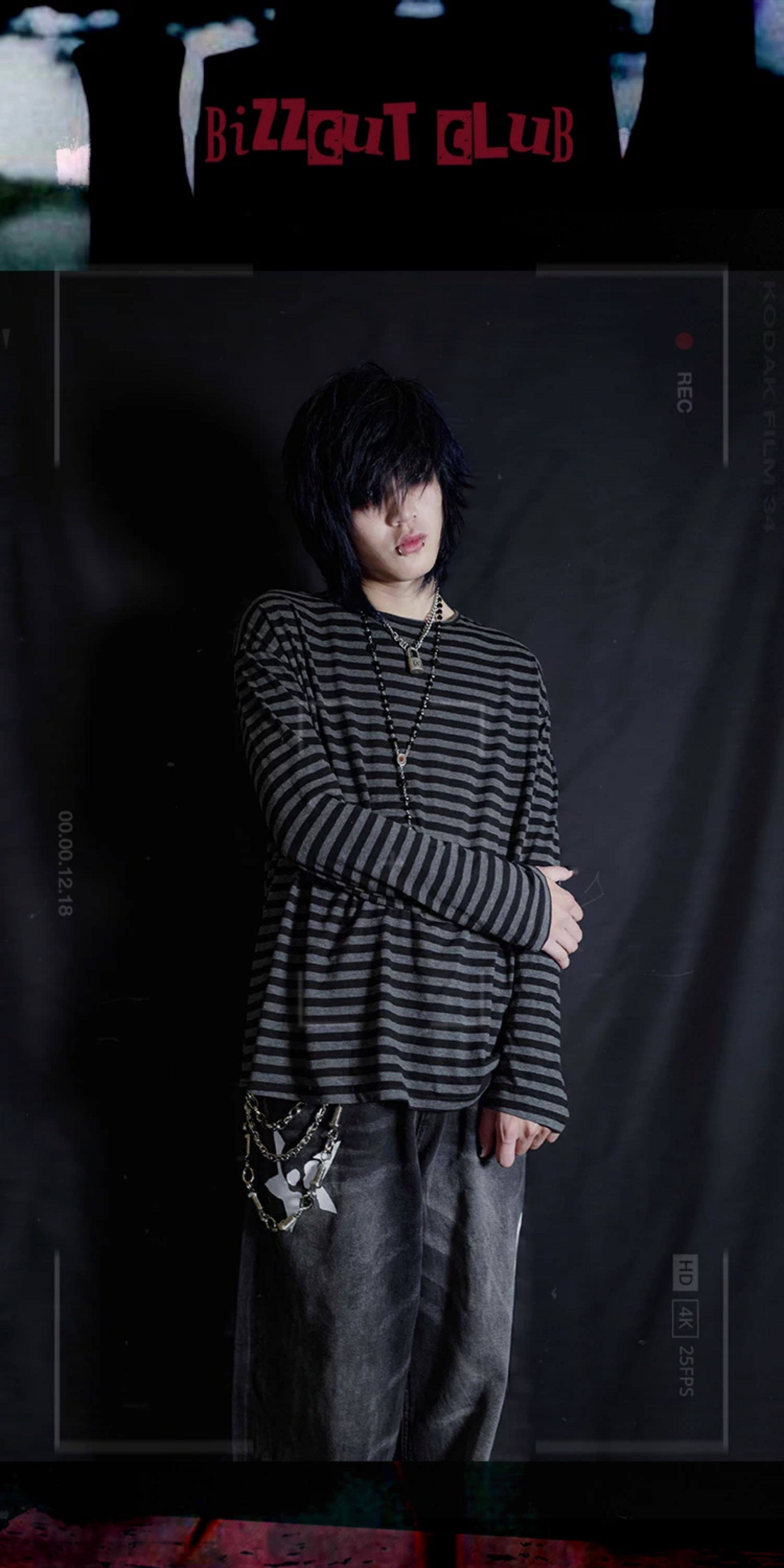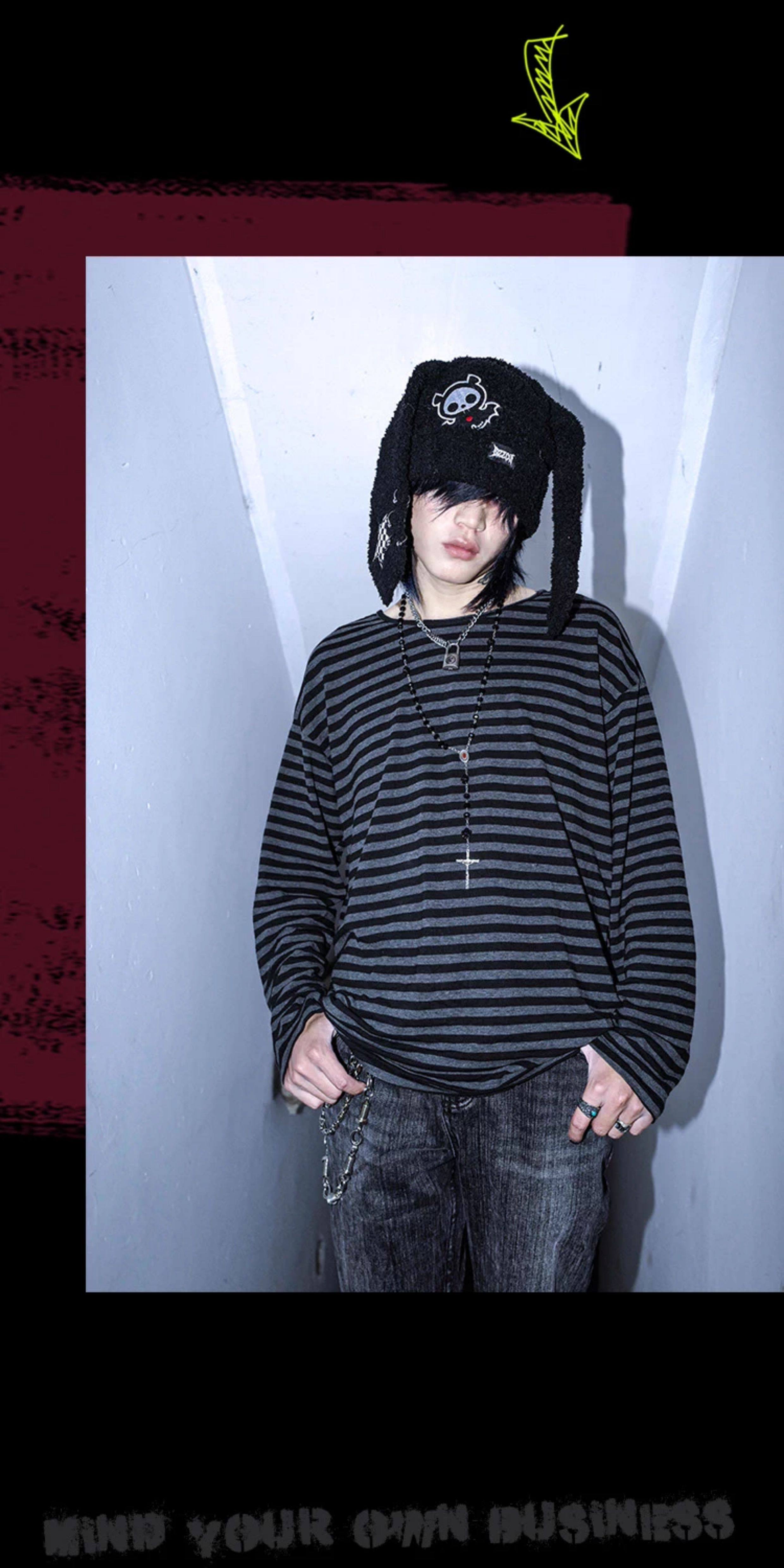 别闹BIZZCUT/阴郁emo/亚文化上衣宽松落肩黑灰条纹打底长袖T恤 [Original Page Link]