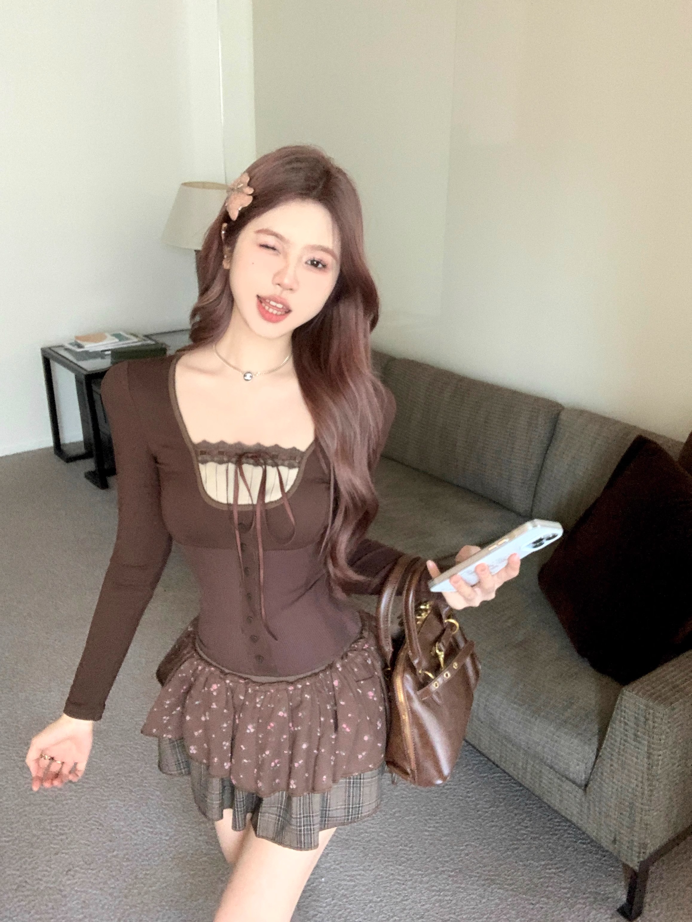 初秋韩系穿搭套装女甜辣妹修身短款T恤上衣碎花蛋糕半身裙两件套 [Original Page Link]