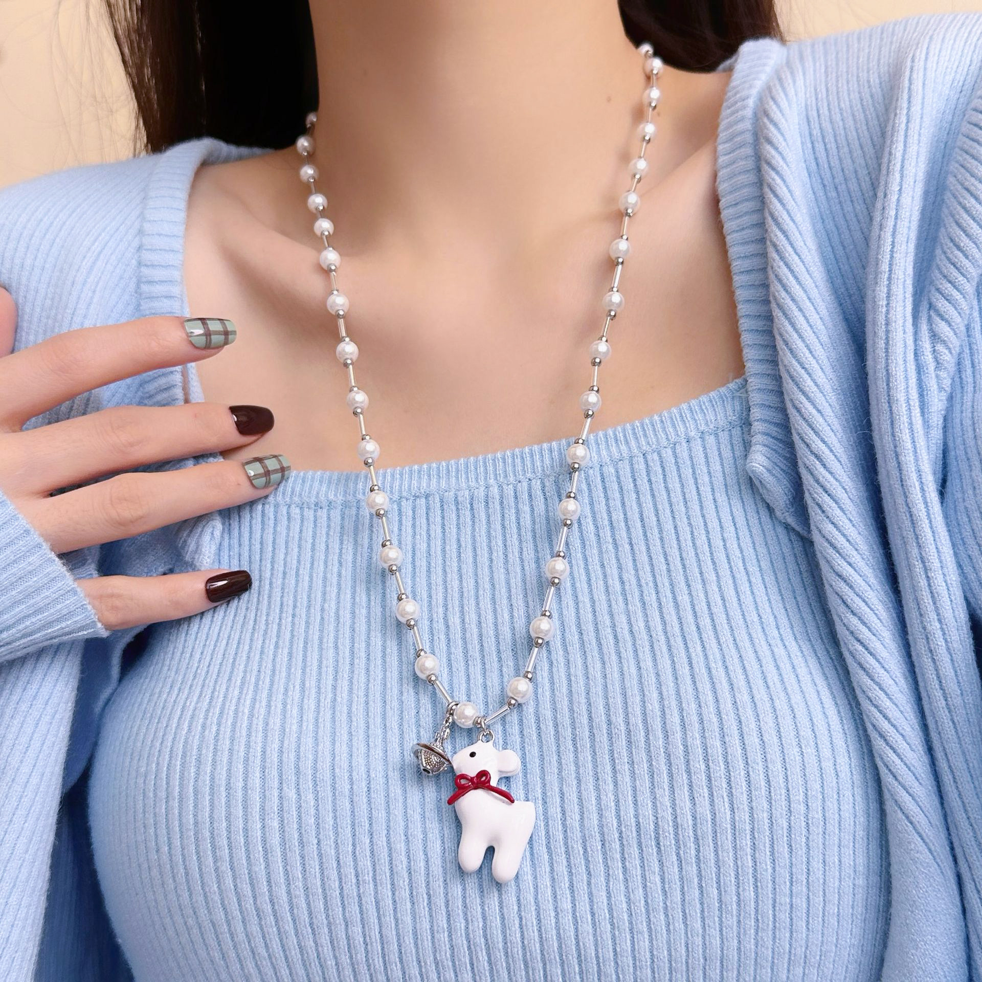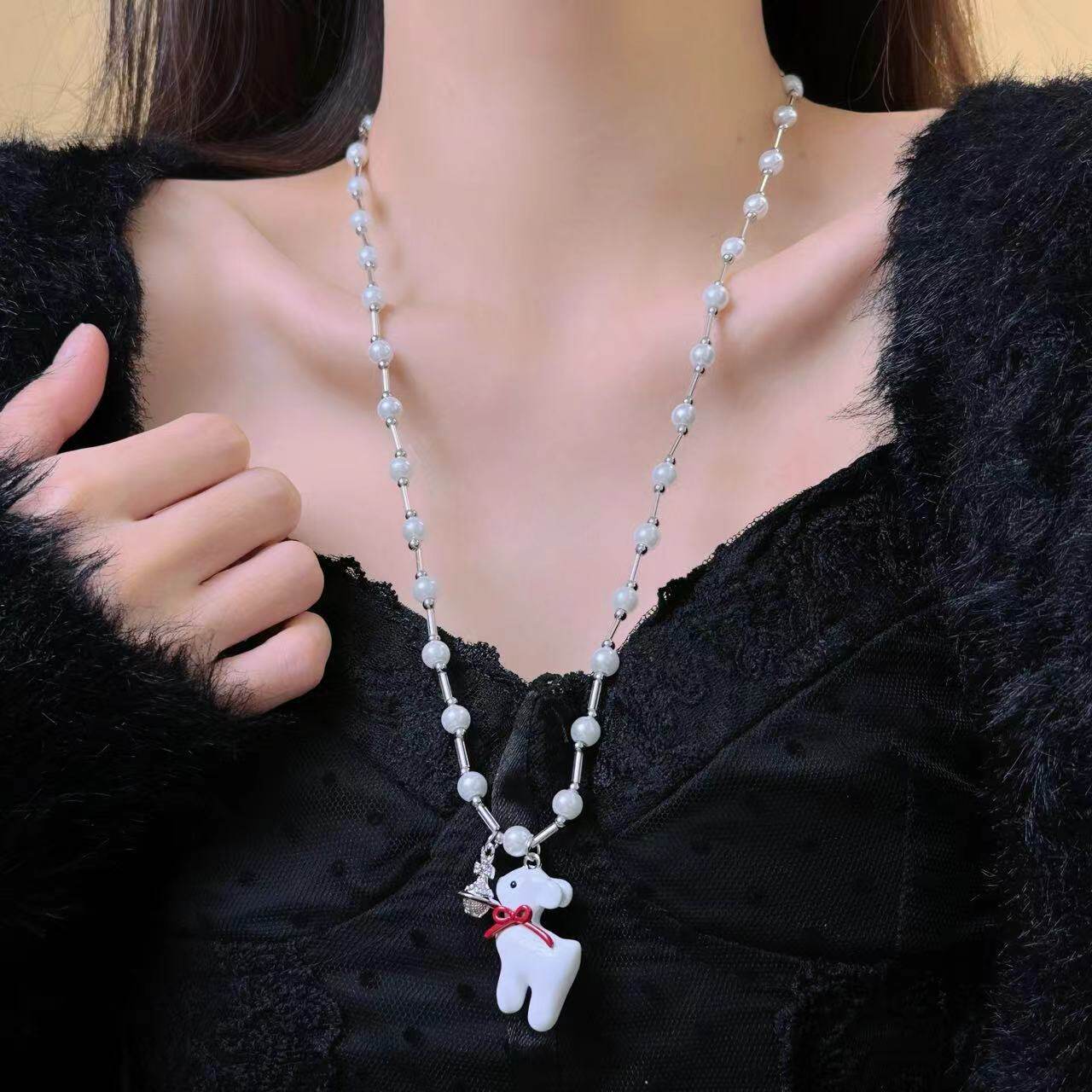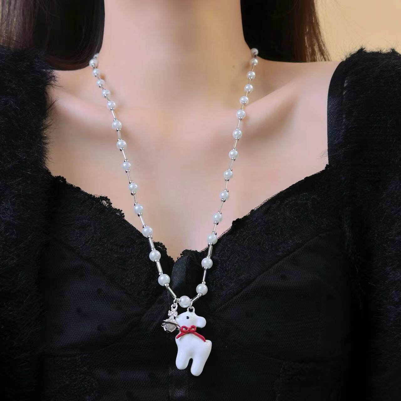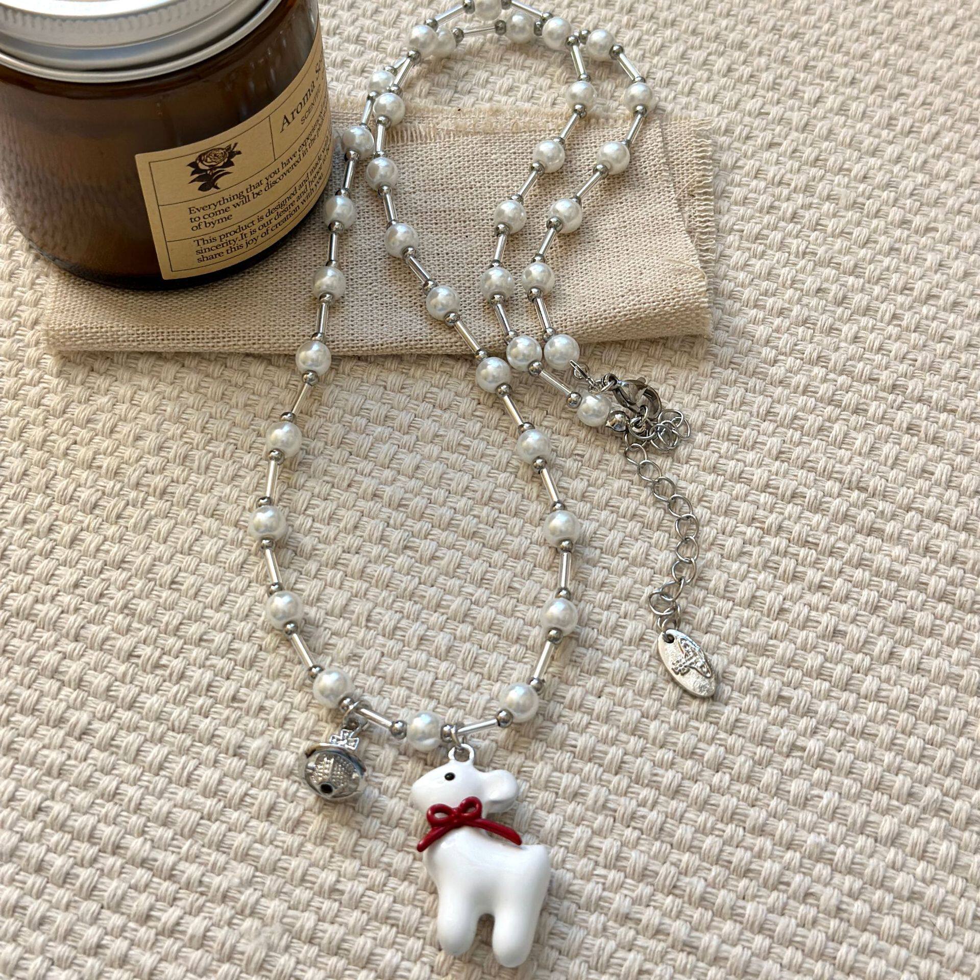 Y2K Angora red bow cream deer necklace ring cute hot girl sweet cool niche high-end atmosphere