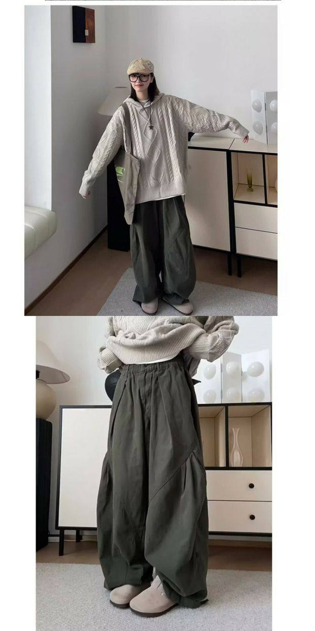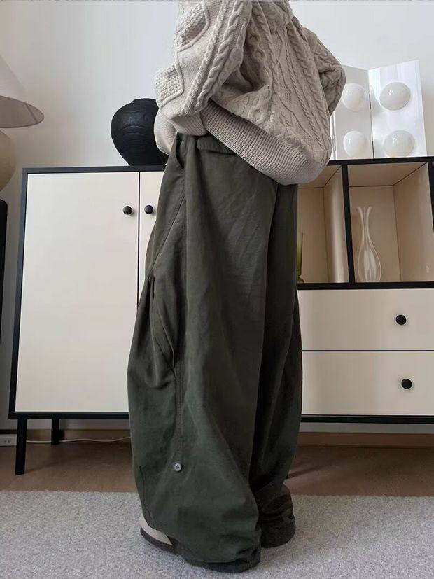 Japanese-style retro wide-leg cargo pants for men, with pleated details, loose fit, floor-length design, oversized dad style.