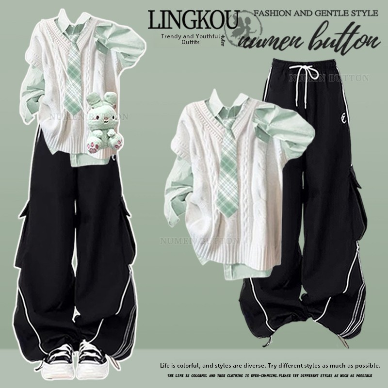 采购产品大码春季和秋季大学风格西装,女性背心,韩国多巴胺衬衫和运动休闲裤三件套 [Original Page Link]