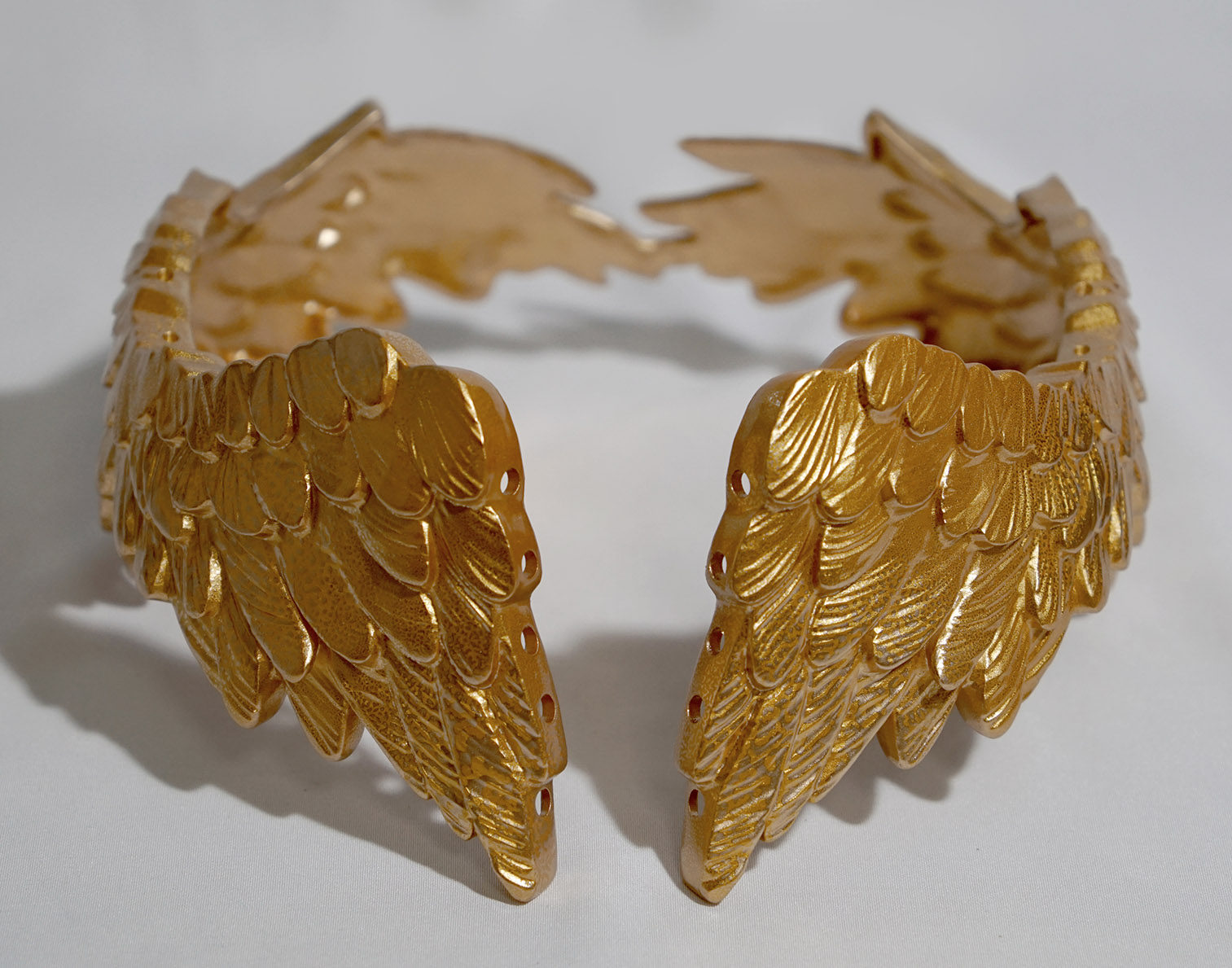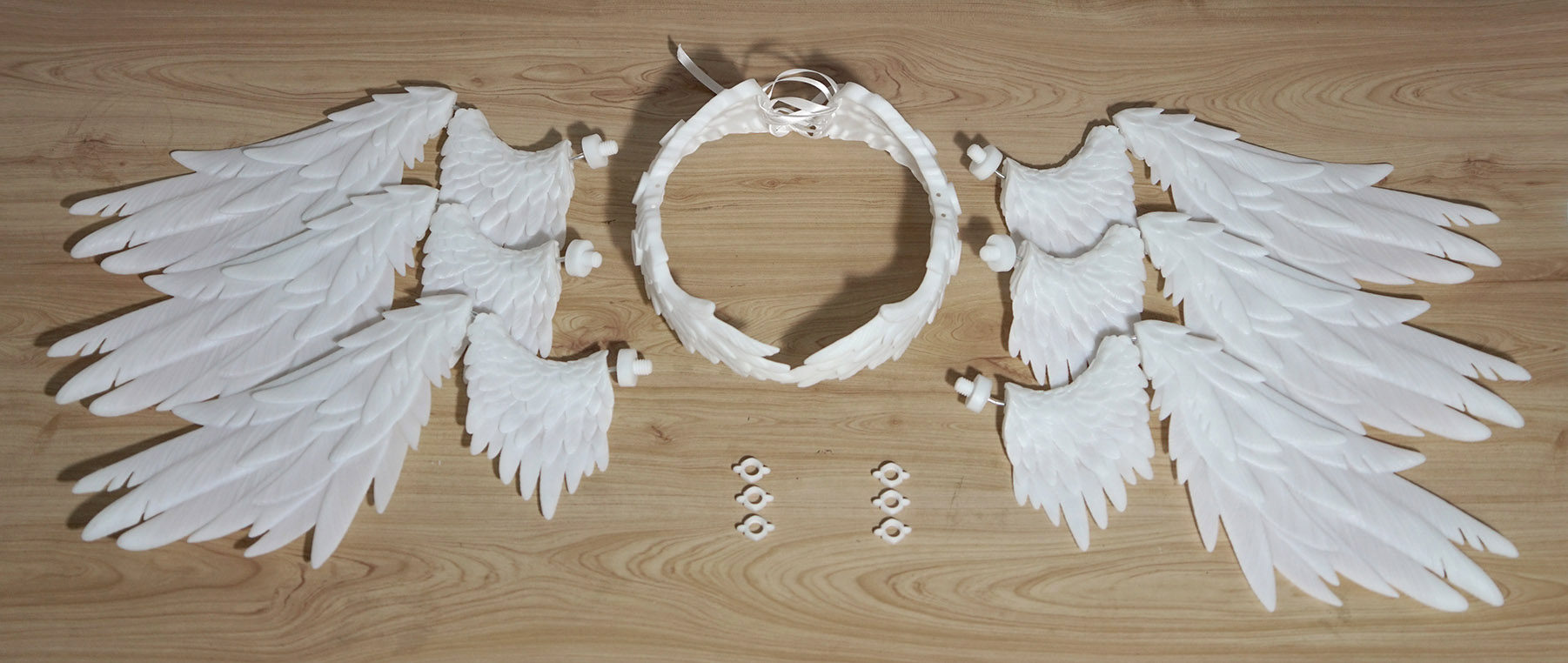 材质:3d打印树脂,喷漆,包胶铁丝等。(六翼白胚搭配耳翼重量为0.6公斤左右,搭配环形头冠为0.65kg左右,加上喷漆可能接近0.7kg左右。)