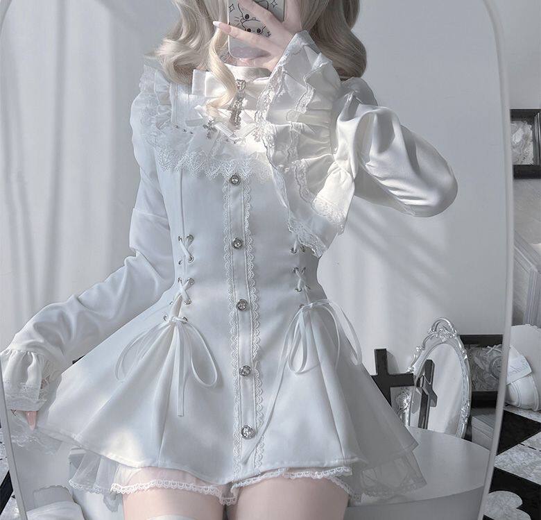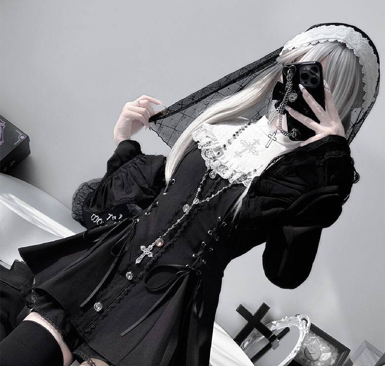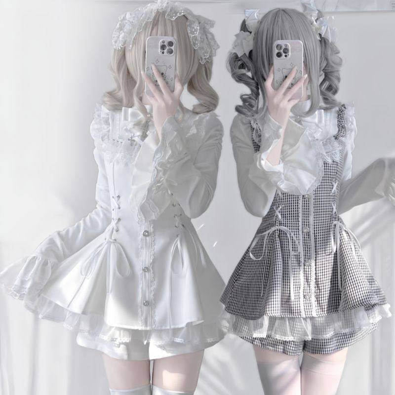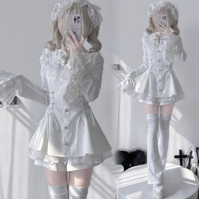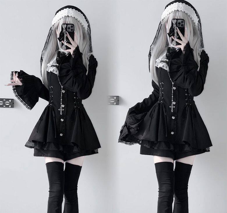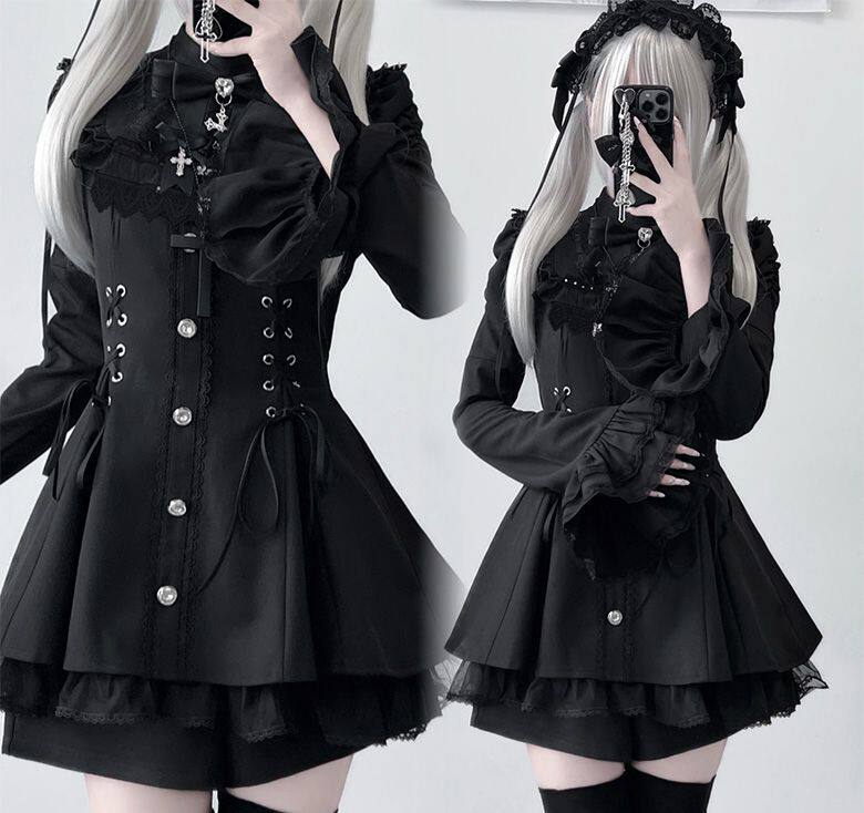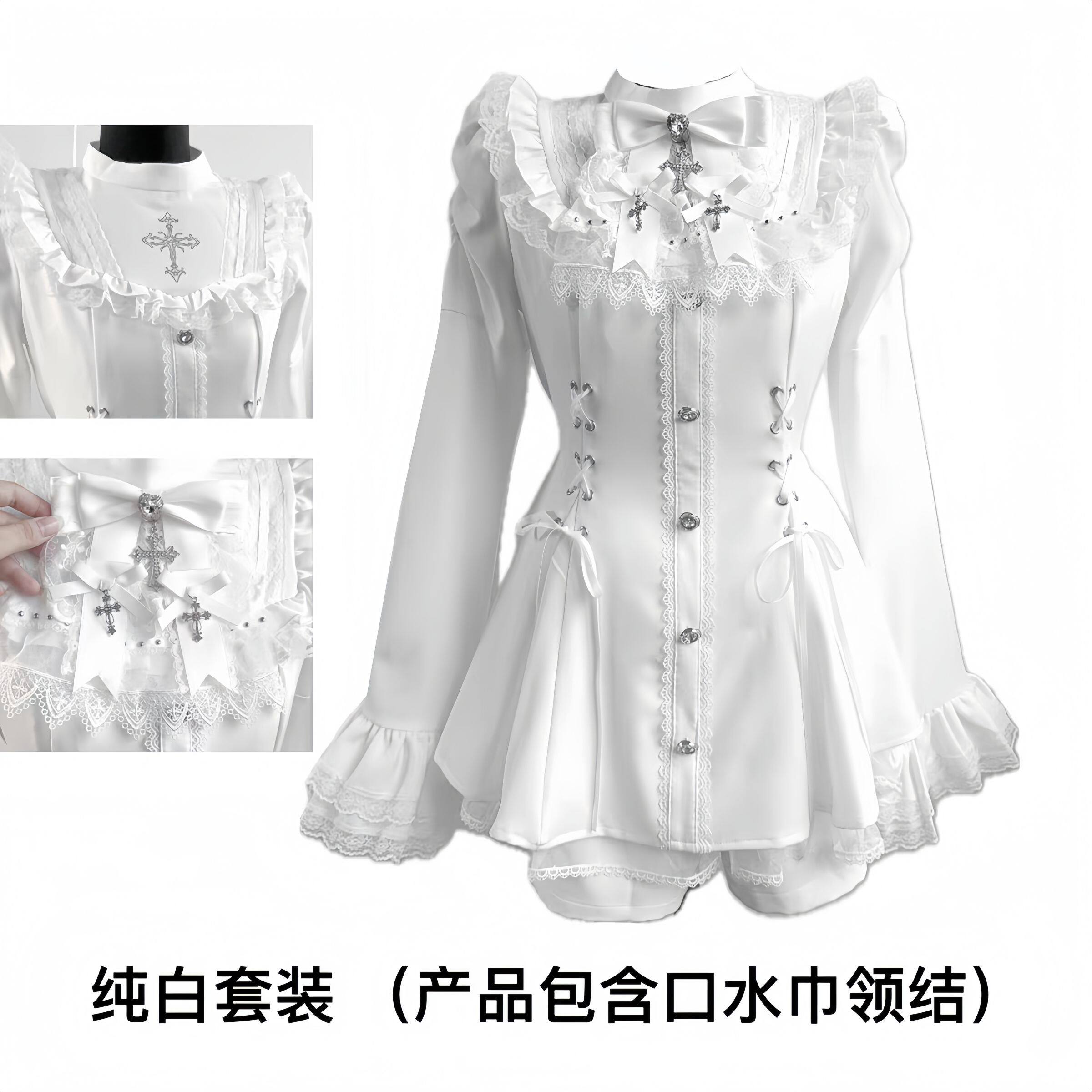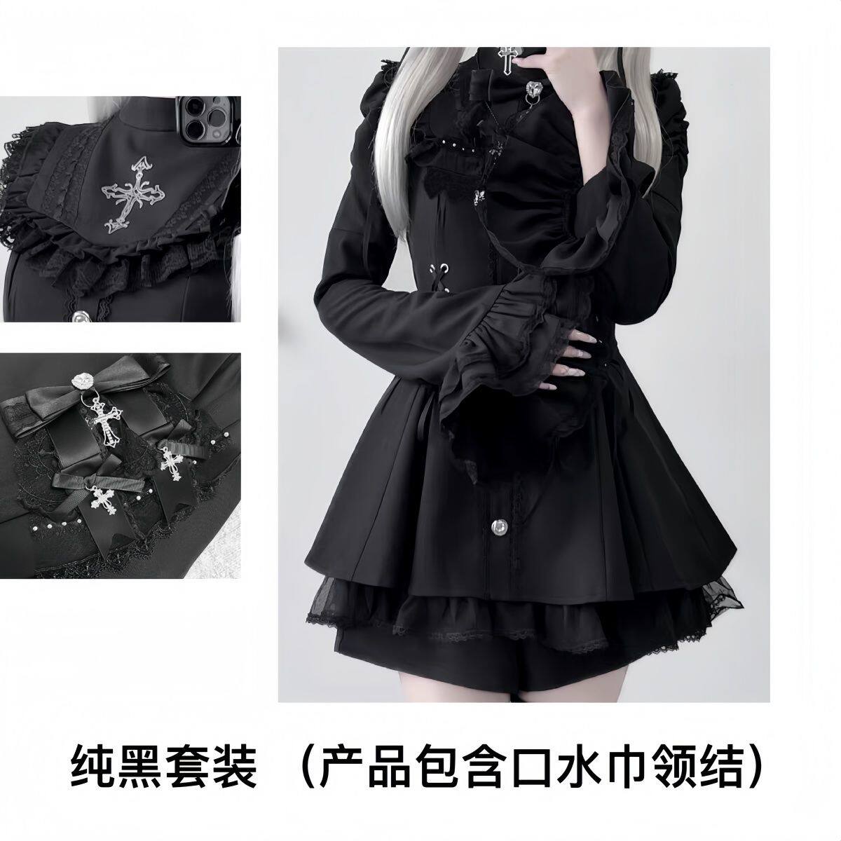 甜心邂逅蕾蕾少女黑白量产型喇叭袖蕾丝口水巾收腰长袖连衣裙套装 [Original Page Link]
