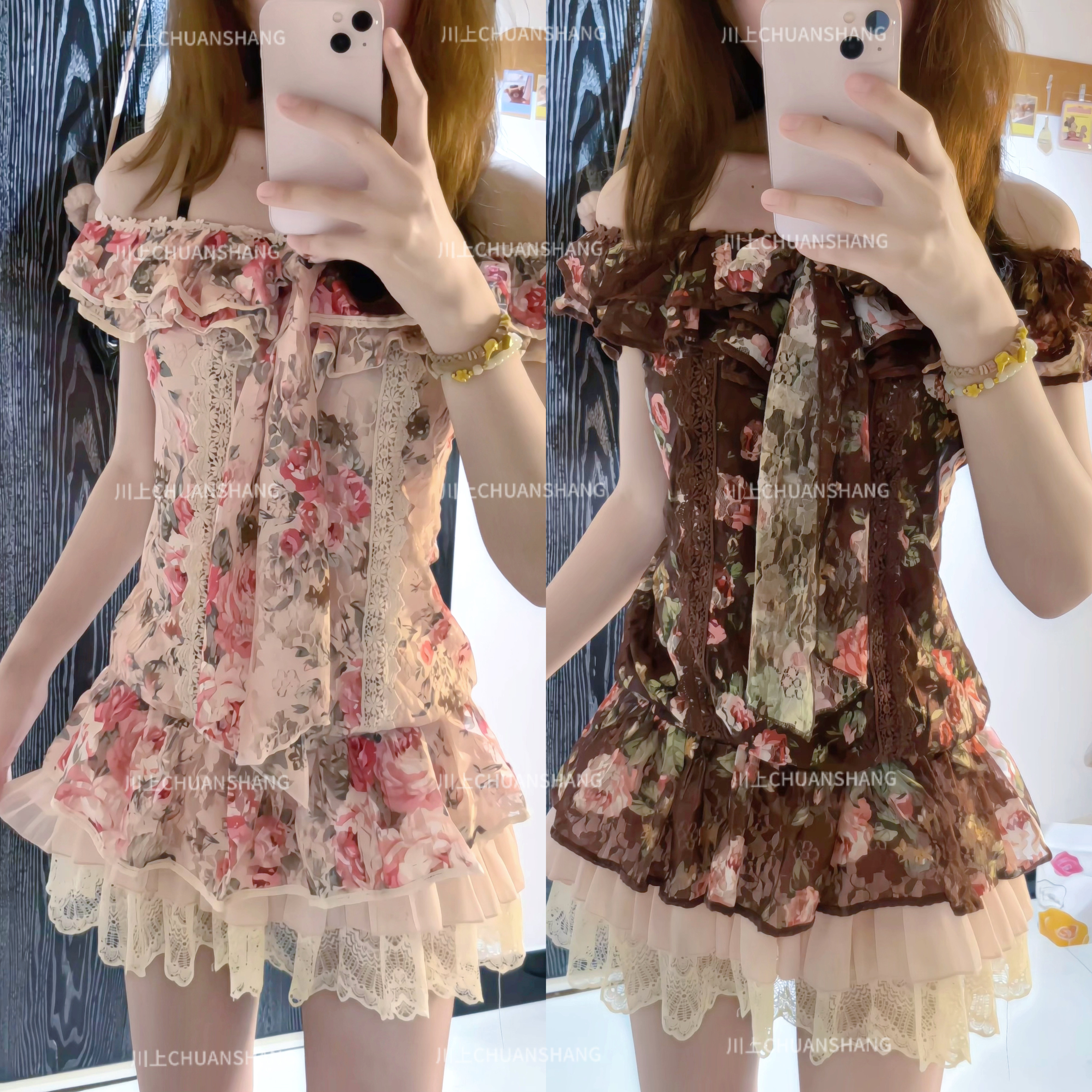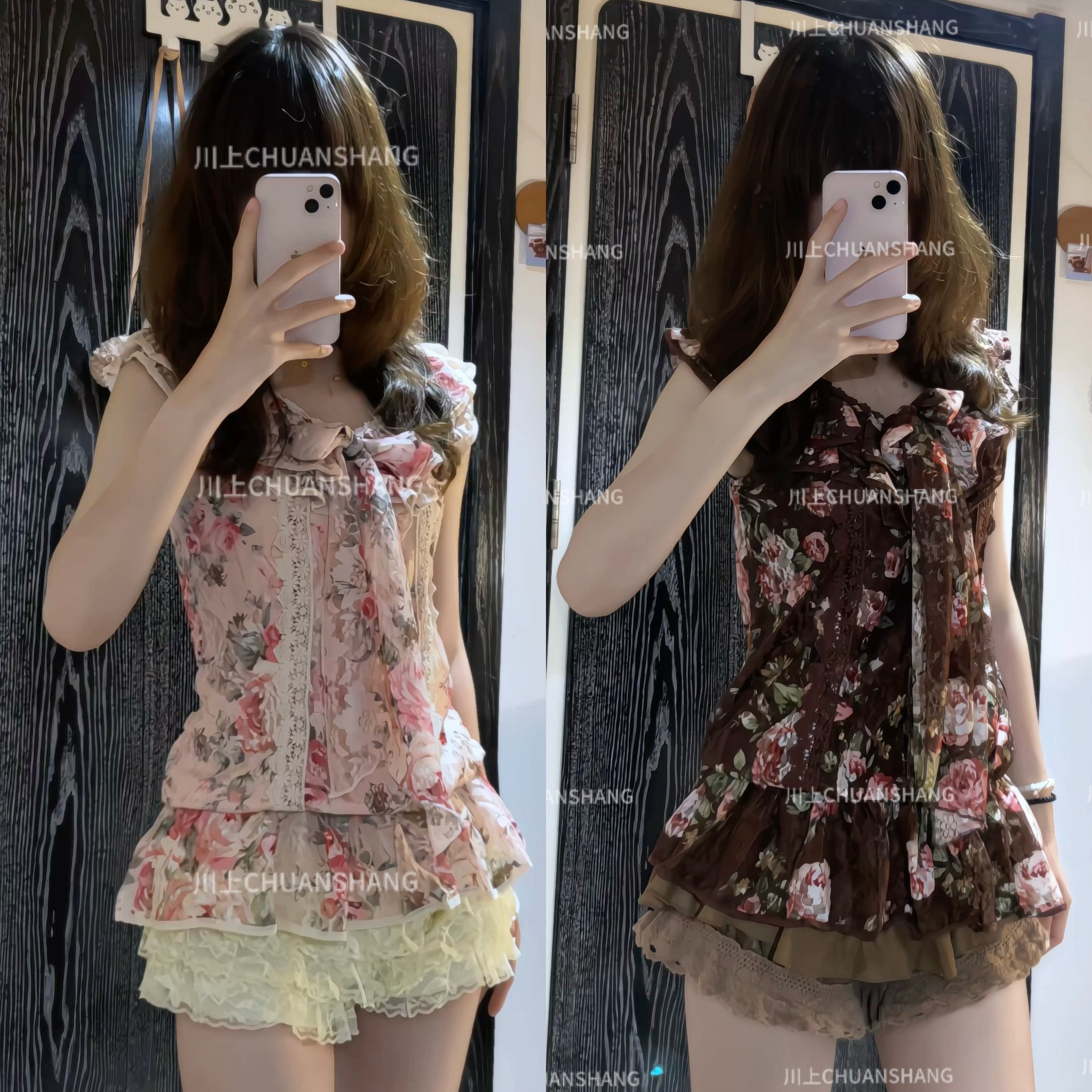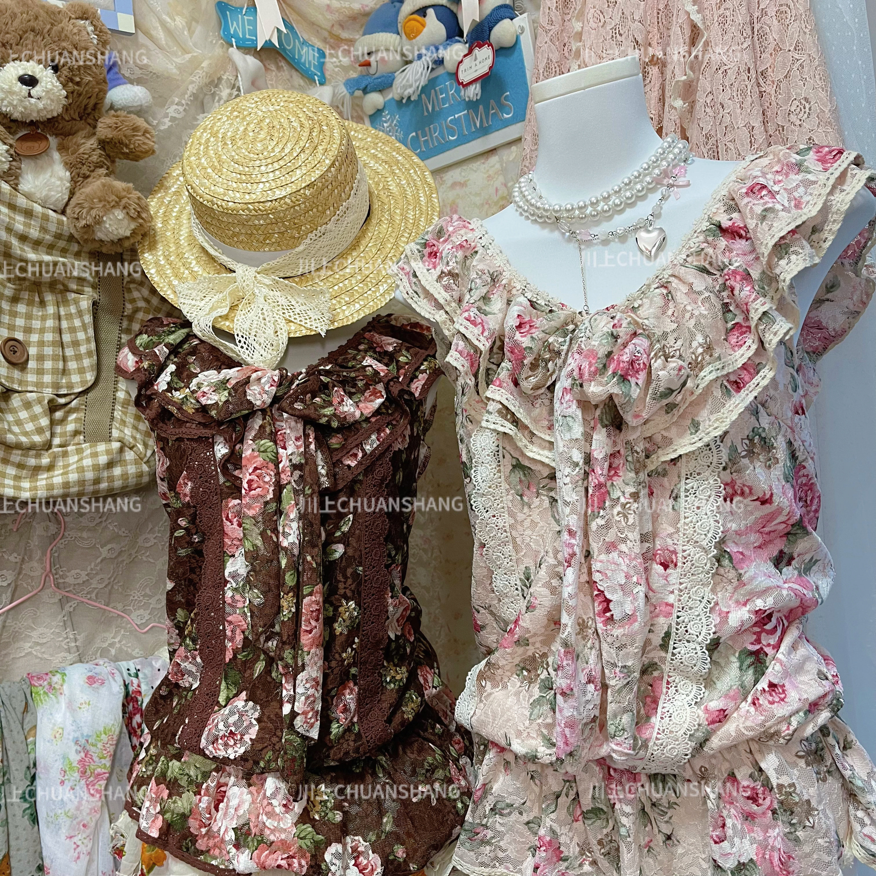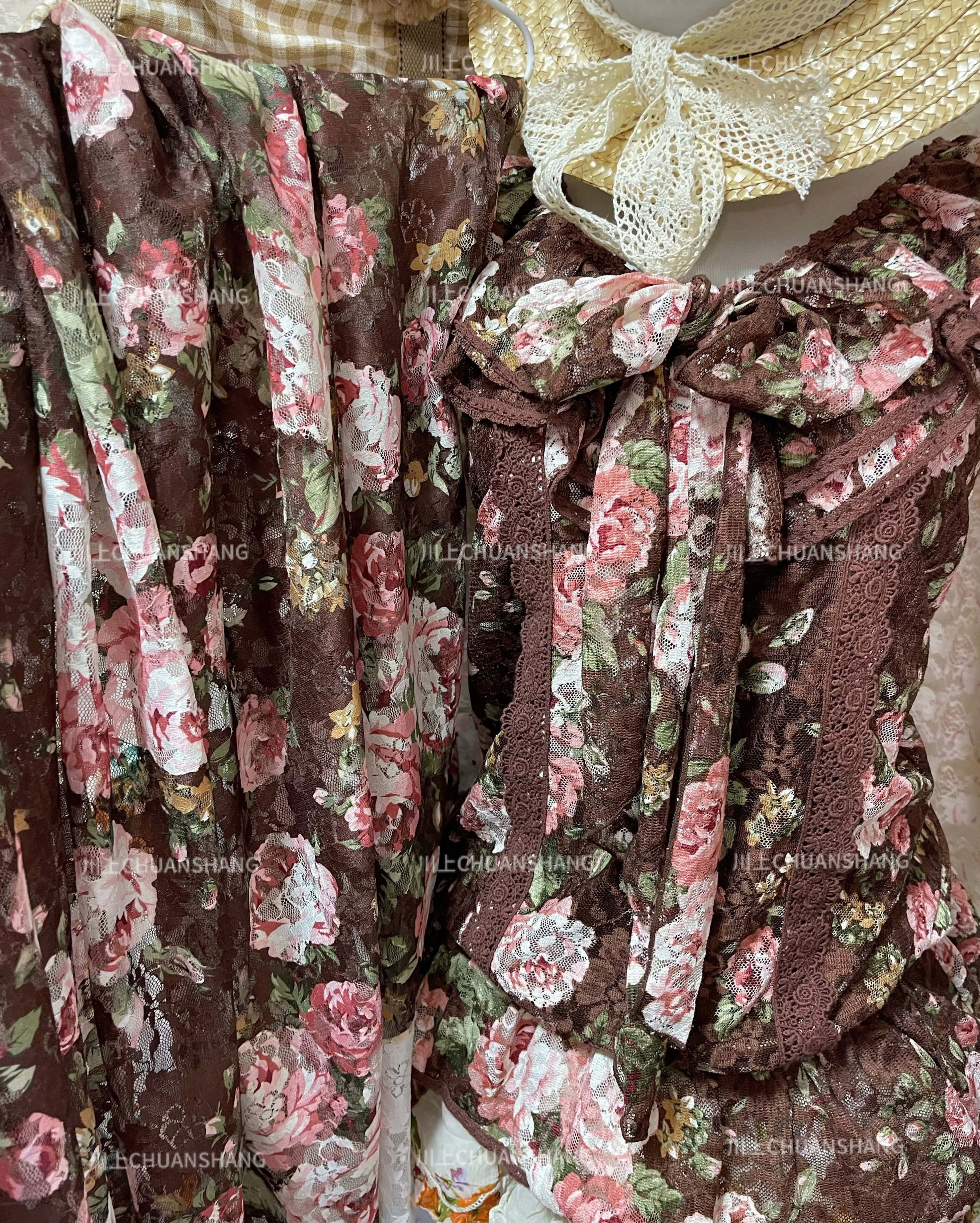 川上 棕色粉色蕾丝碎花无袖上衣百搭款 [Original Page Link]