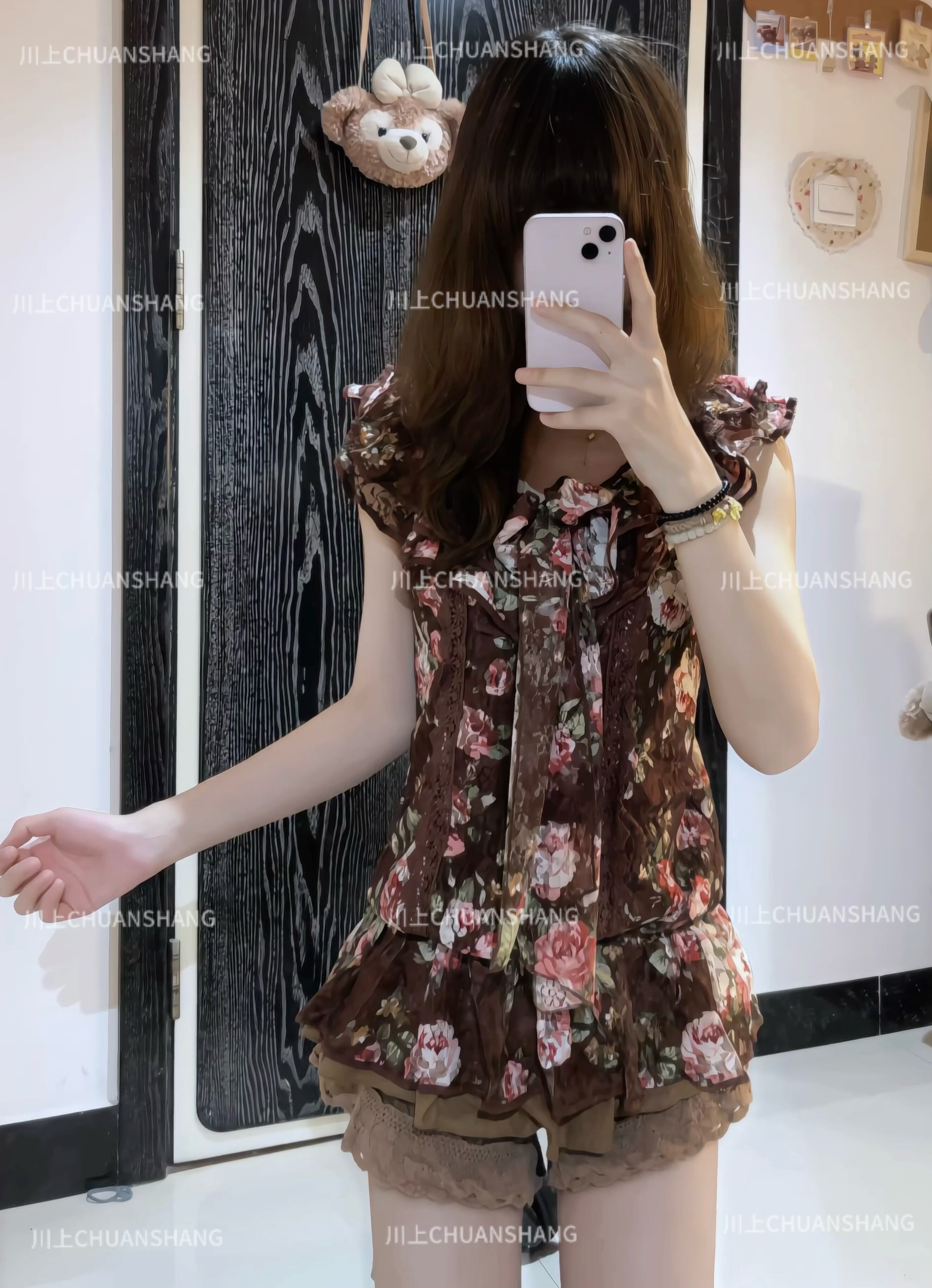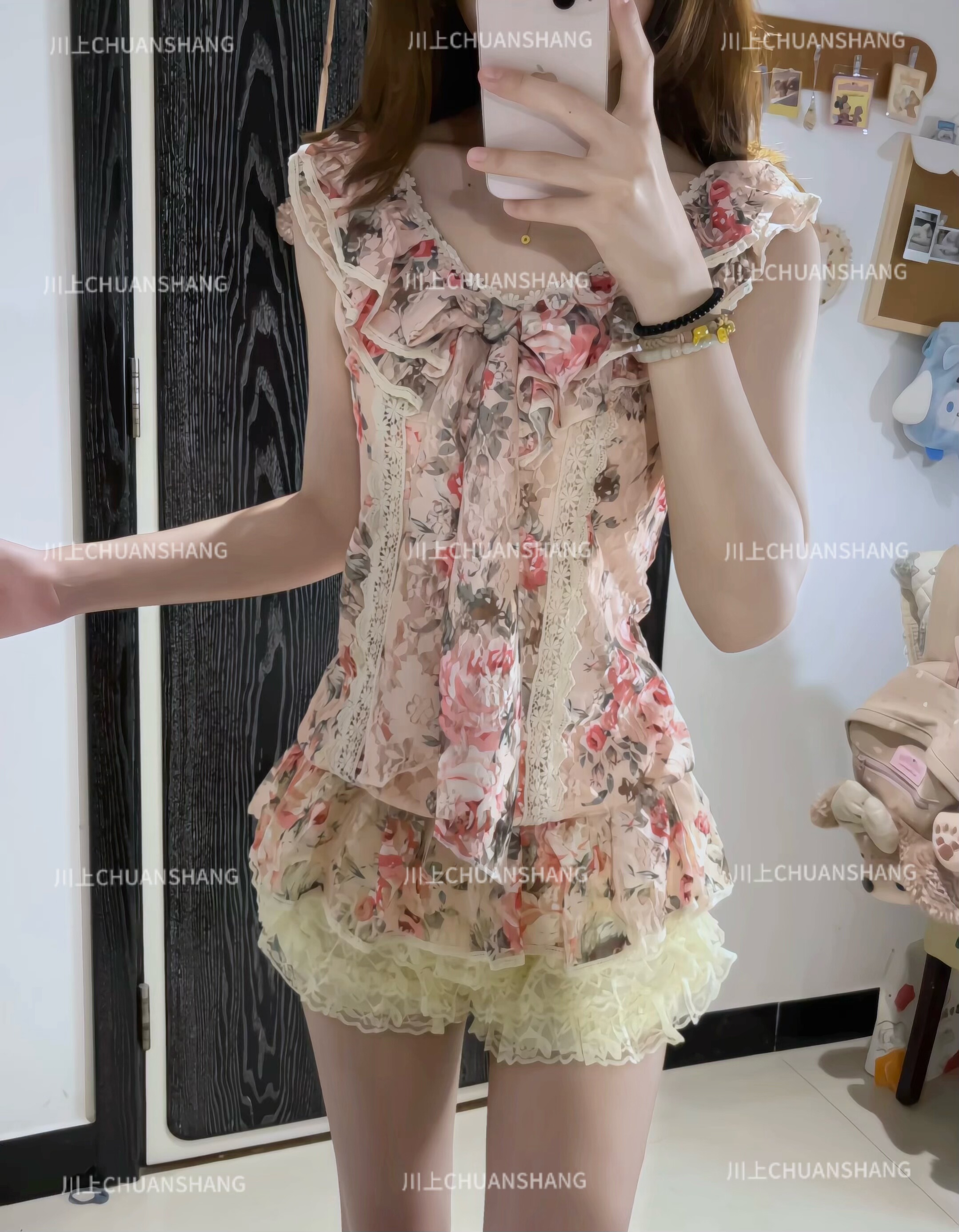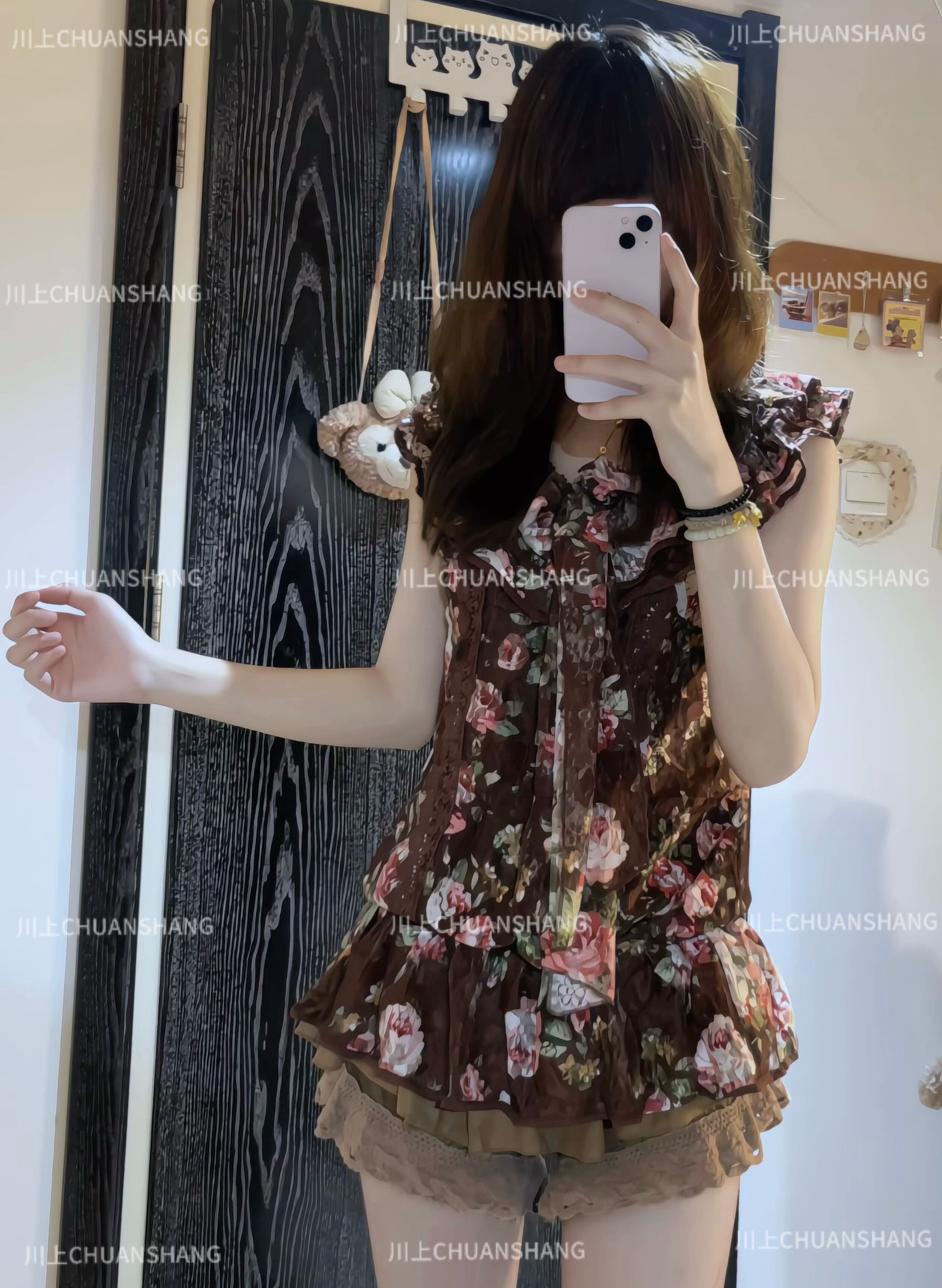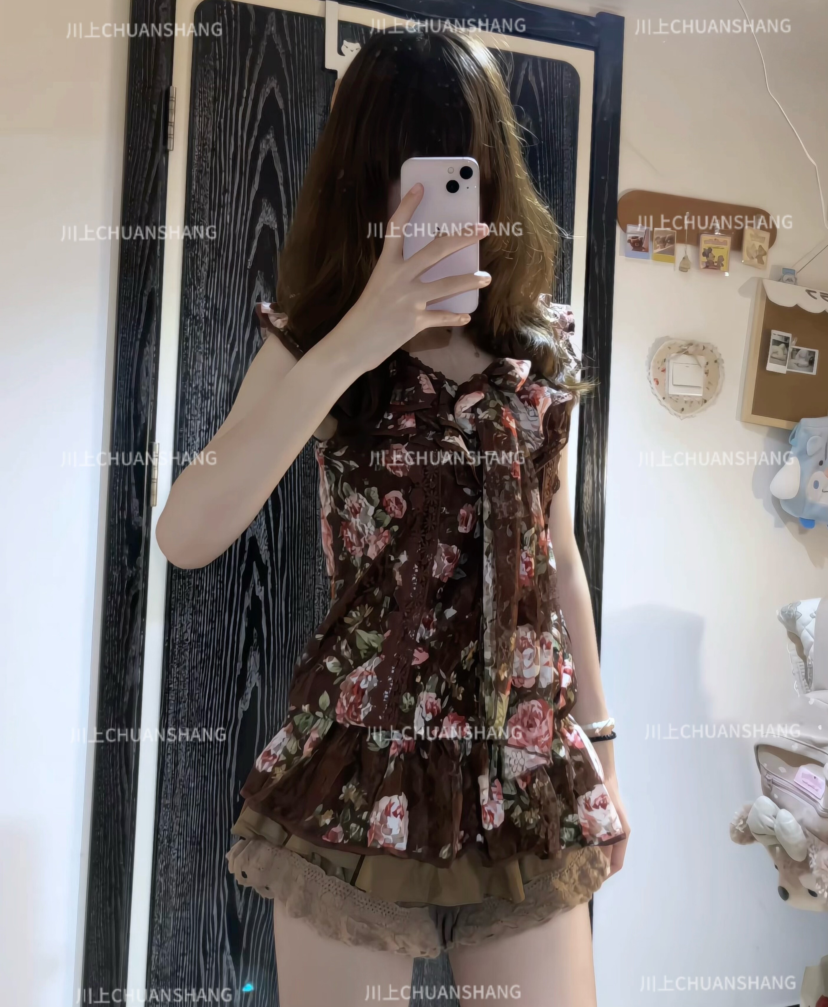 川上 棕色粉色蕾丝碎花无袖上衣百搭款 [Original Page Link]