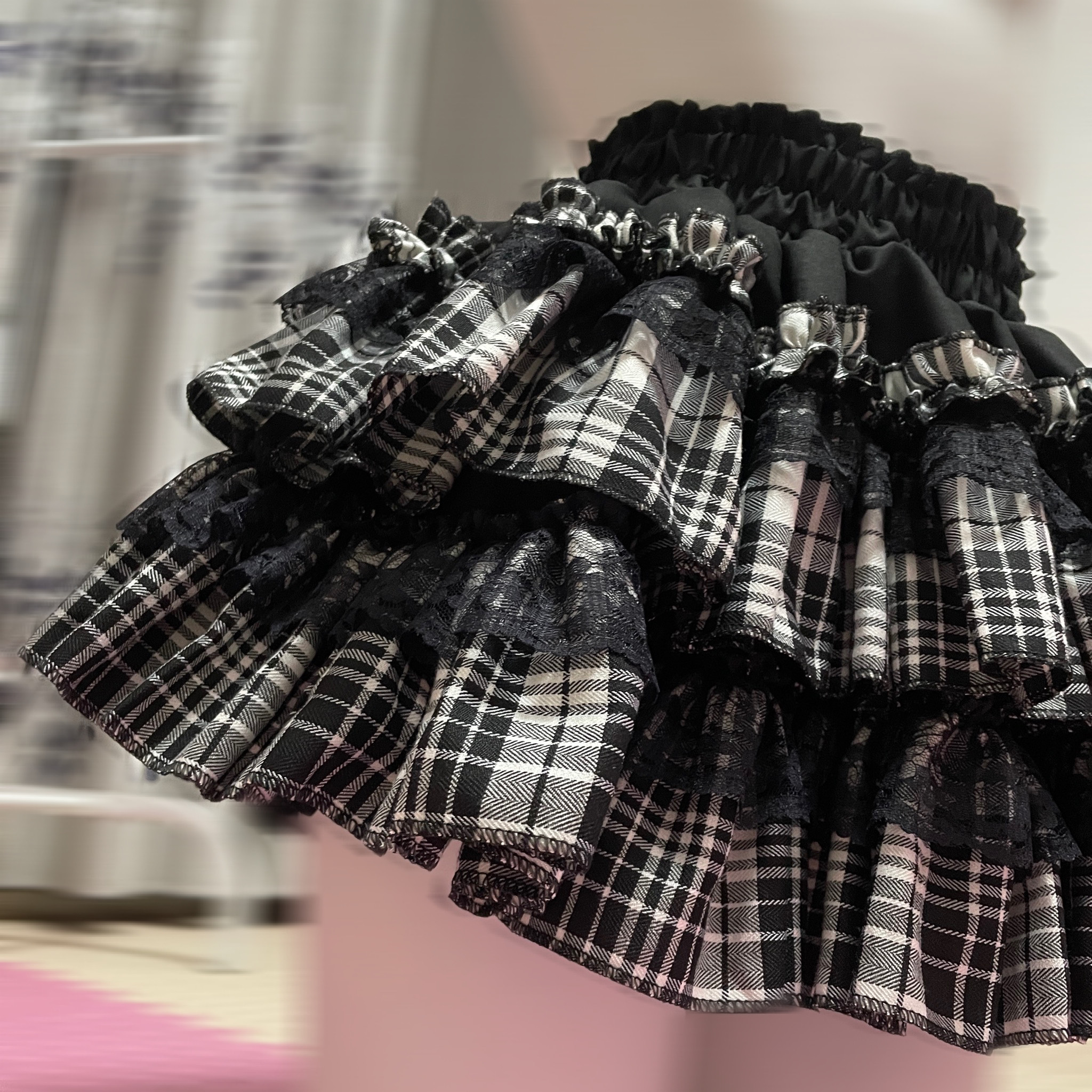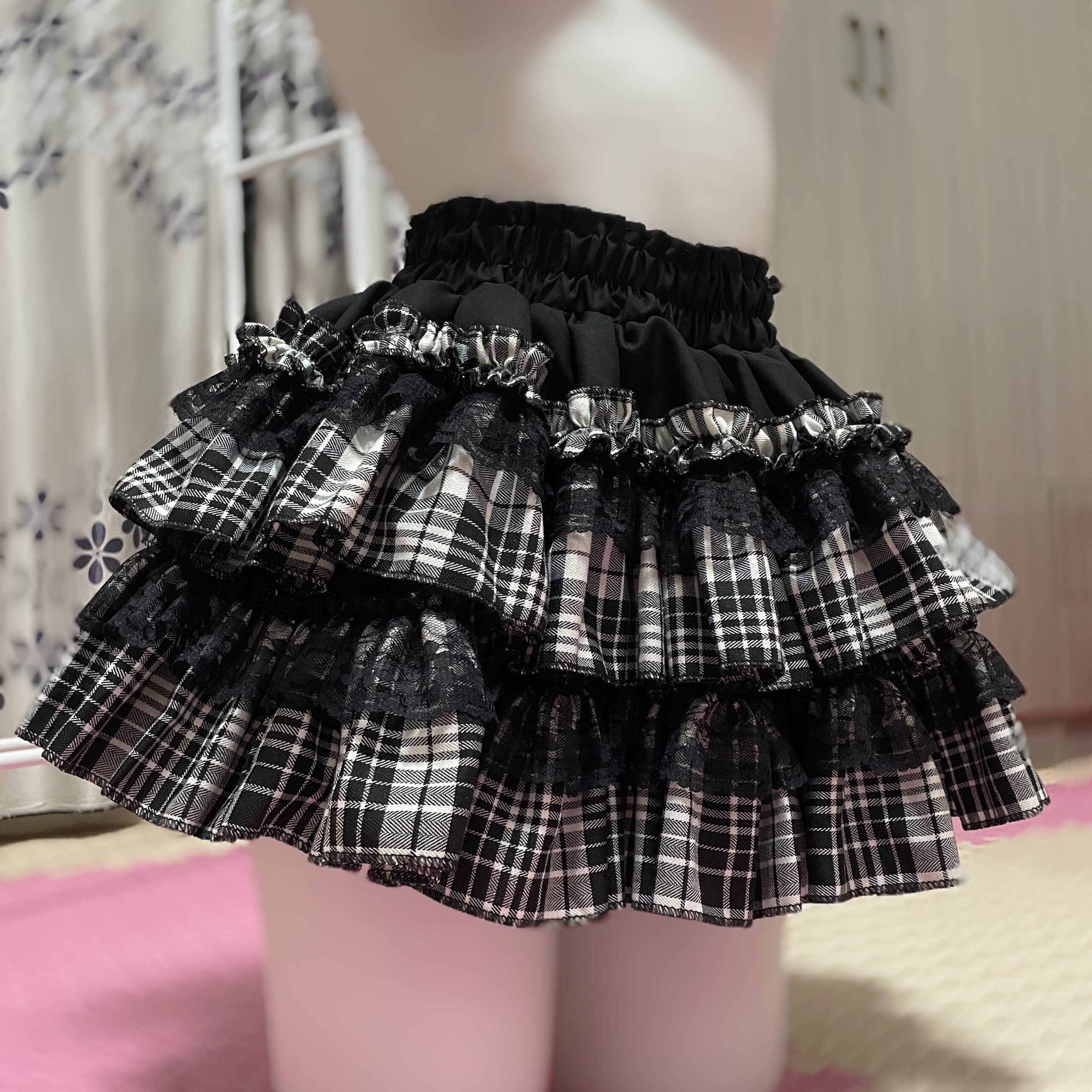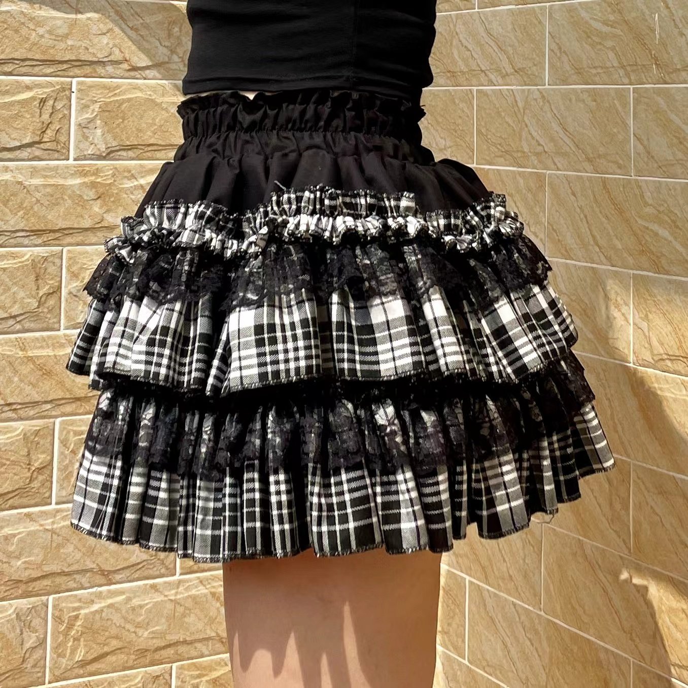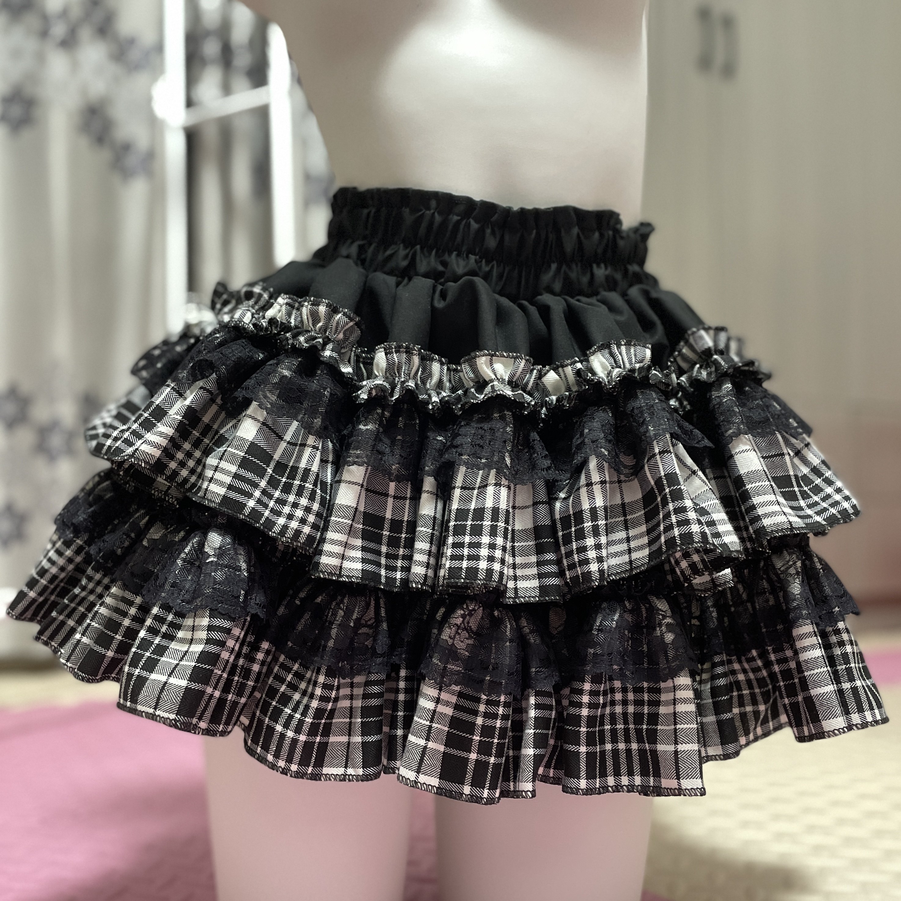 予乐自制丨亚比辣妹哥特风蕾丝木耳边黑白格半身裙短裙蛋糕蓬蓬裙 [Original Page Link]
