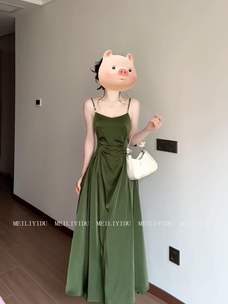 Mlyd/定制大尺寸法国高端绿色缎面吊带连衣裙褶皱优雅的腰部长裙 [Original Page Link]