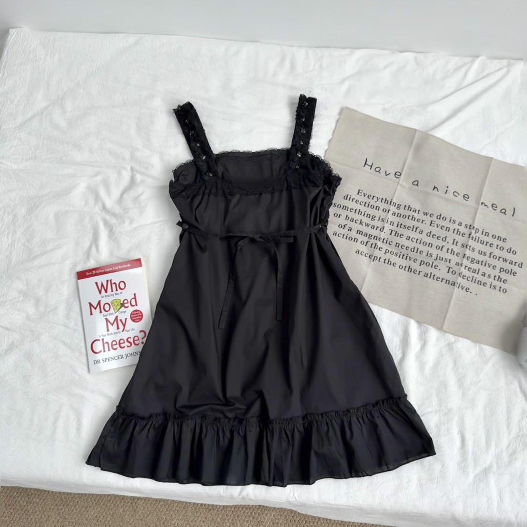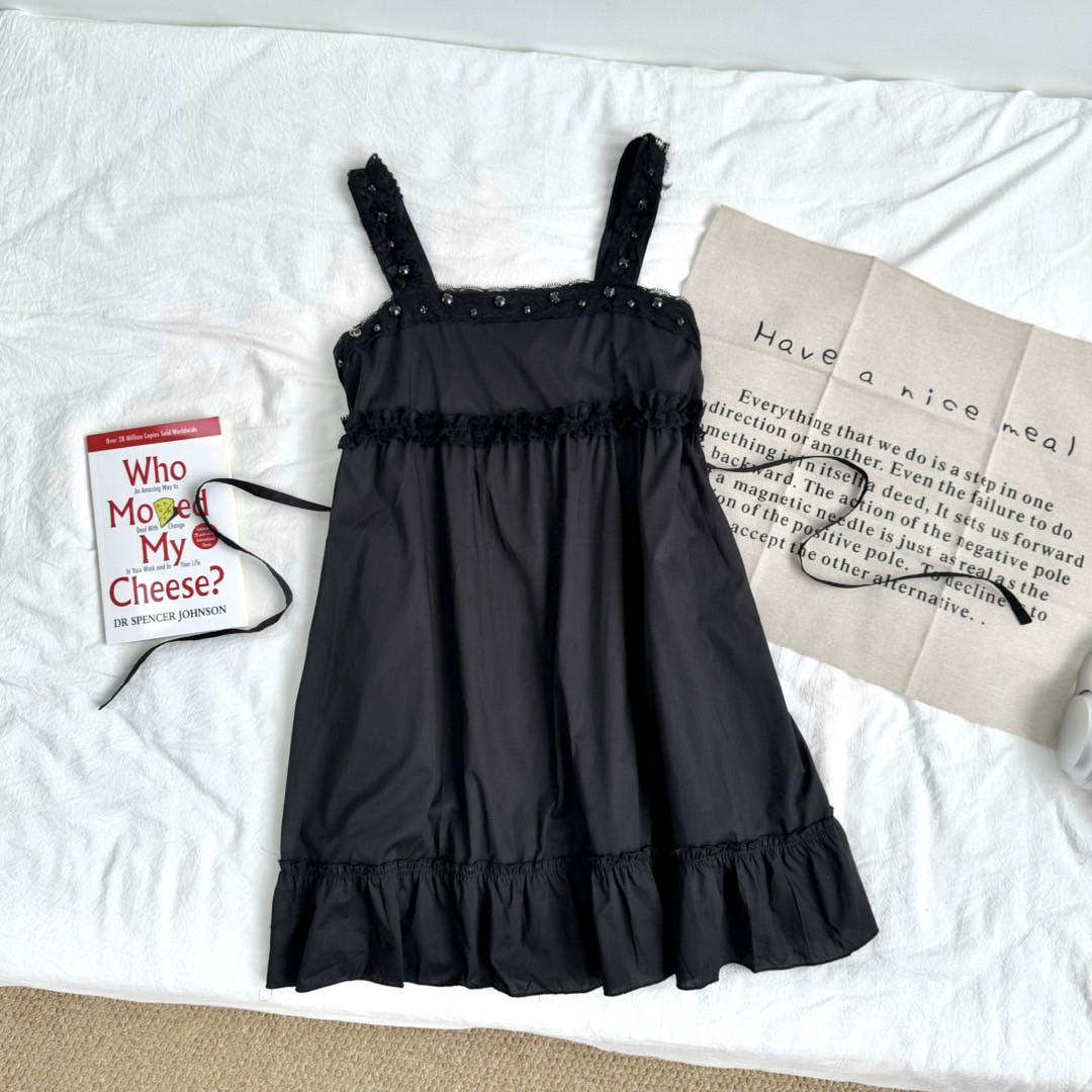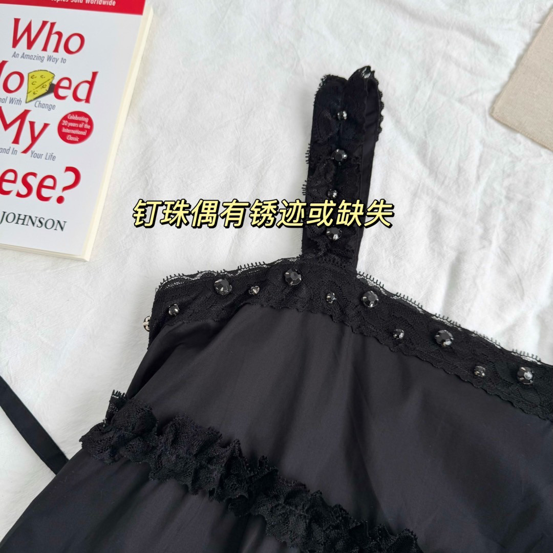 6895# Dark Lolita Style Lace Beaded Retro Elegant Dark Ruffle Wide Strap Dress