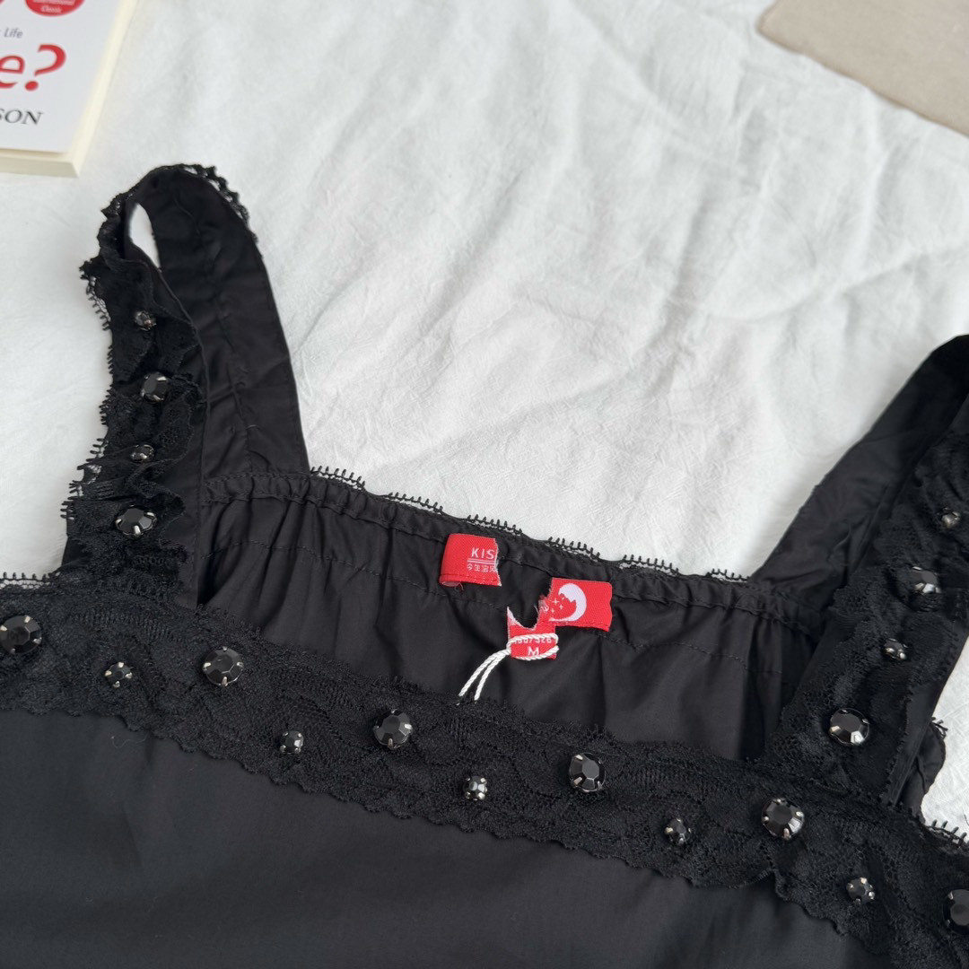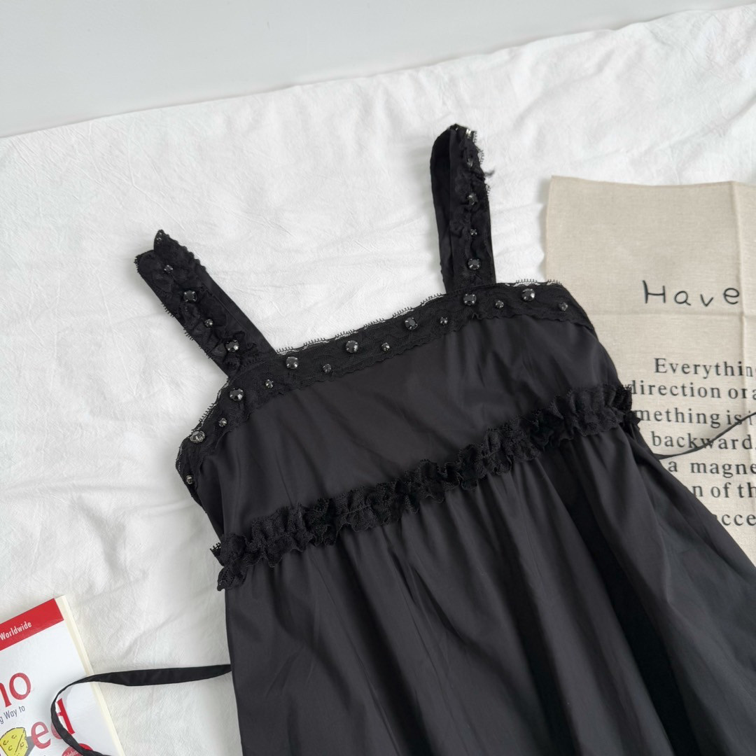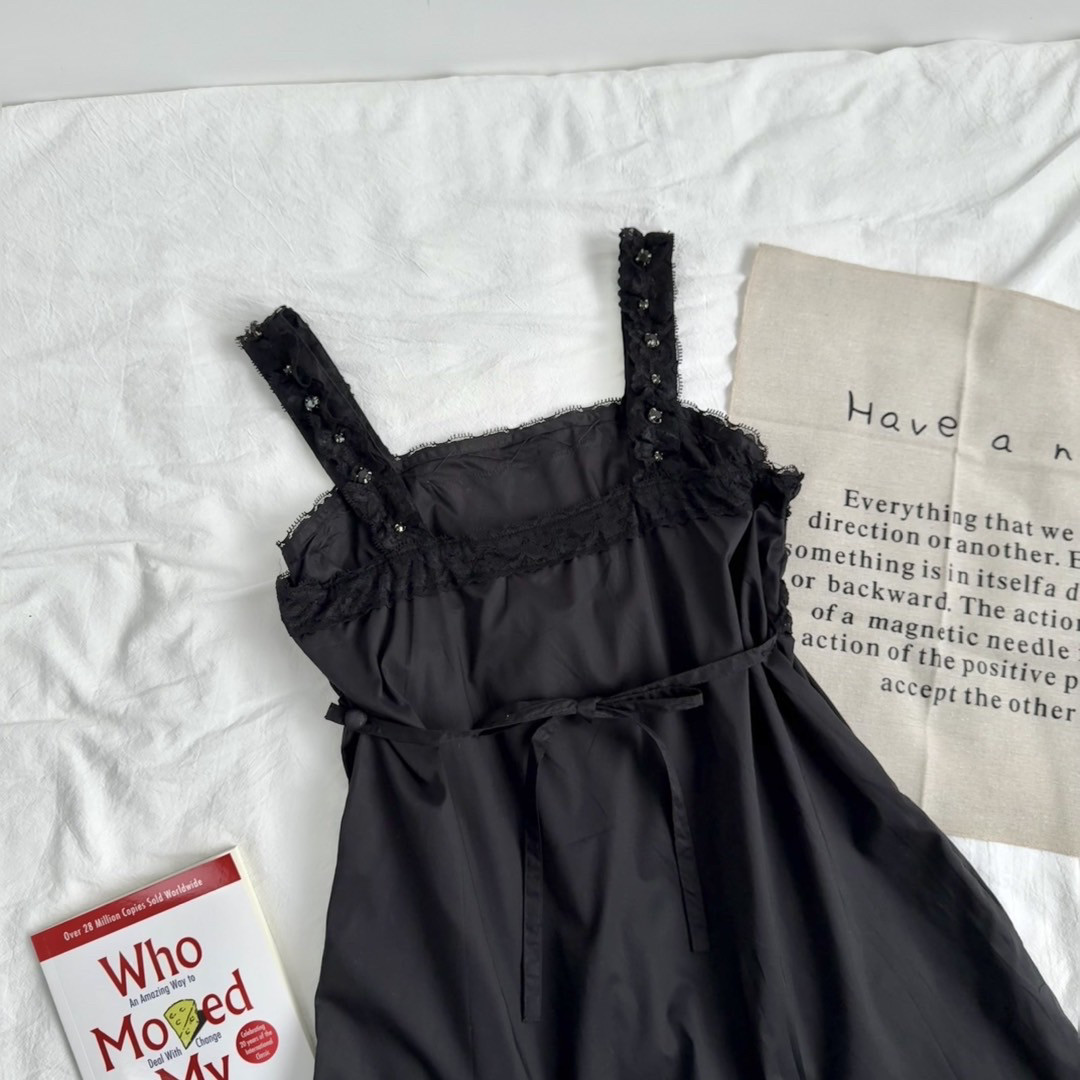 6895# Dark Lolita Style Lace Beaded Retro Elegant Dark Ruffle Wide Strap Dress