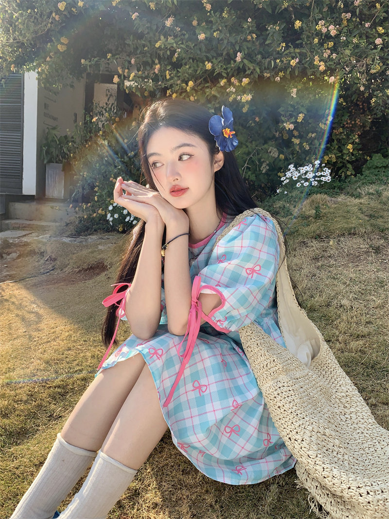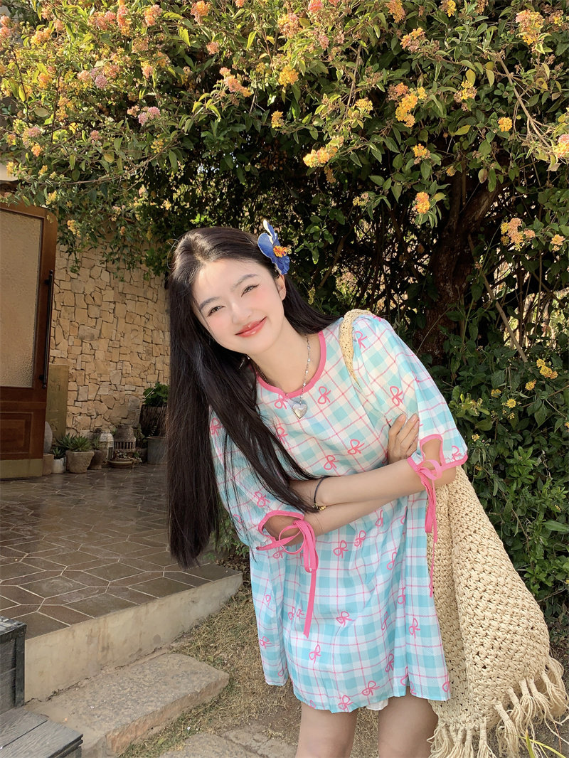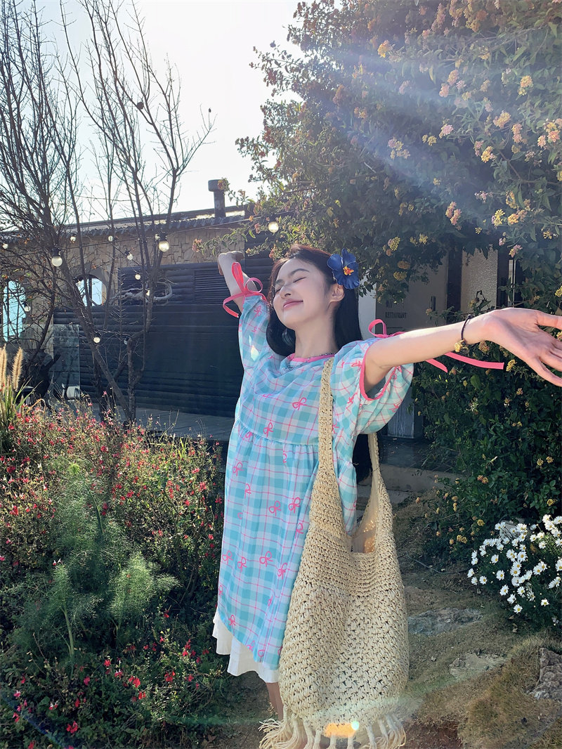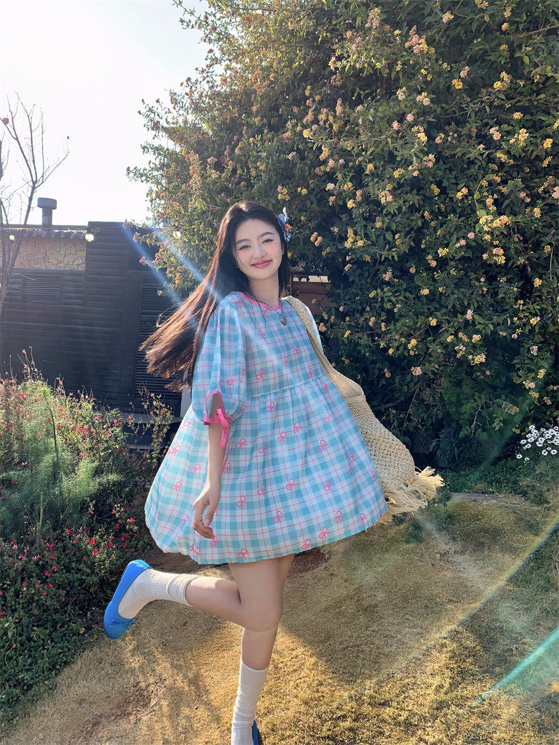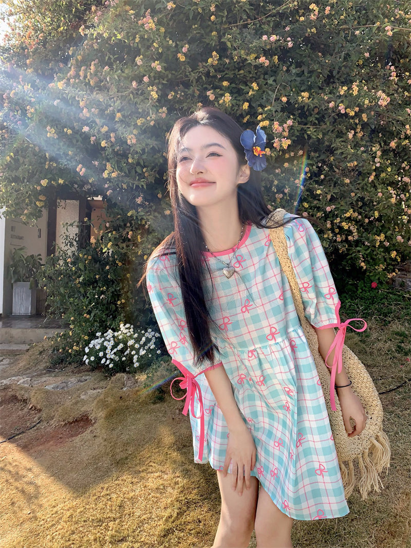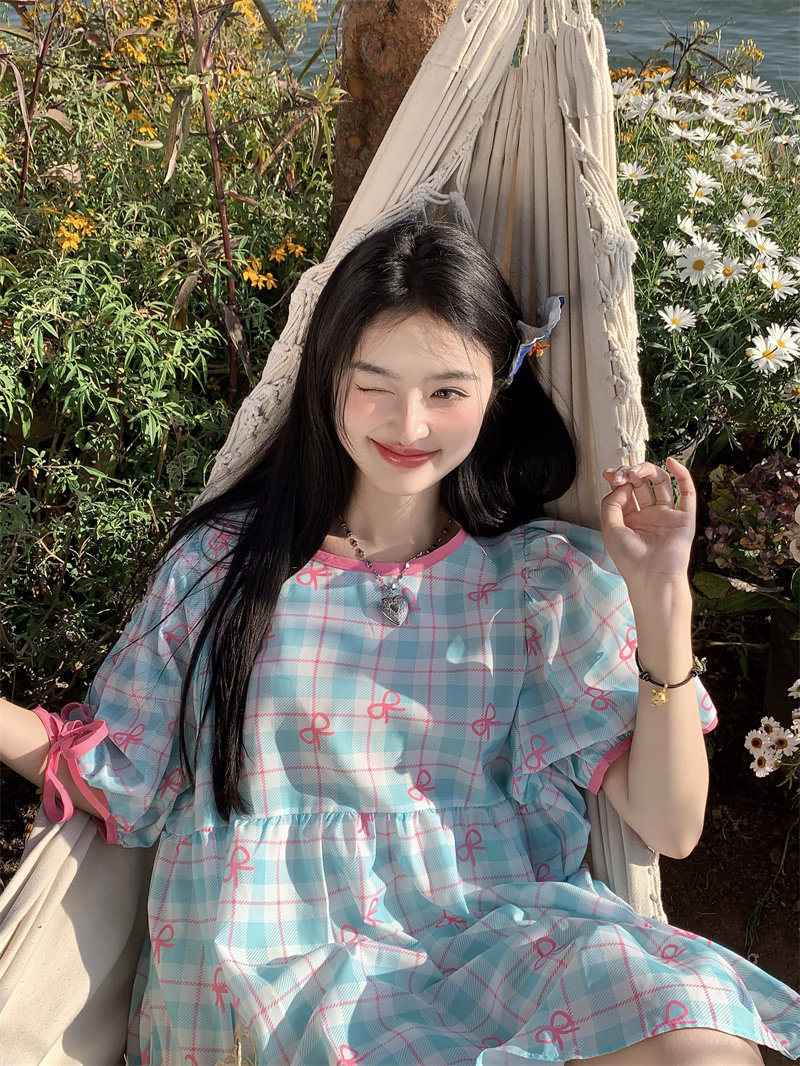 Plus-size women's Korean sweet school style color-blocked bow plaid print tie-waist short-sleeved dress for chubby girls