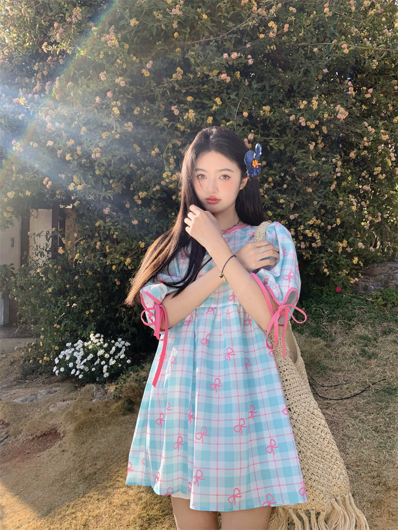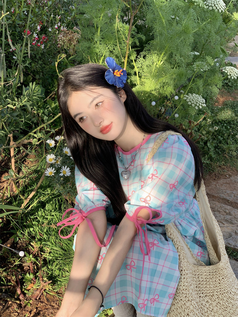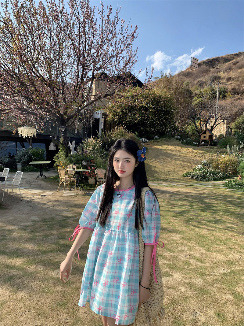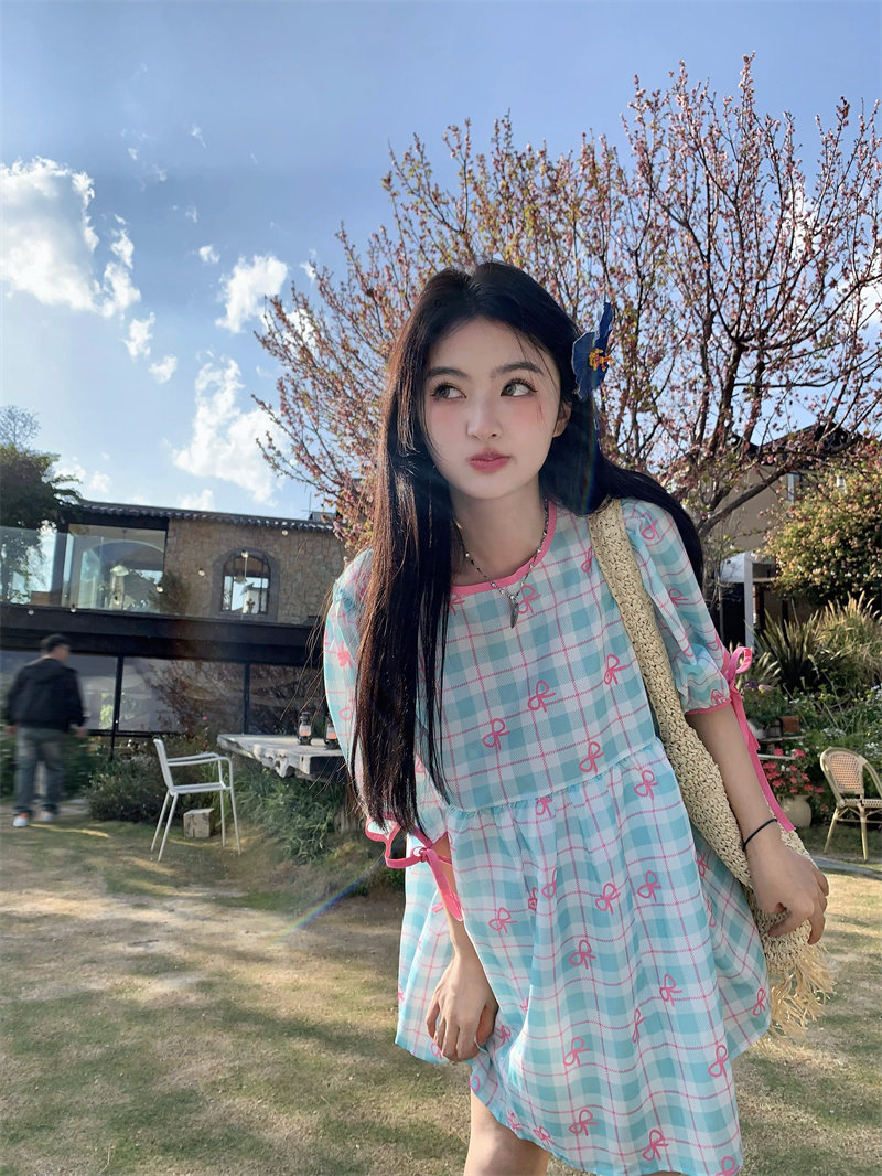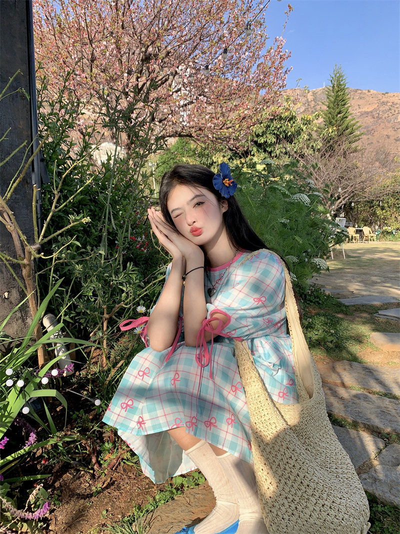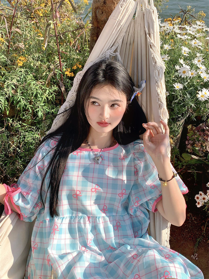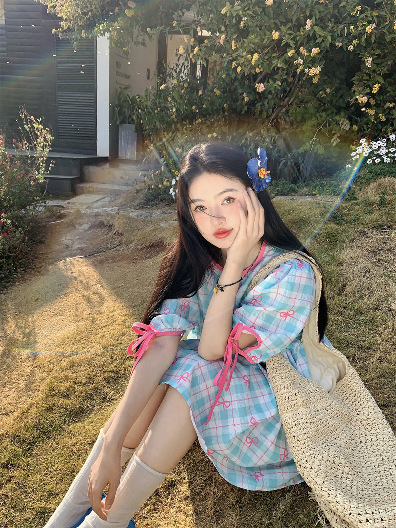 Plus-size women's Korean sweet school style color-blocked bow plaid print tie-waist short-sleeved dress for chubby girls