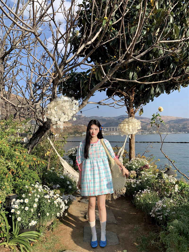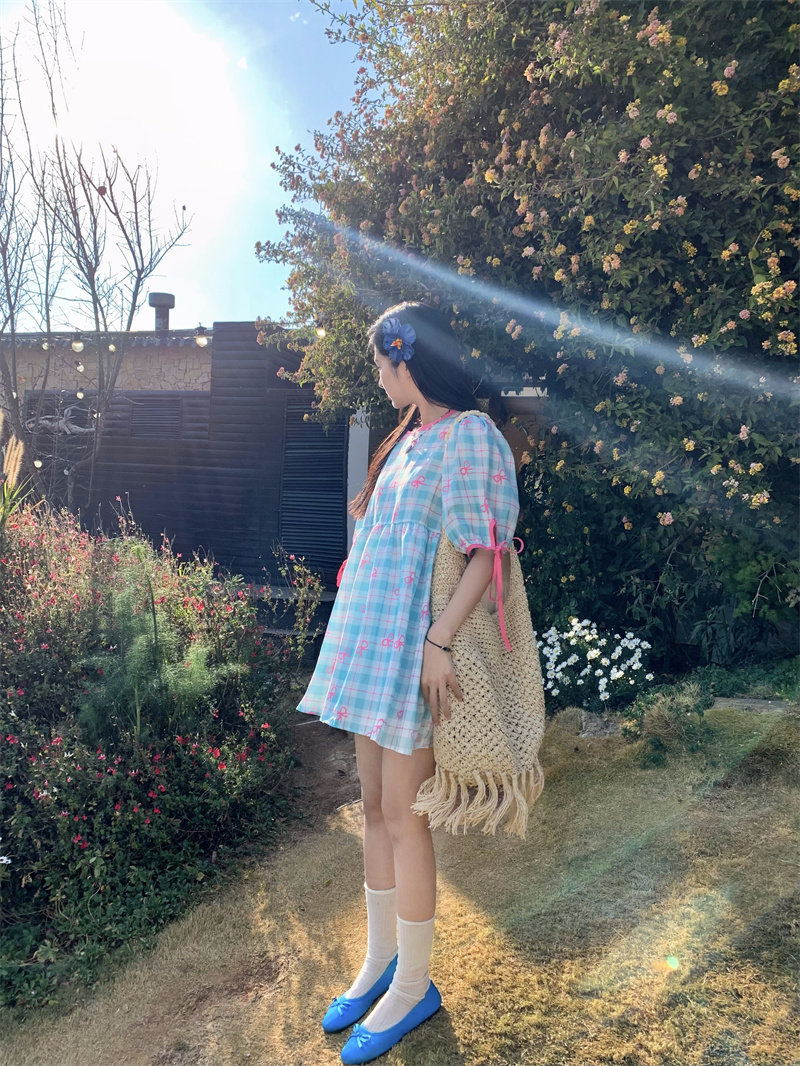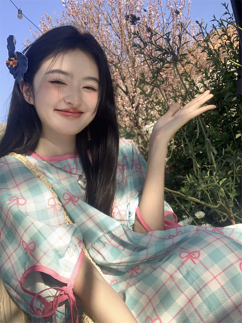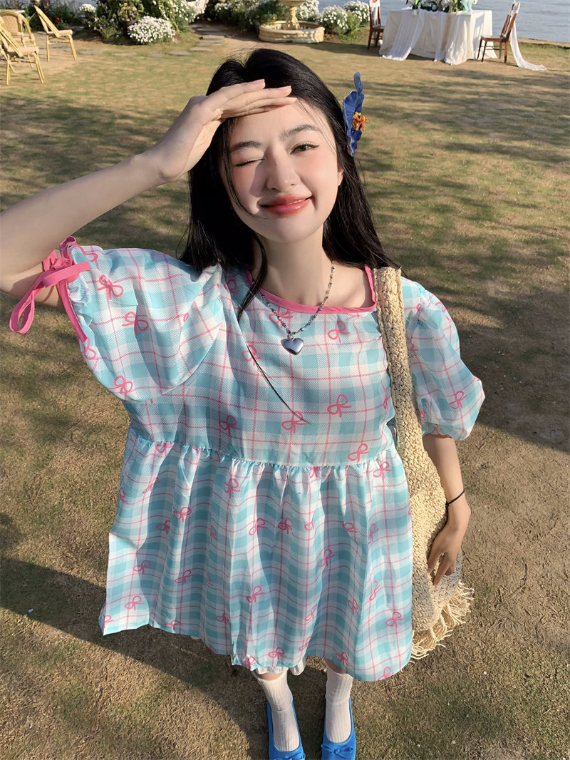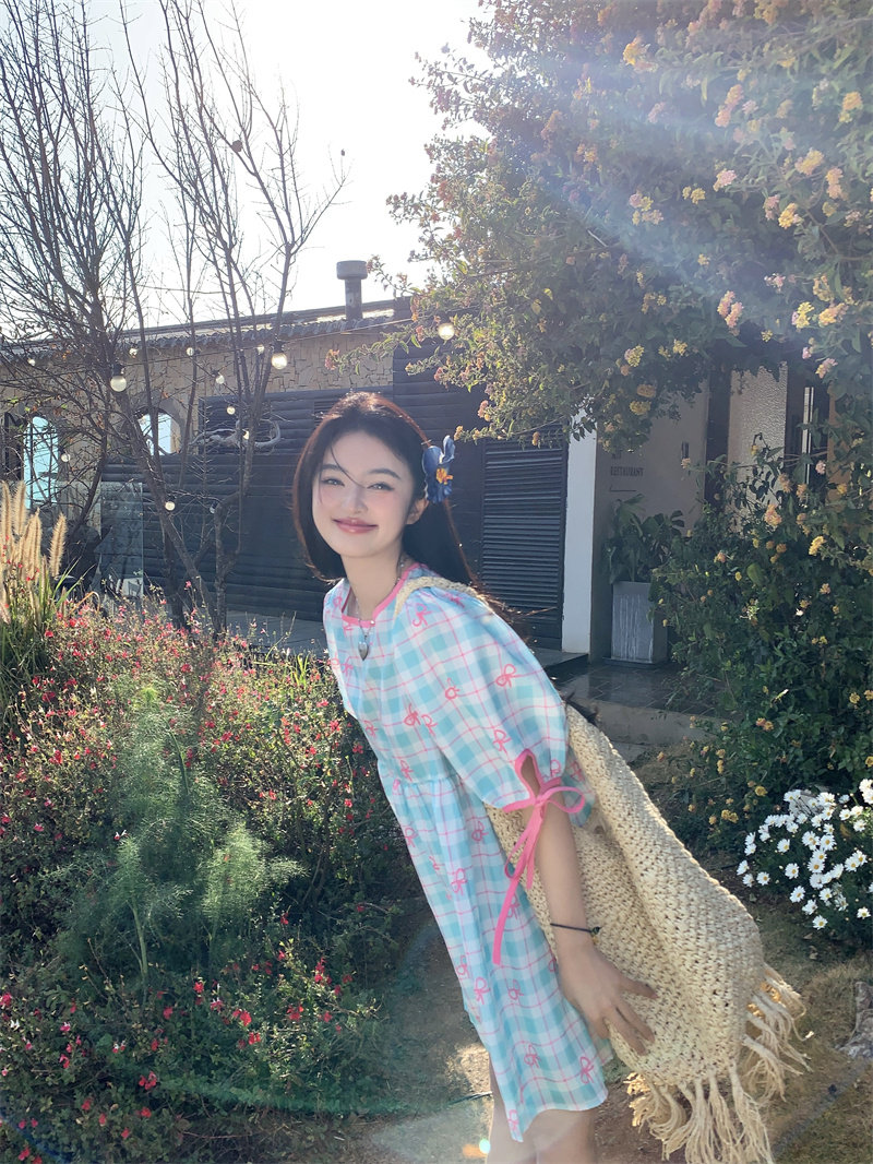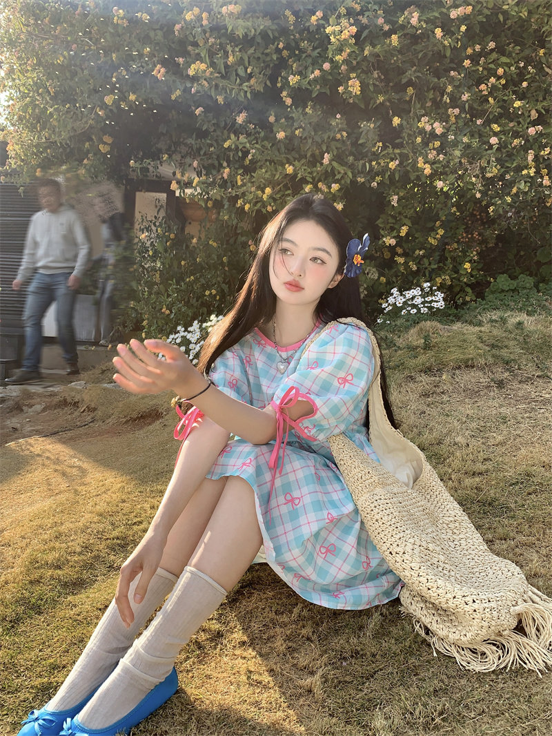 Plus-size women's Korean sweet school style color-blocked bow plaid print tie-waist short-sleeved dress for chubby girls