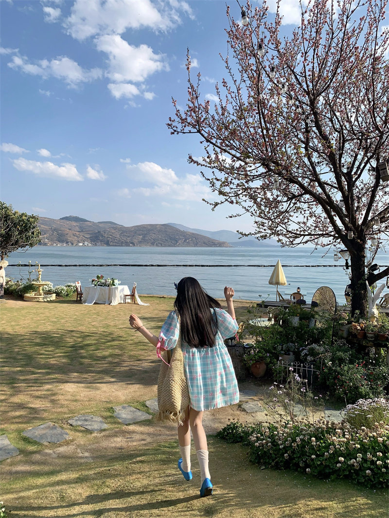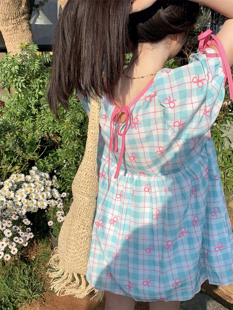 大尺码女装胖mm韩系甜美学院风撞色蝴蝶结格子印花系带短袖洋装女 [Original Page Link]