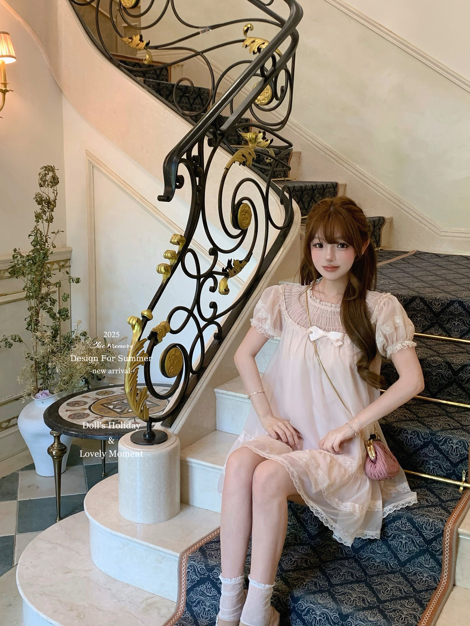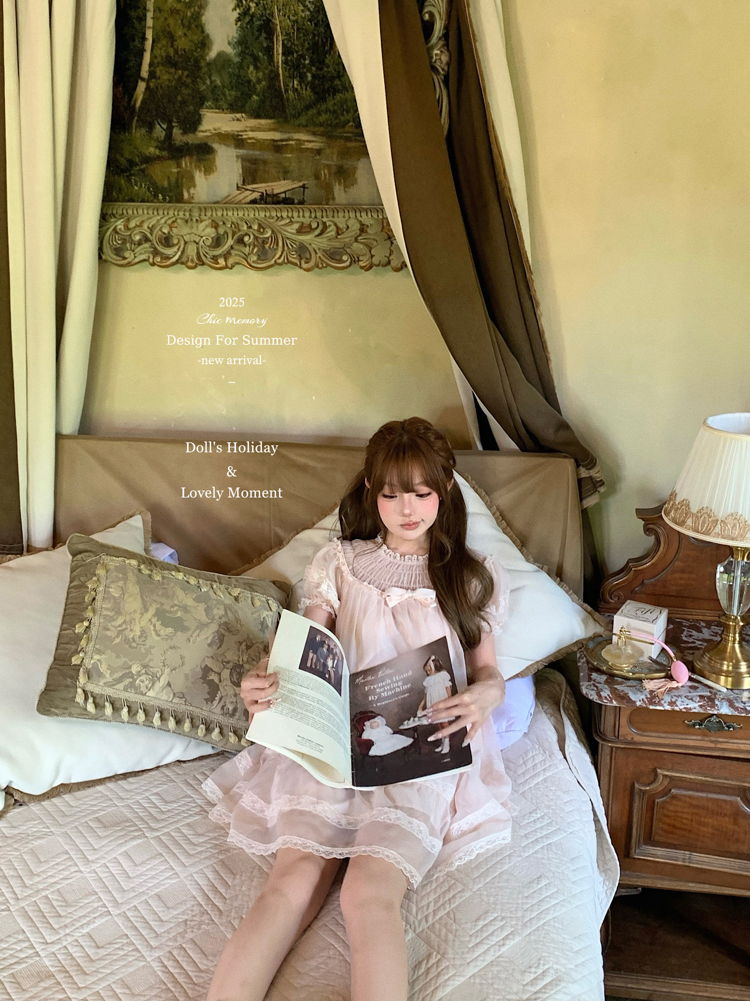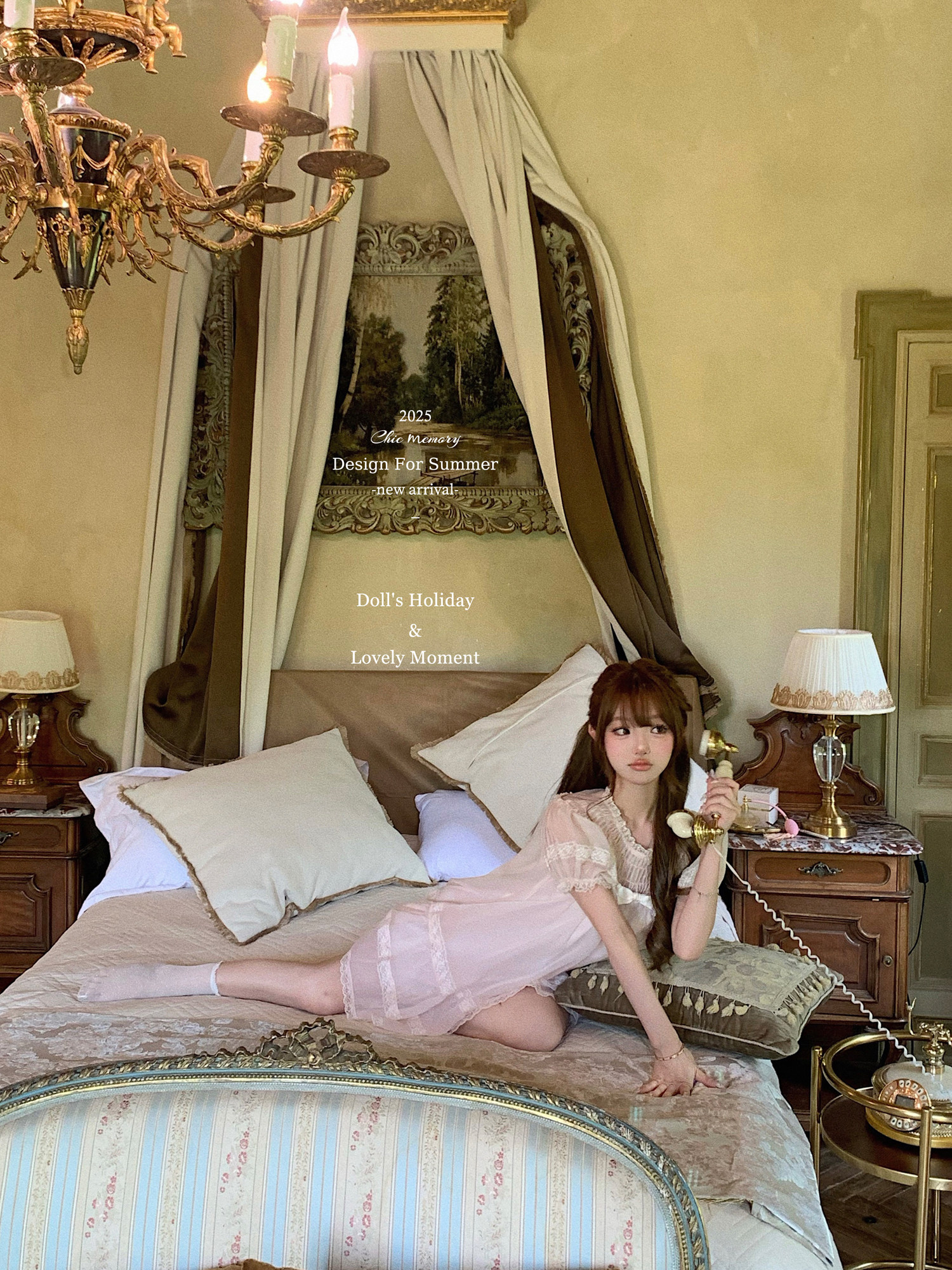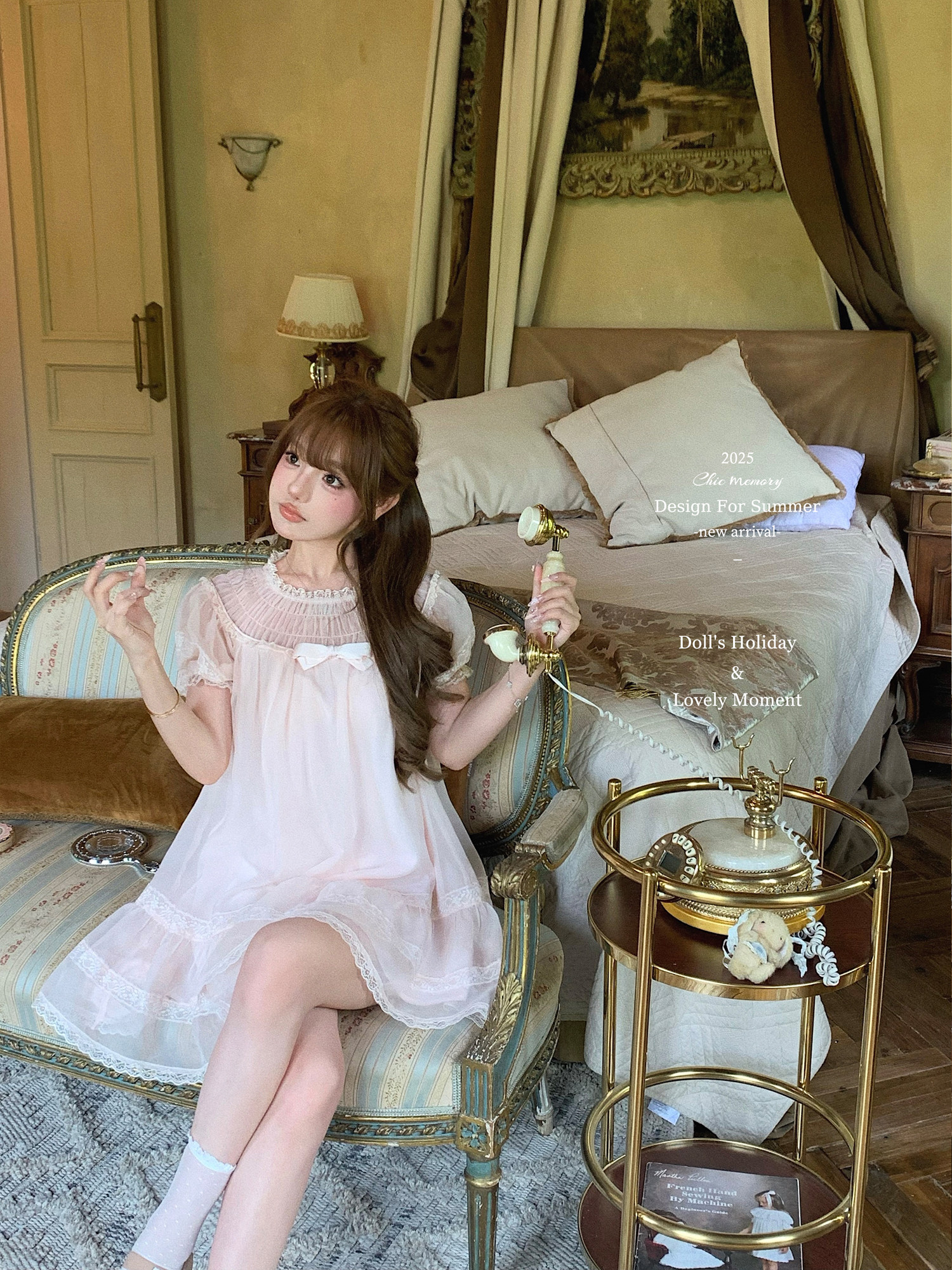 CHIC ME南意假日 古董少女甜美风蕾丝娃娃裙字泡泡袖粉色连衣裙夏 [Original Page Link]