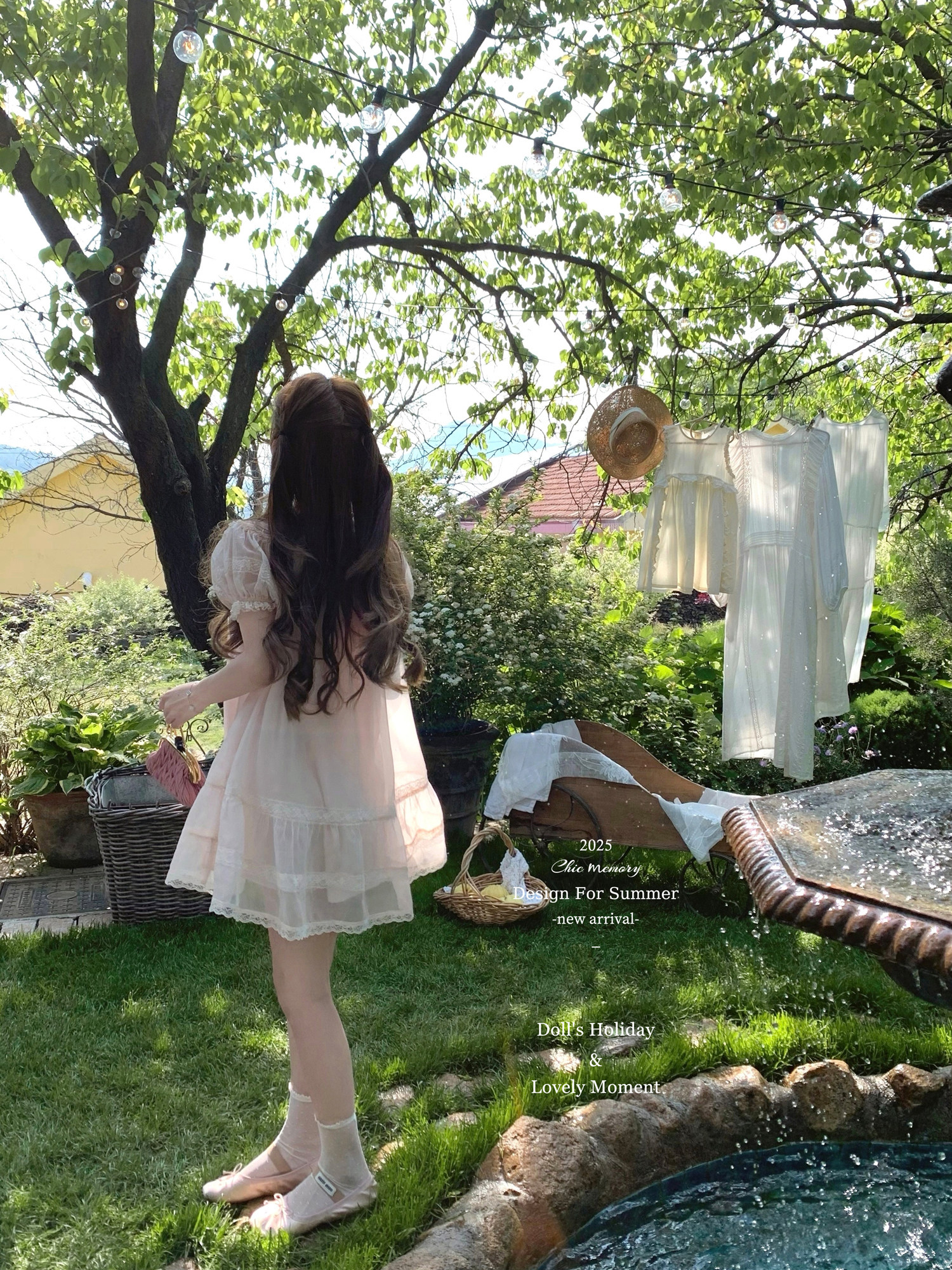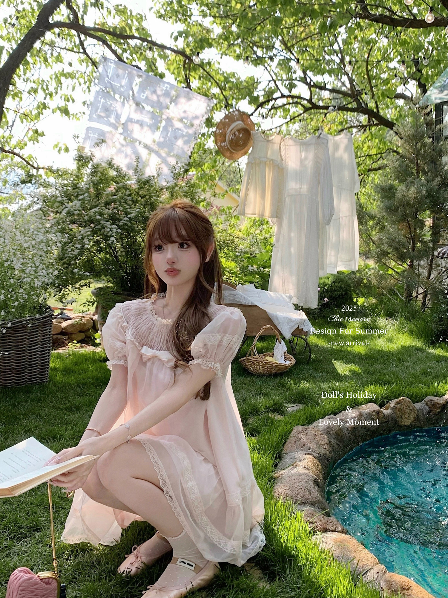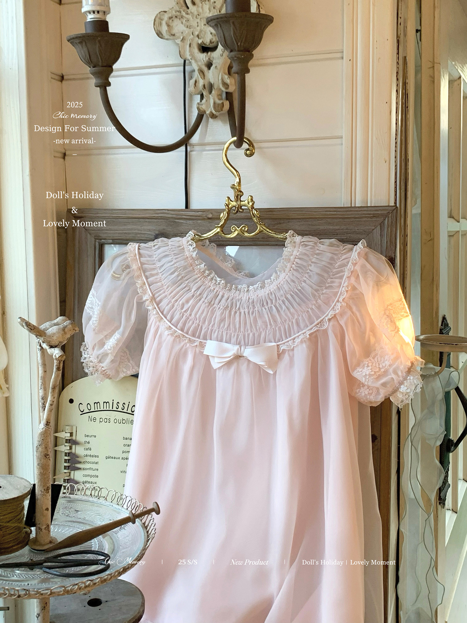 CHIC ME南意假日 古董少女甜美风蕾丝娃娃裙字泡泡袖粉色连衣裙夏 [Original Page Link]