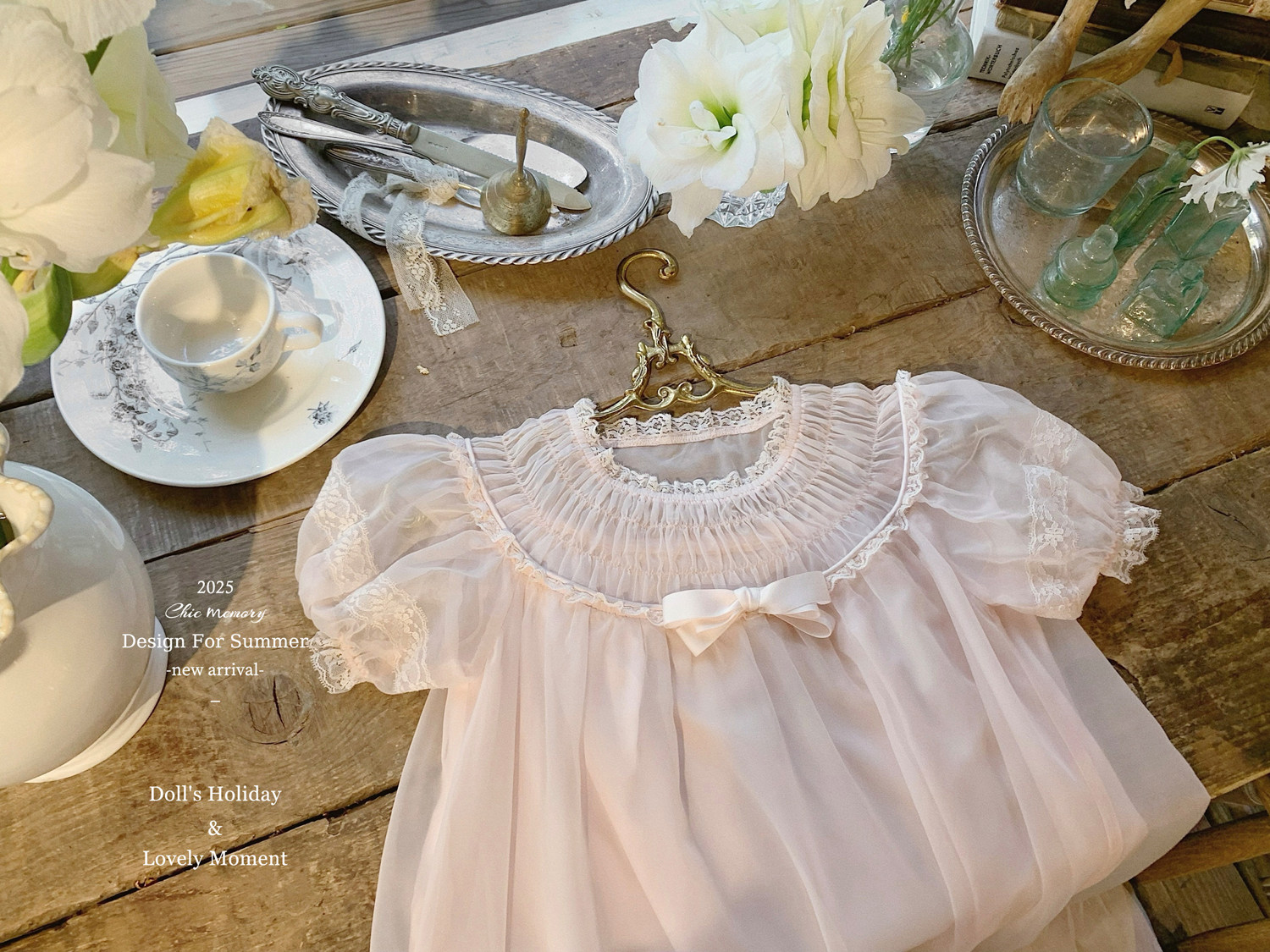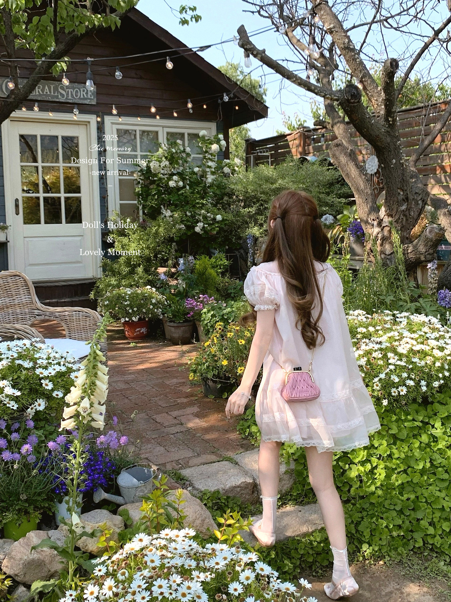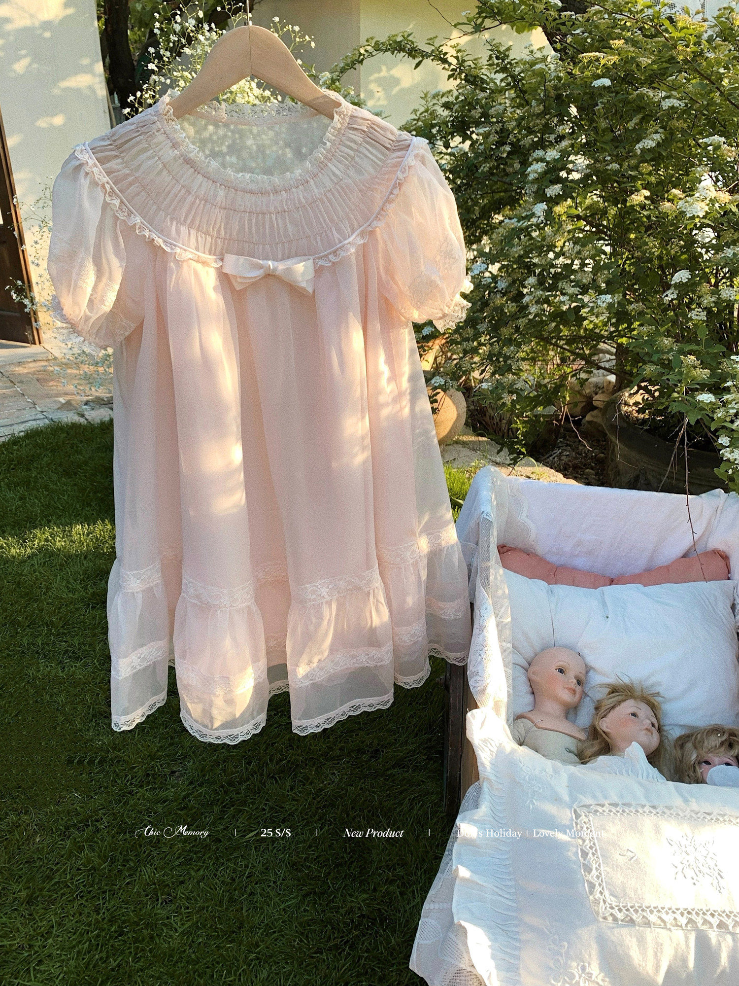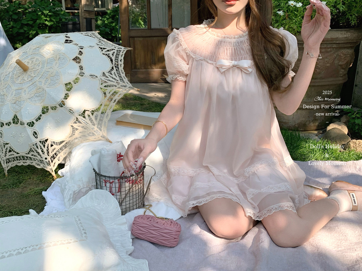 CHIC ME南意假日 古董少女甜美风蕾丝娃娃裙字泡泡袖粉色连衣裙夏 [Original Page Link]