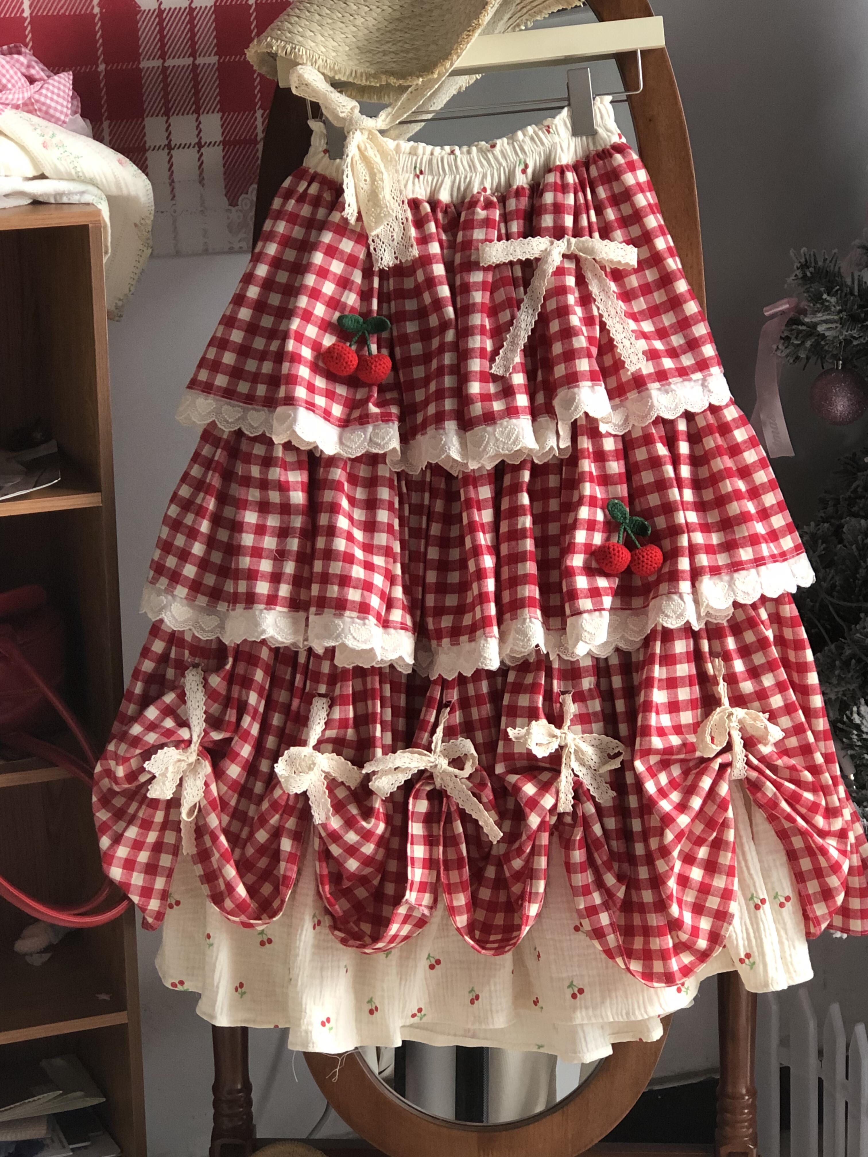 So gentle and sweet! Japanese style sweet girl lace trim cake skirt women's summer cherry patchwork bow skirt