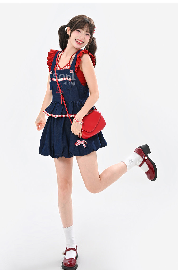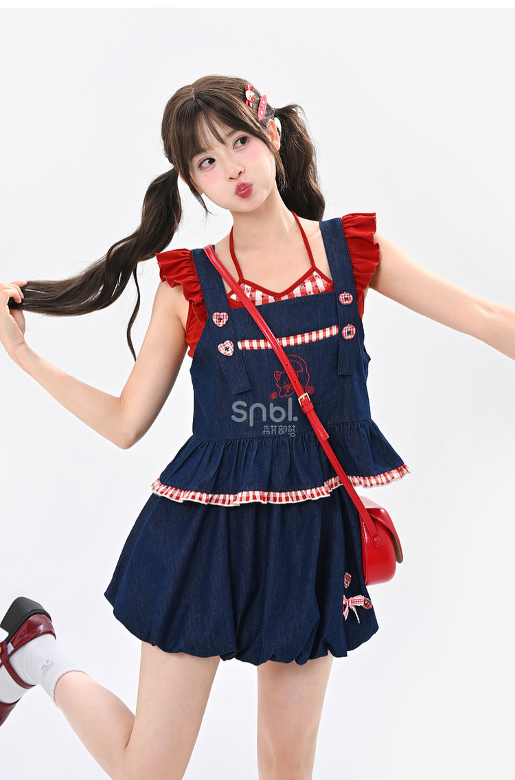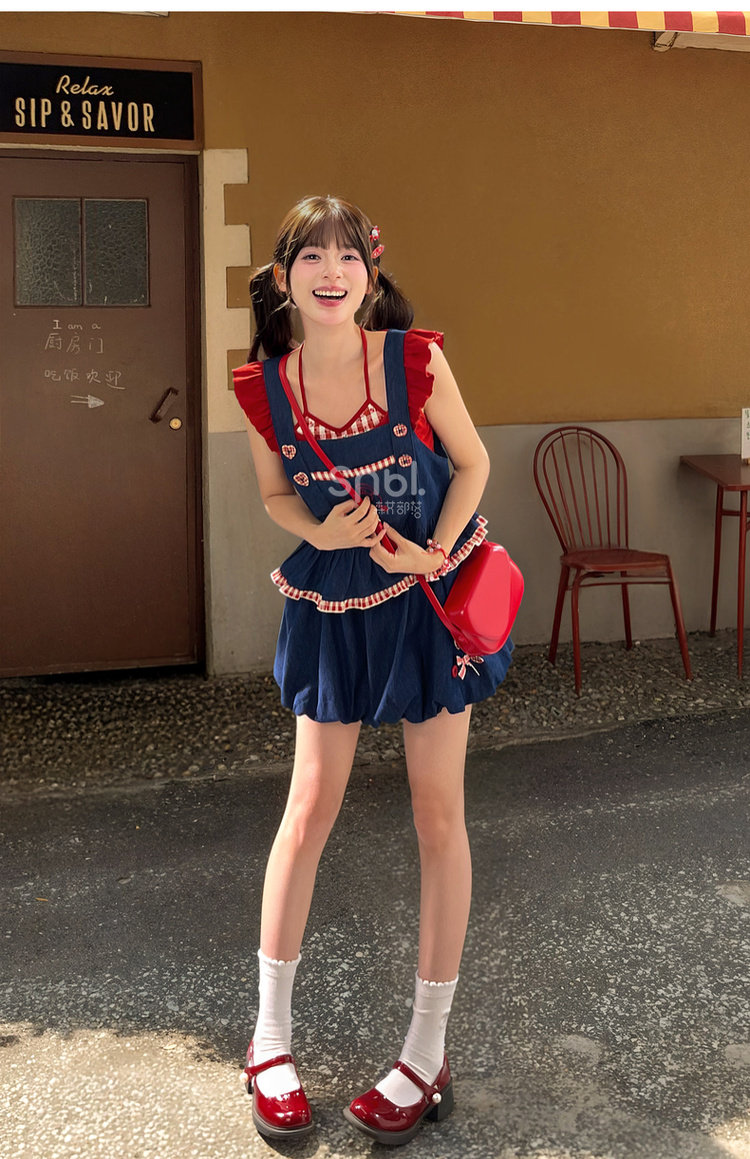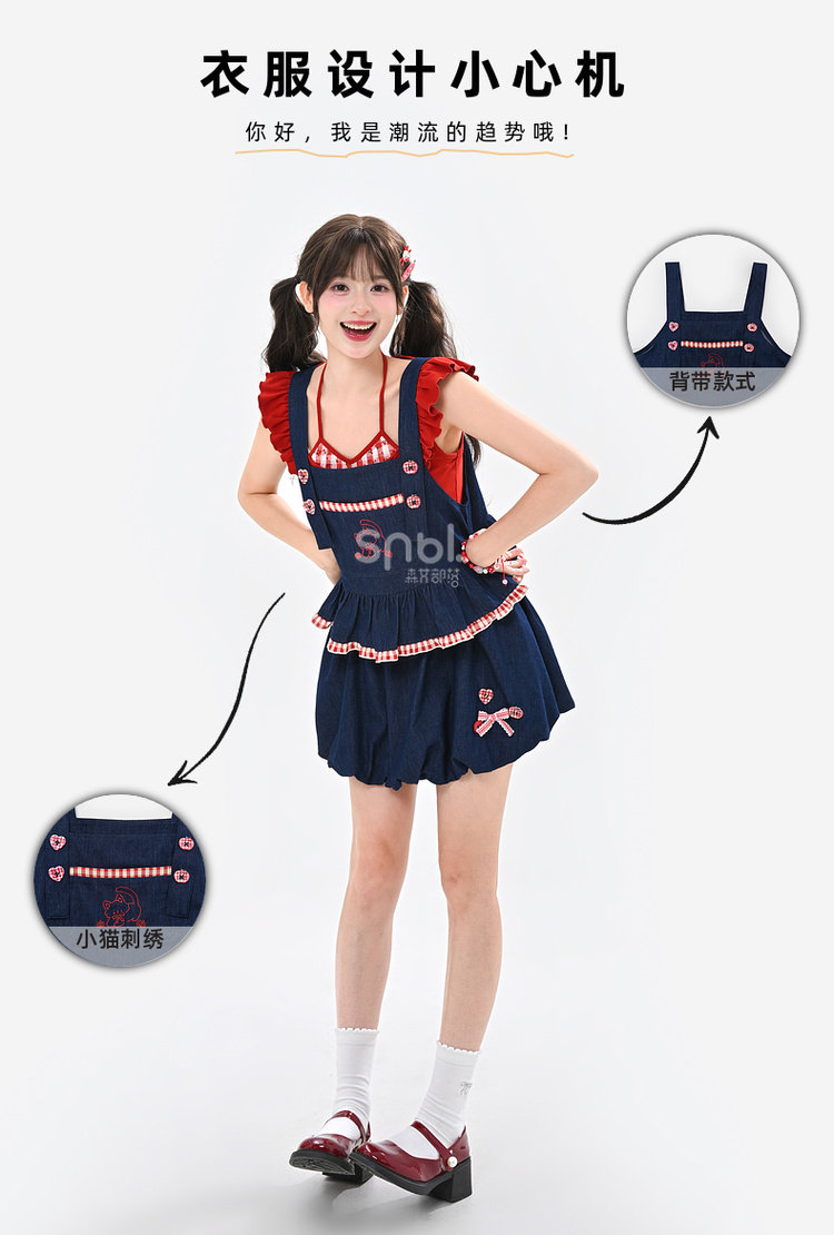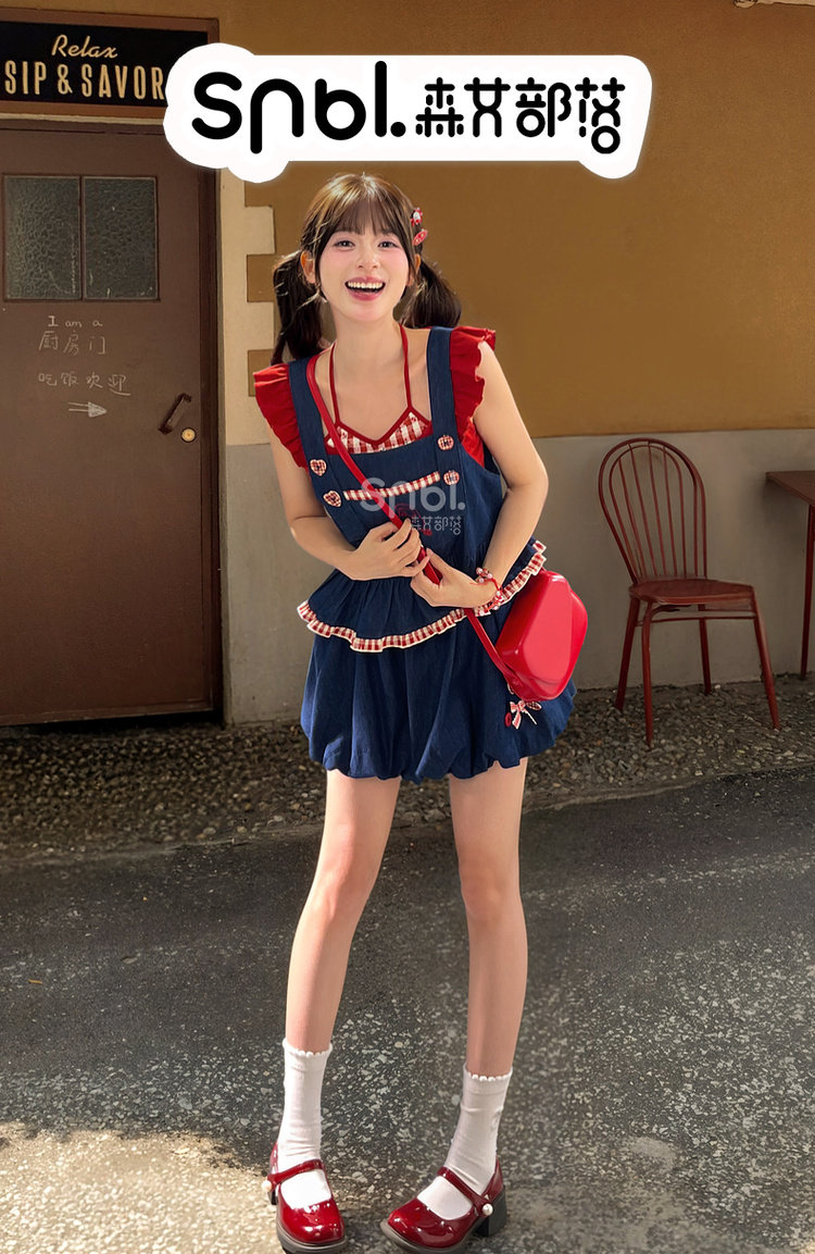 森女部落甜美格子拼接背心宽松覆古高腰花苞裙夏半身裙时尚套装女 [Original Page Link]