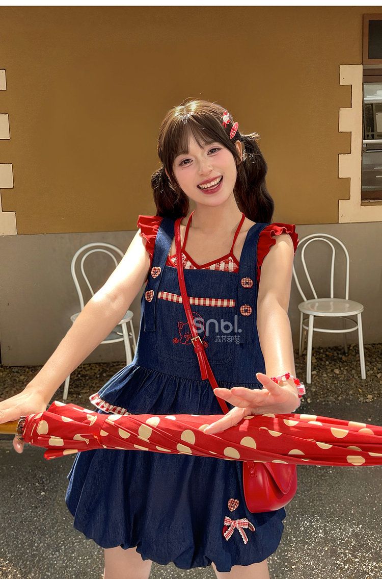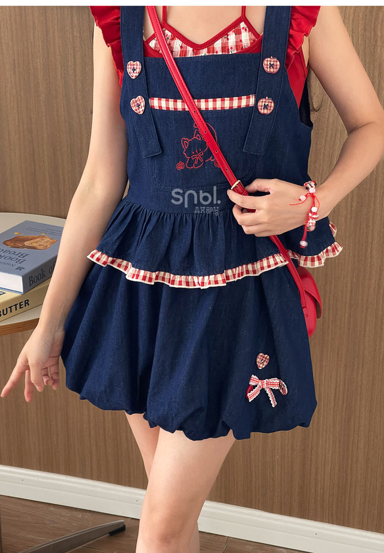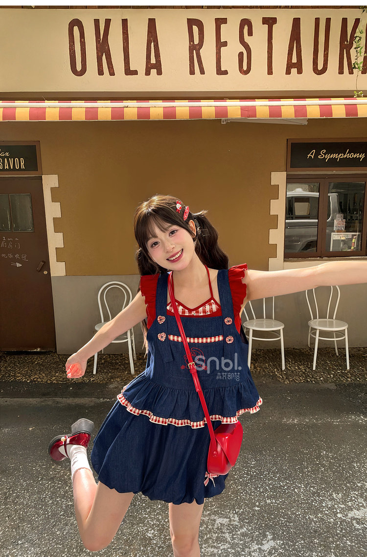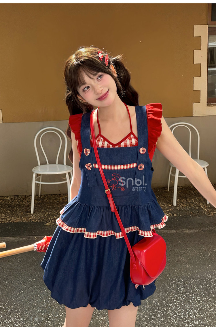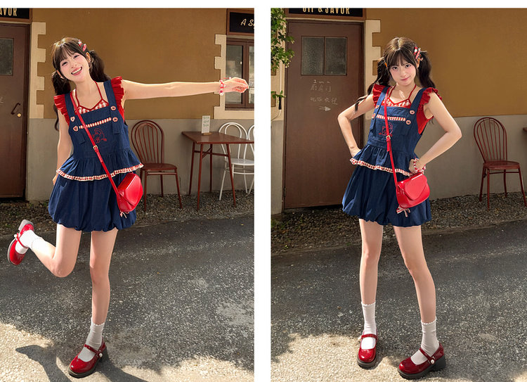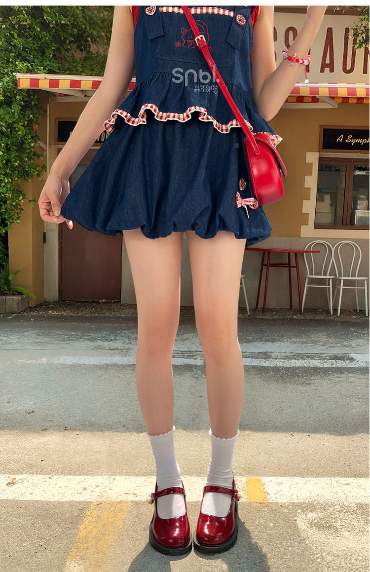 森女部落甜美格子拼接背心宽松覆古高腰花苞裙夏半身裙时尚套装女 [Original Page Link]