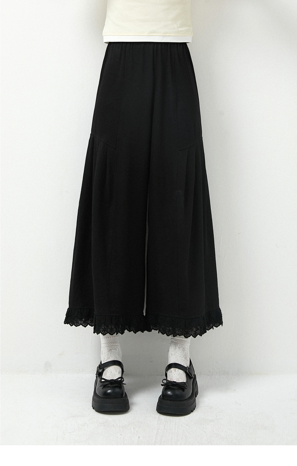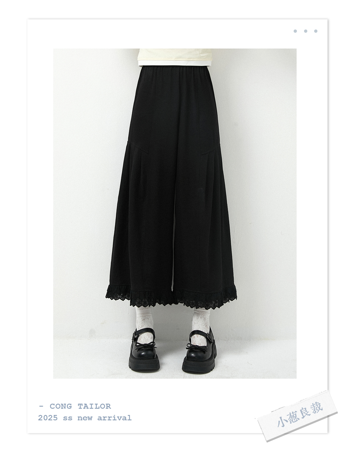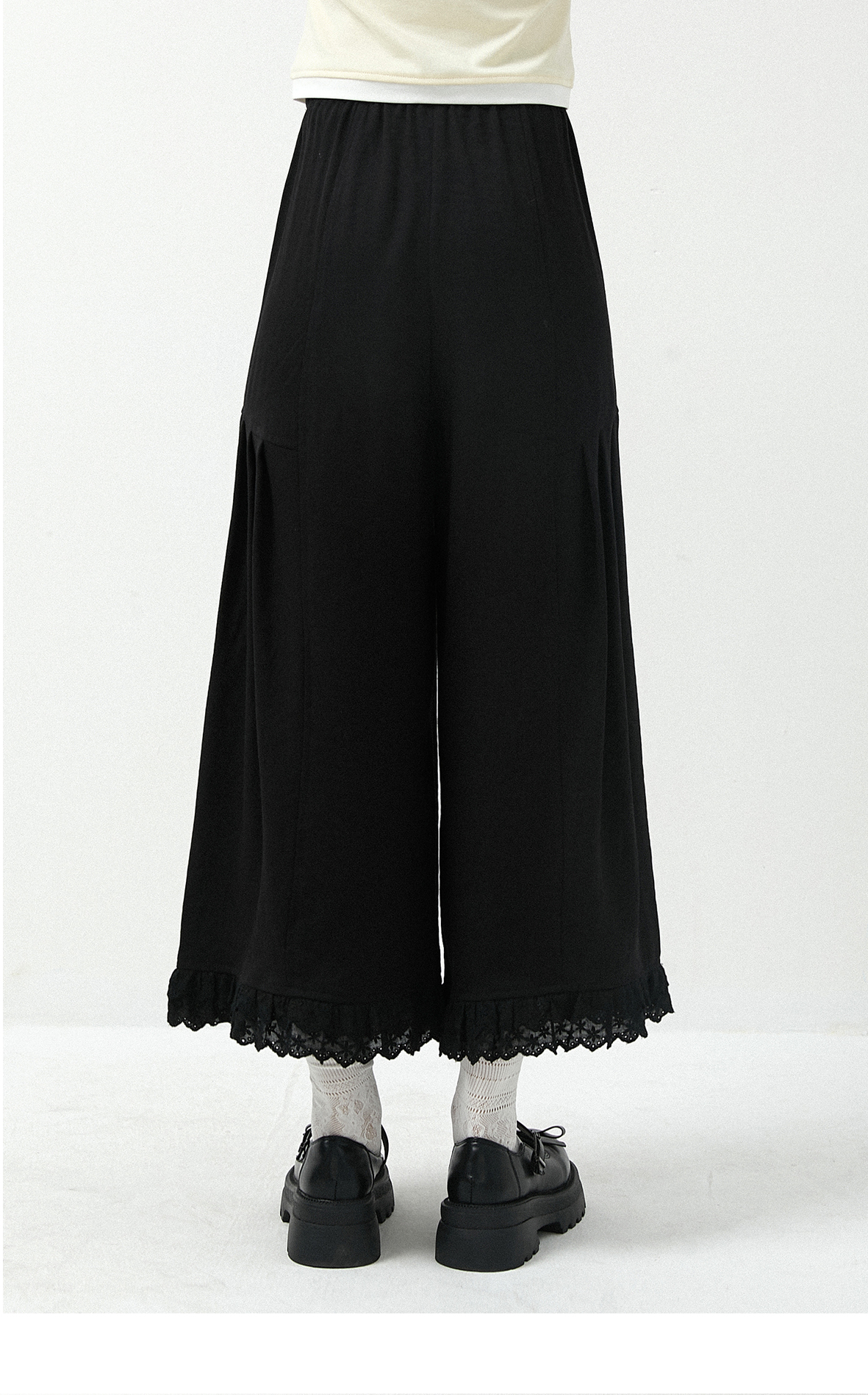 Xiaocong Liangcai "Romance Between Pleses" black elastic waist pleated stitching lace lace linen nine-point wide-leg pants for women