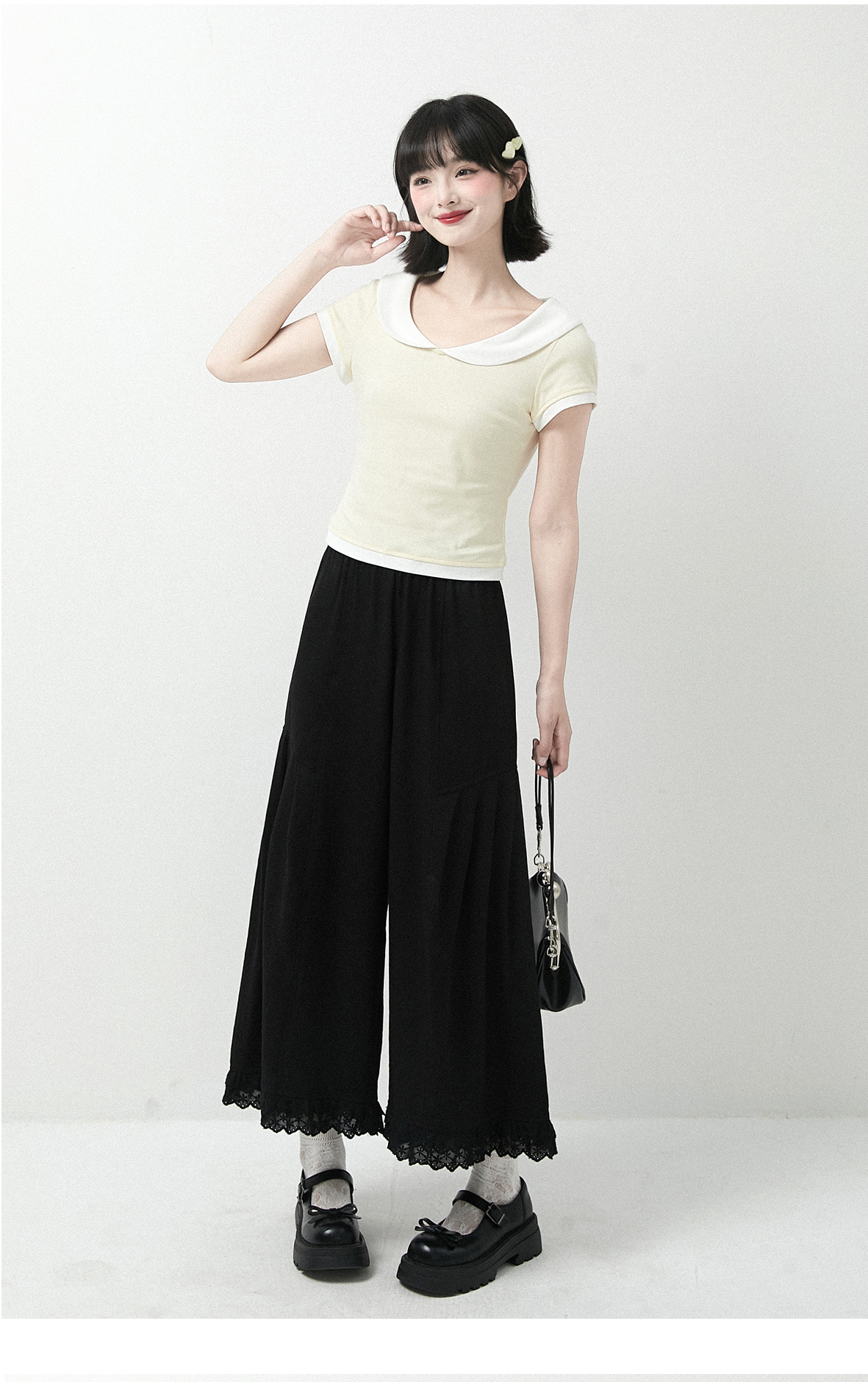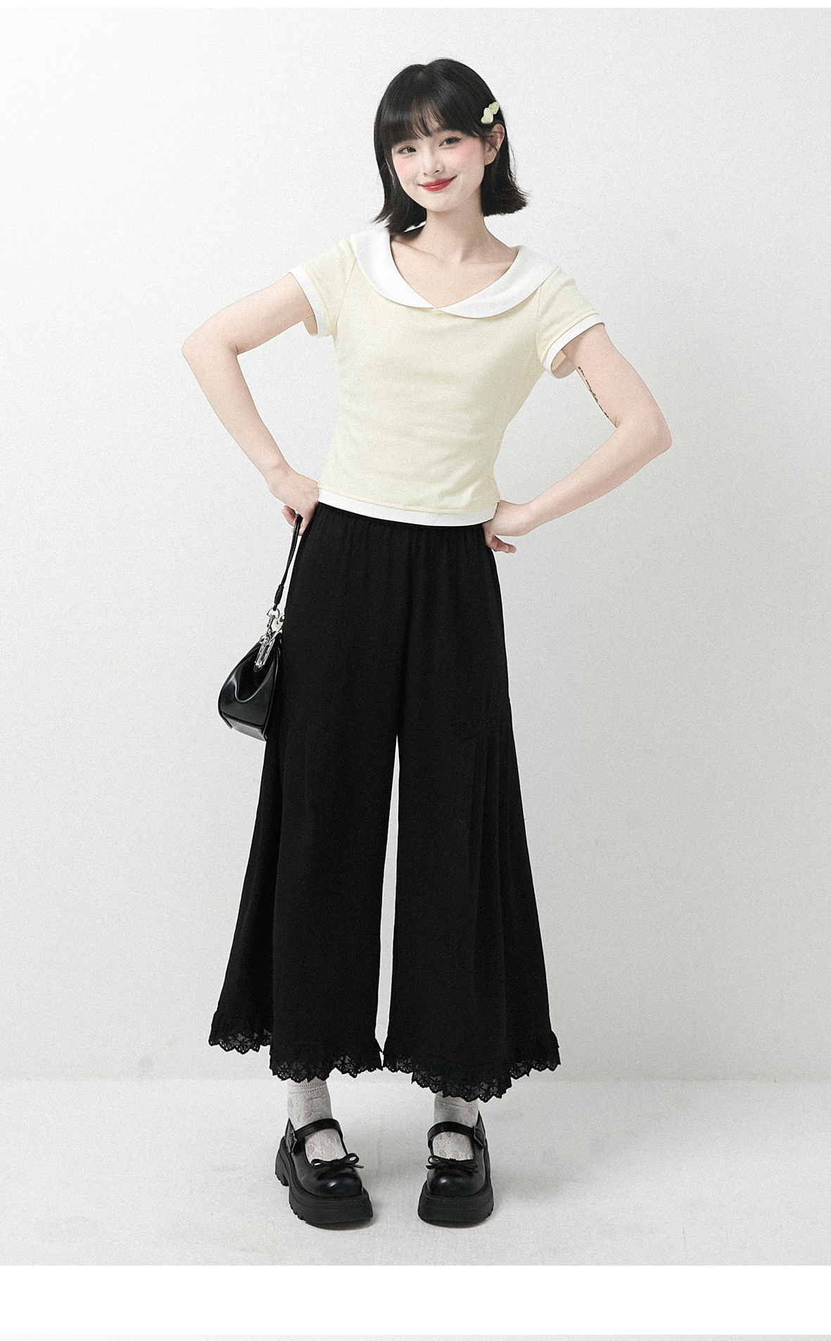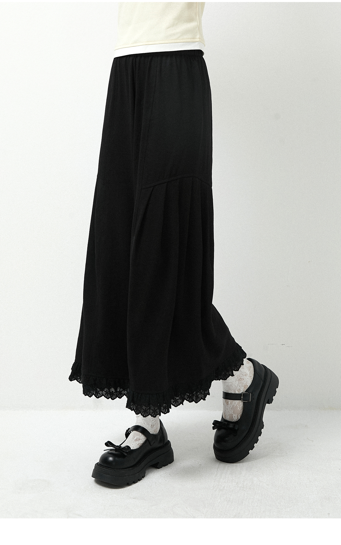 Xiaocong Liangcai "Romance Between Pleses" black elastic waist pleated stitching lace lace linen nine-point wide-leg pants for women