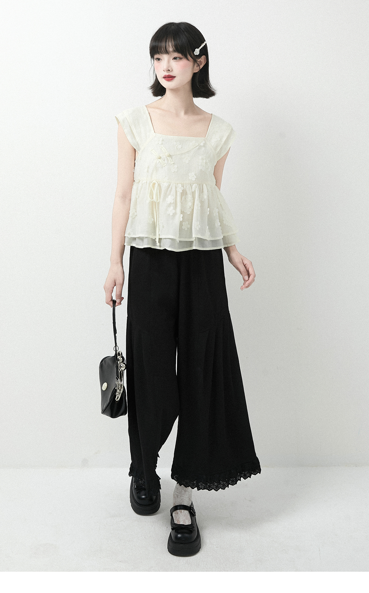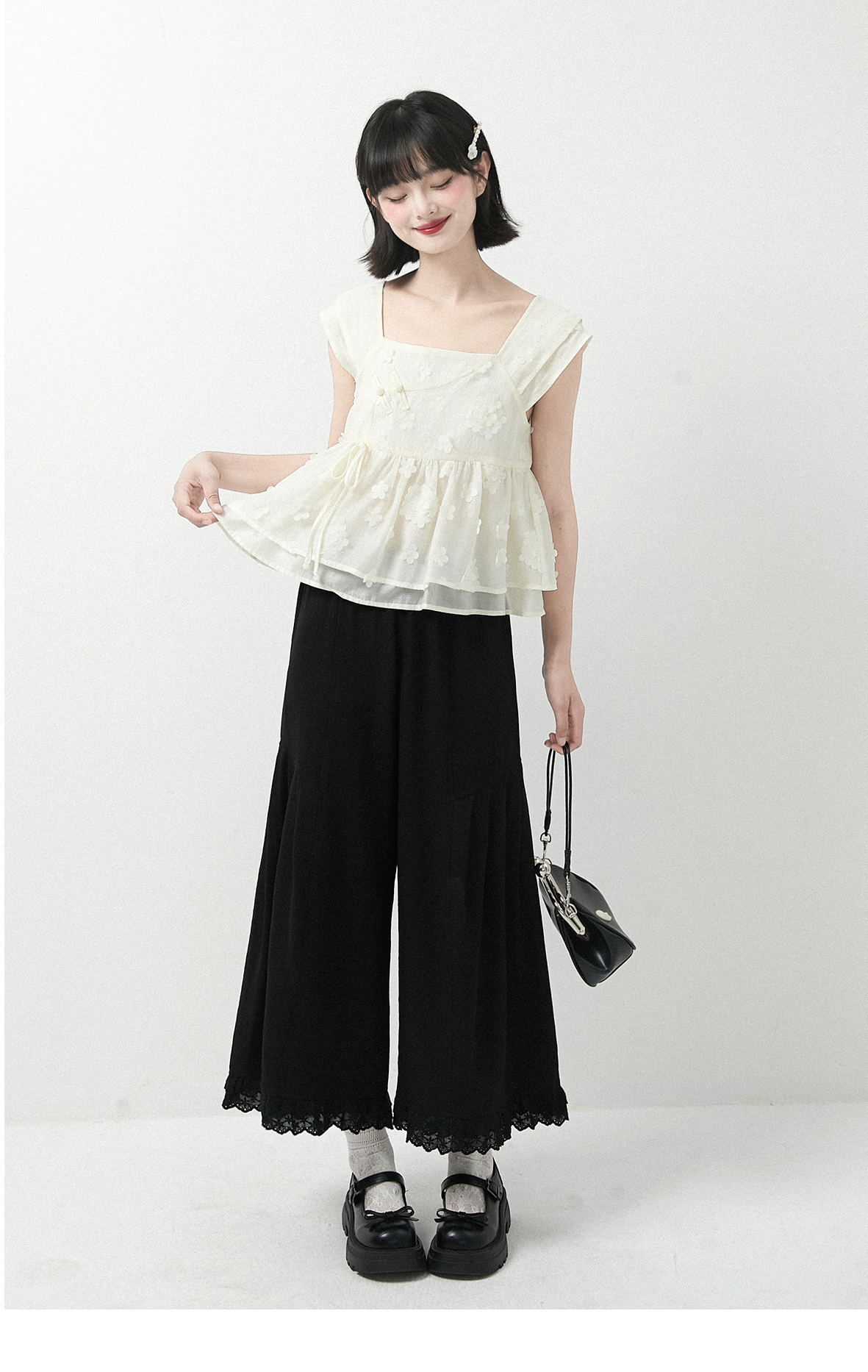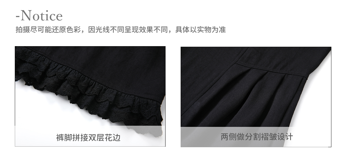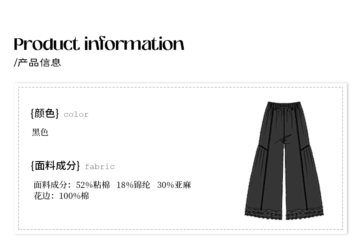 小葱良裁"褶间浪漫"黑色松紧腰褶皱拼接蕾丝花边亚麻九分阔腿裤女 [Original Page Link]