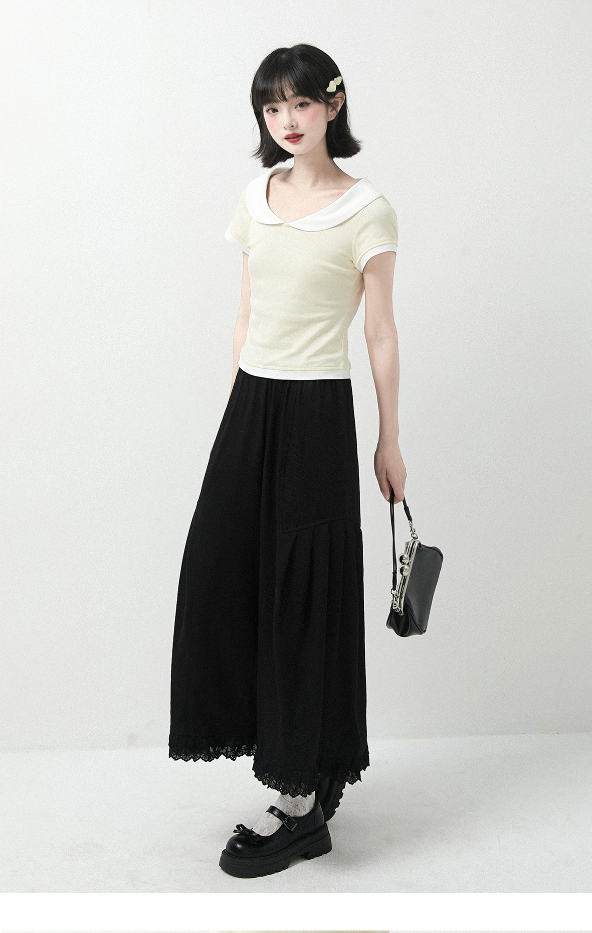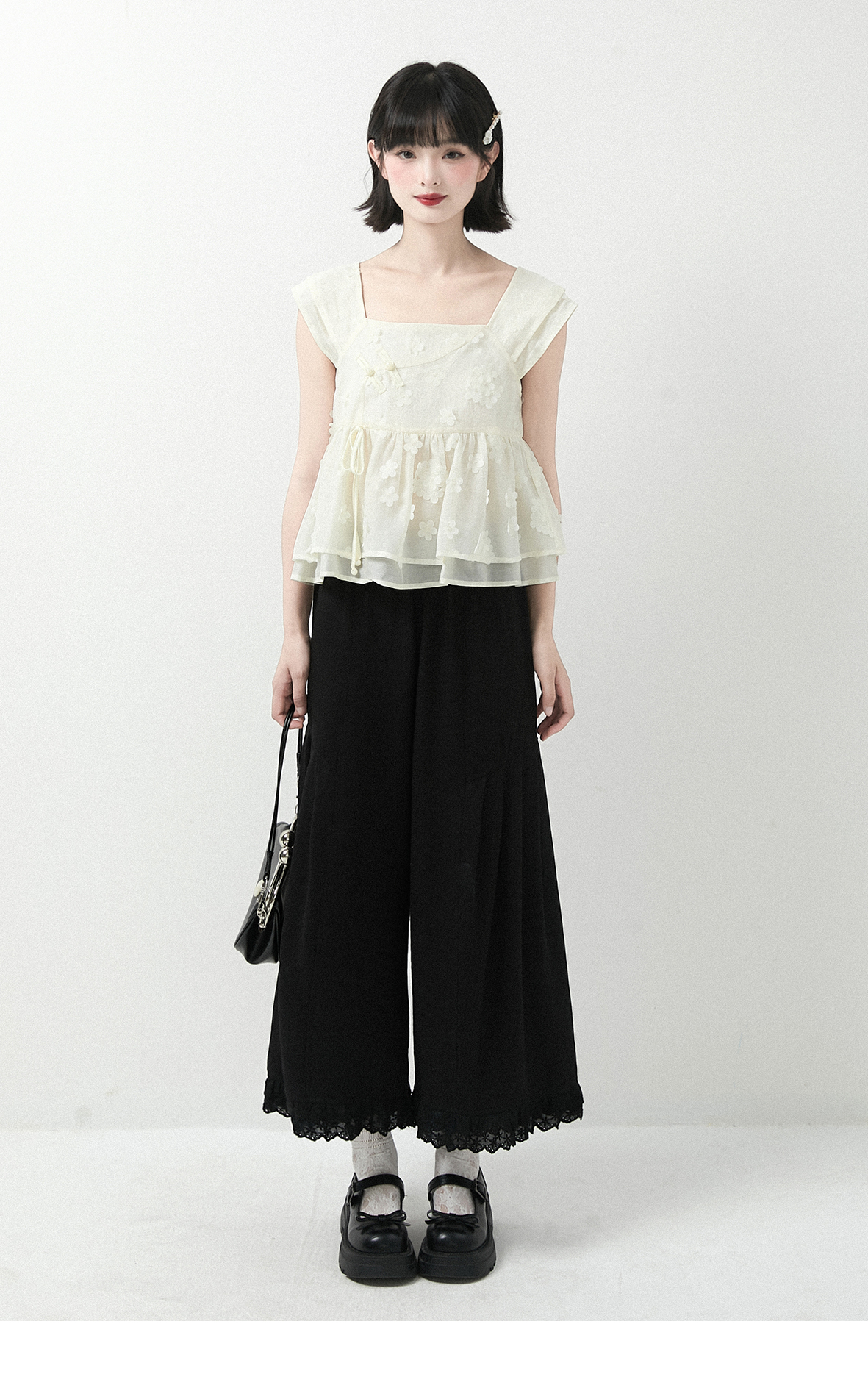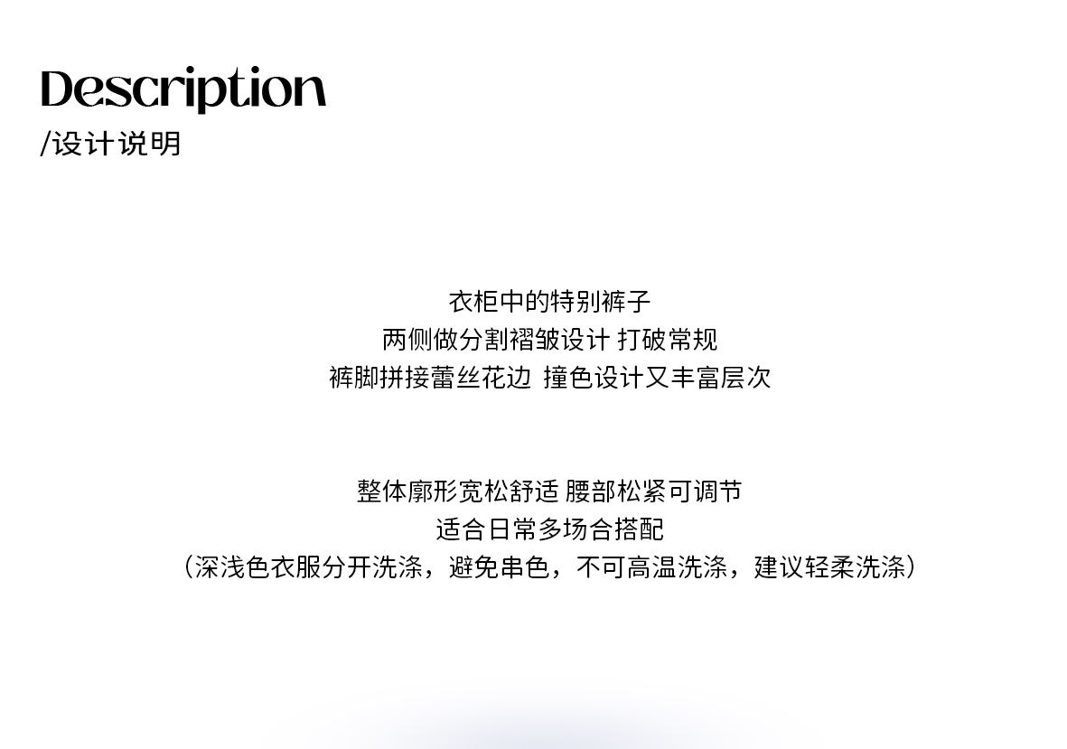 小葱良裁"褶间浪漫"黑色松紧腰褶皱拼接蕾丝花边亚麻九分阔腿裤女 [Original Page Link]