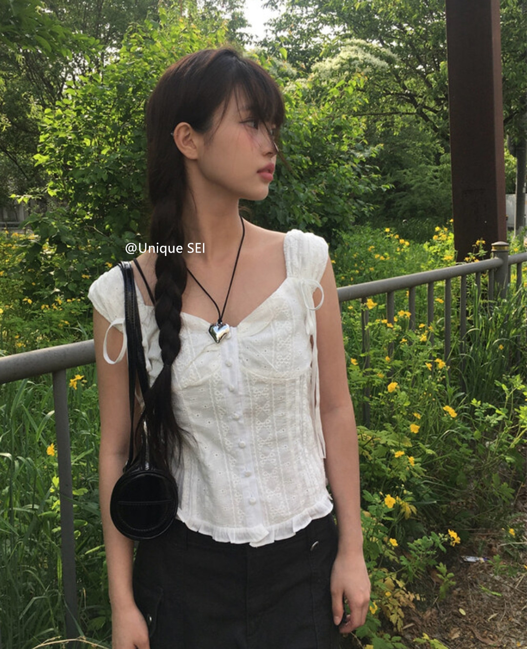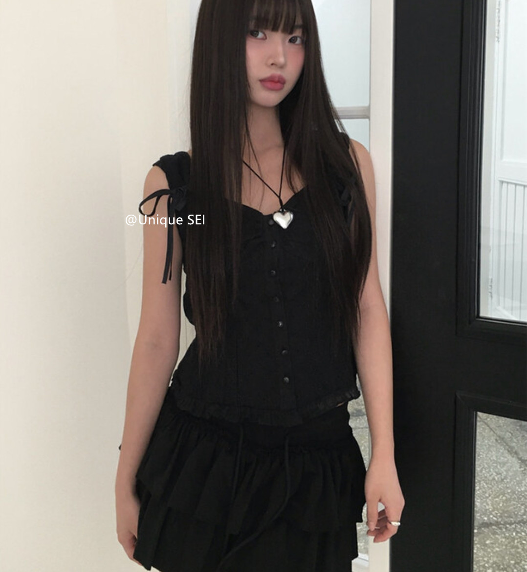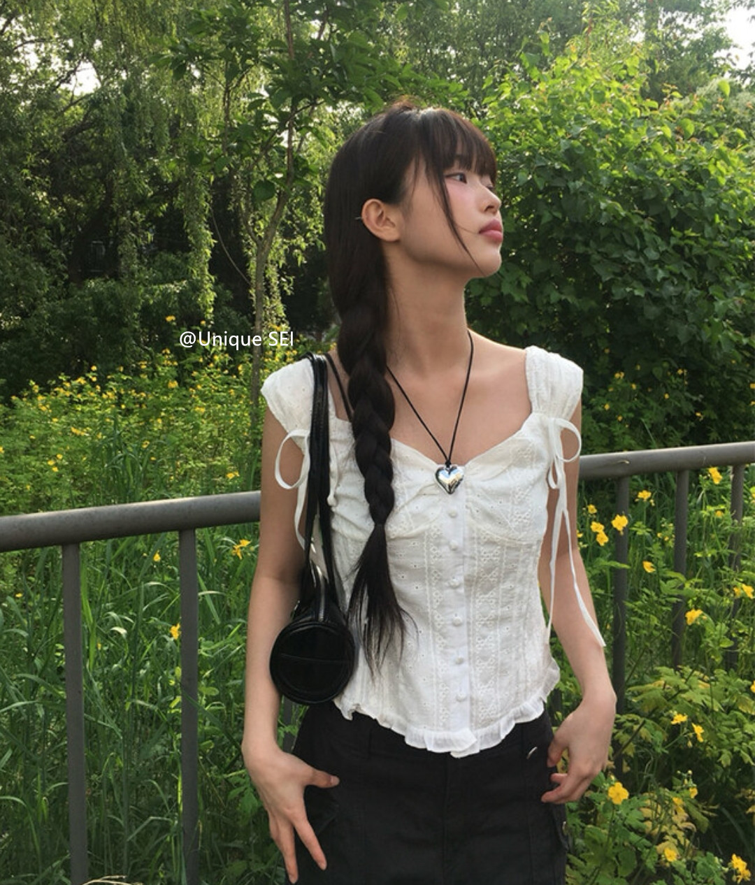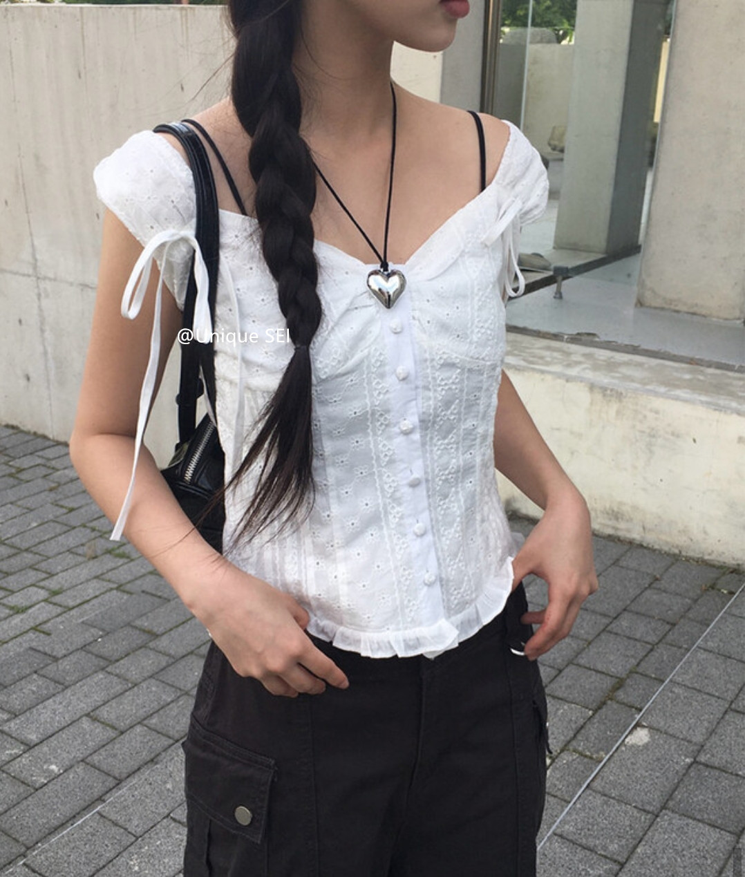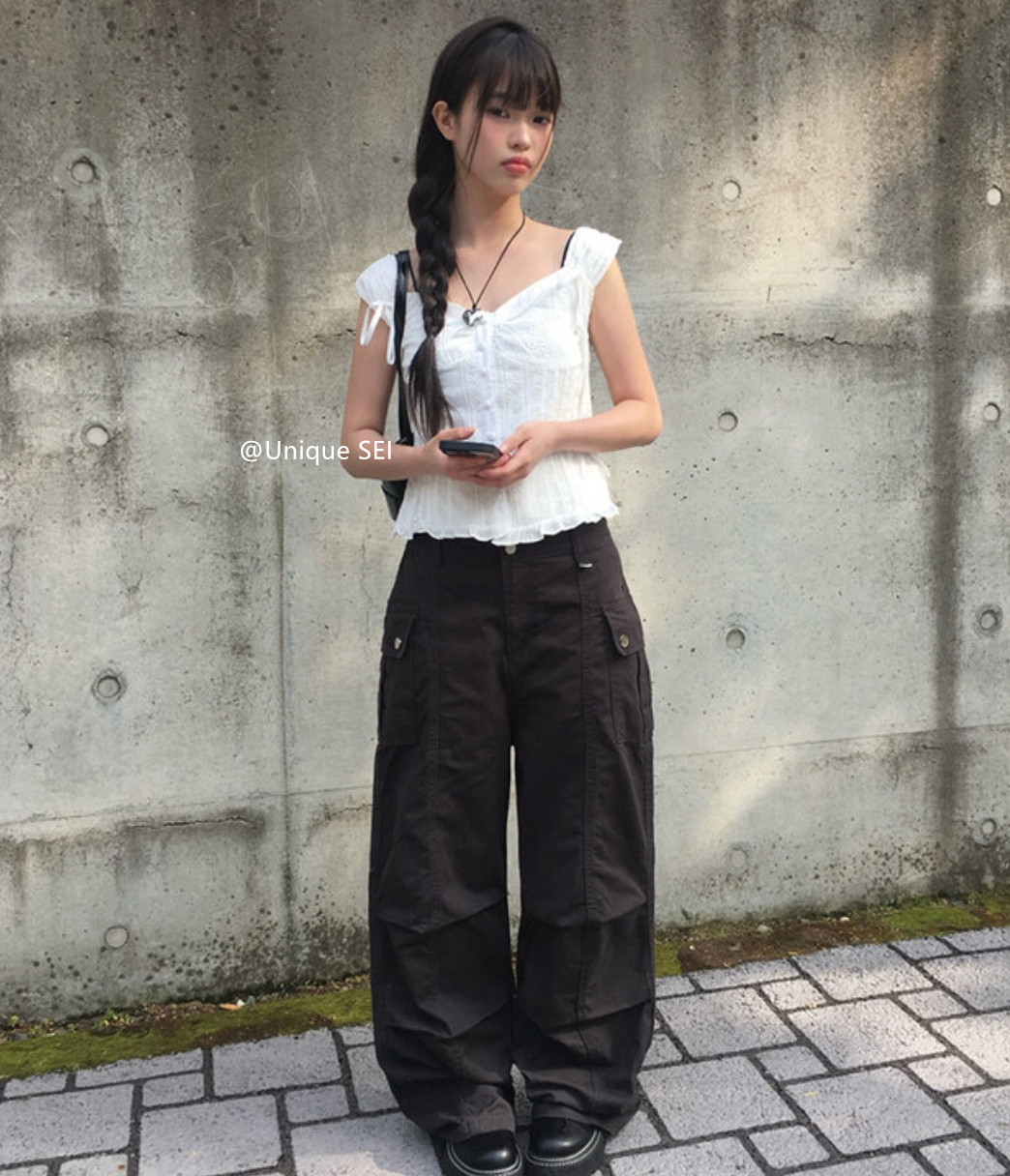 Unique SEI 韩系夏季木耳边系带镂空显瘦衬衫背心上衣/直筒工装裤 [Original Page Link]