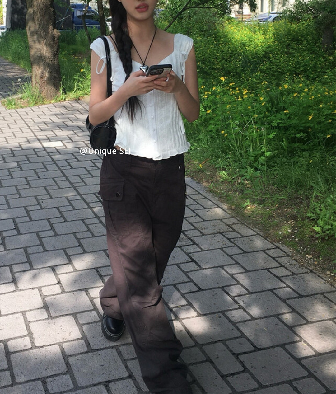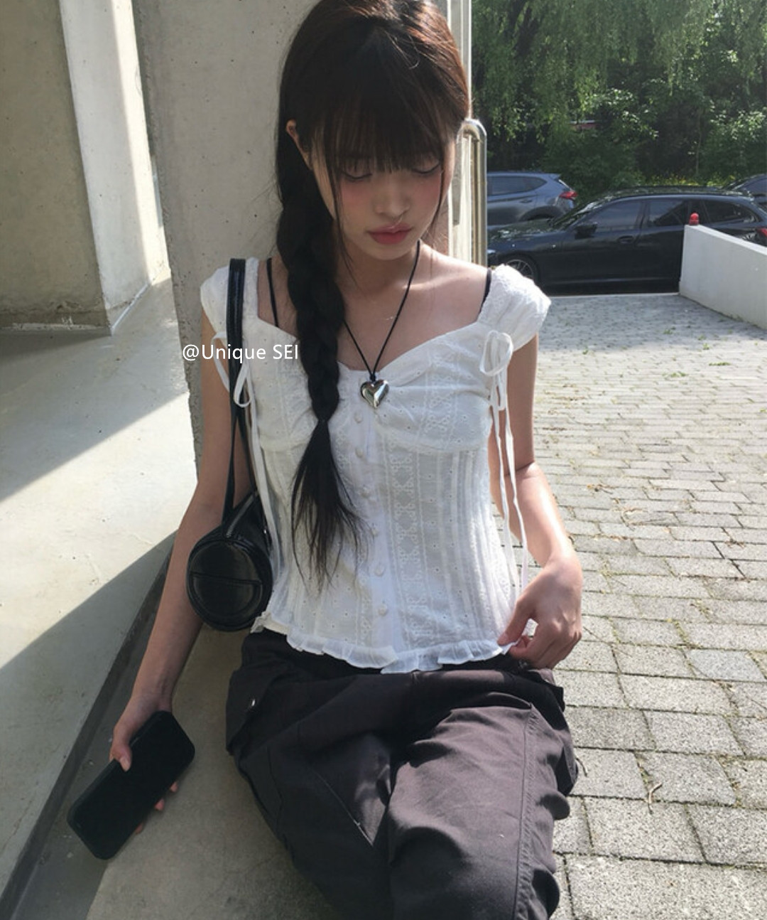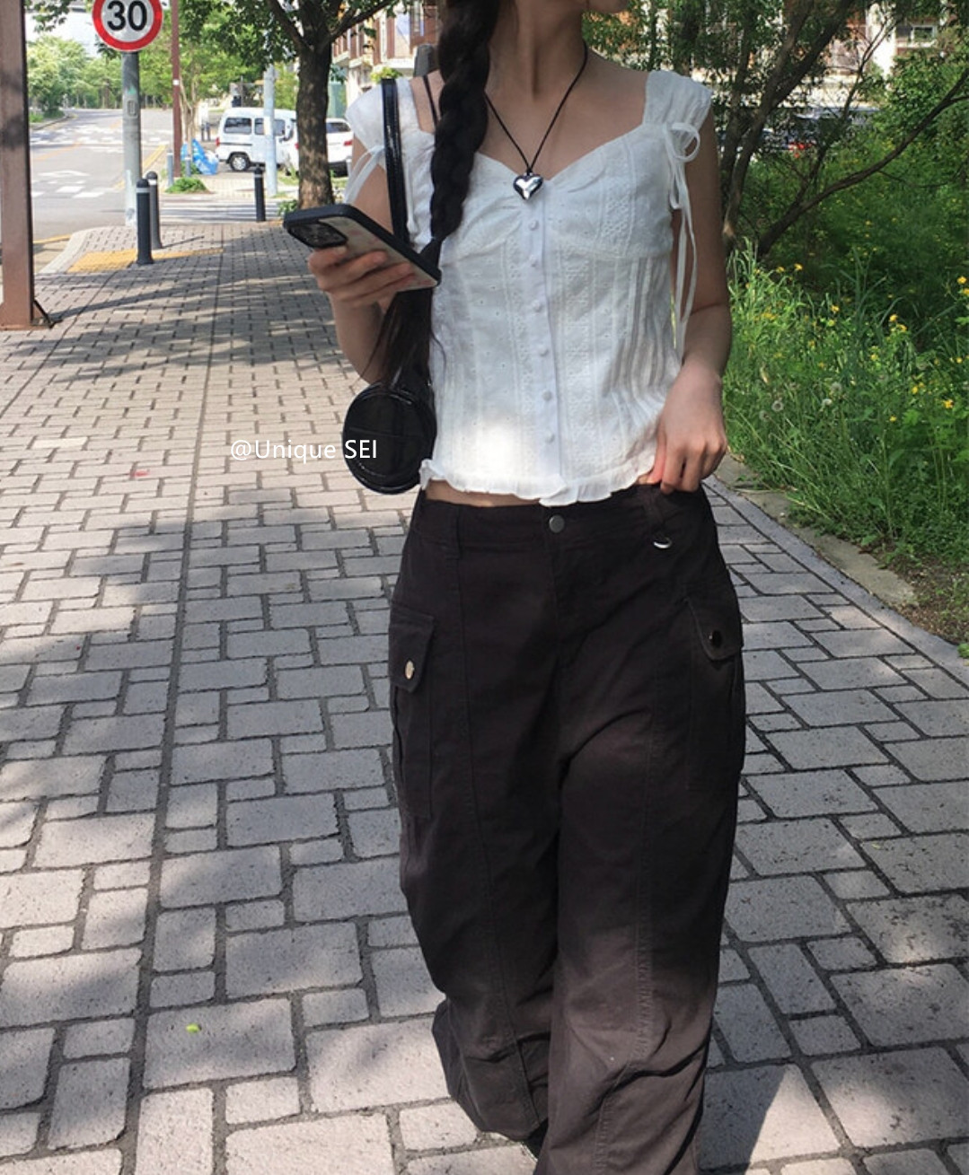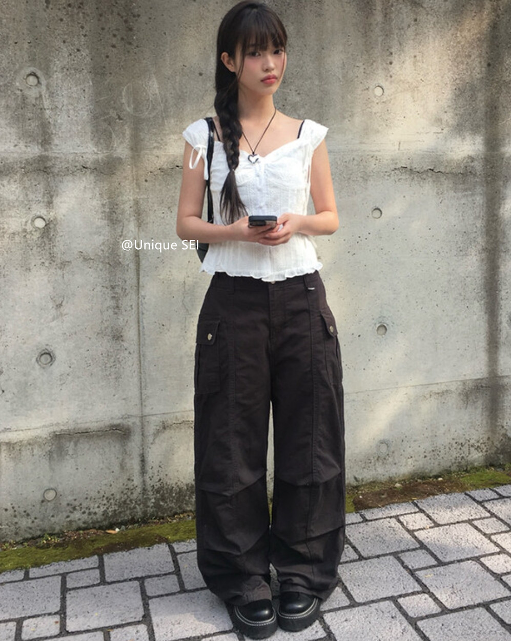Unique SEI 韩系夏季木耳边系带镂空显瘦衬衫背心上衣/直筒工装裤 [Original Page Link]