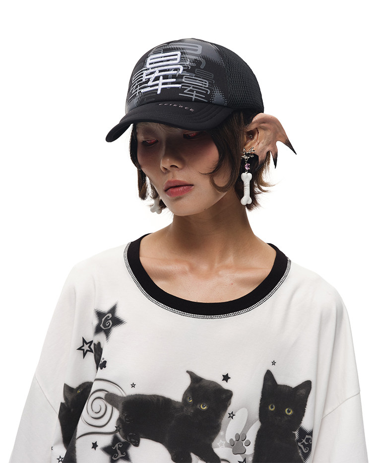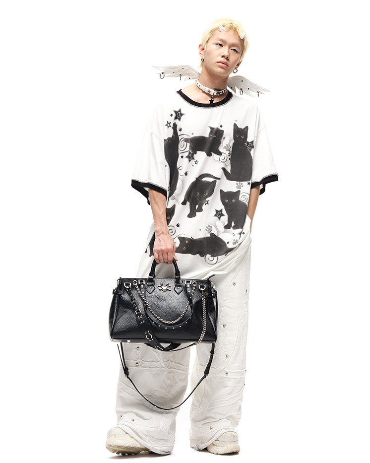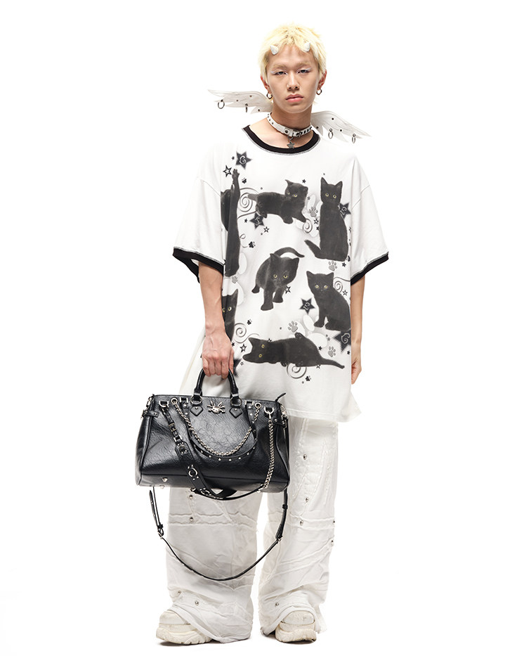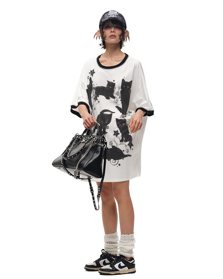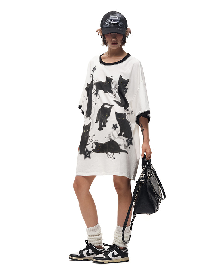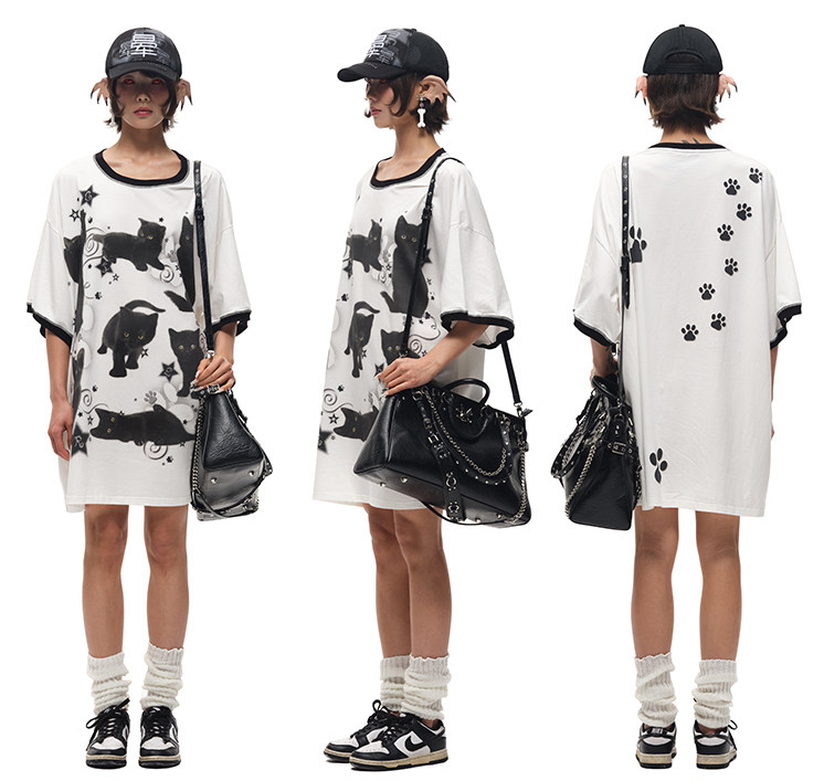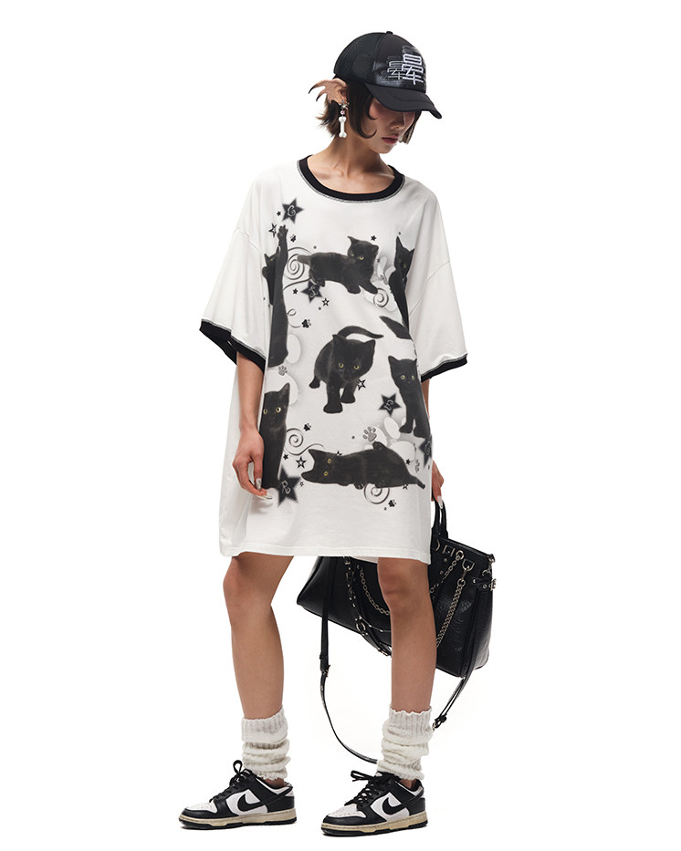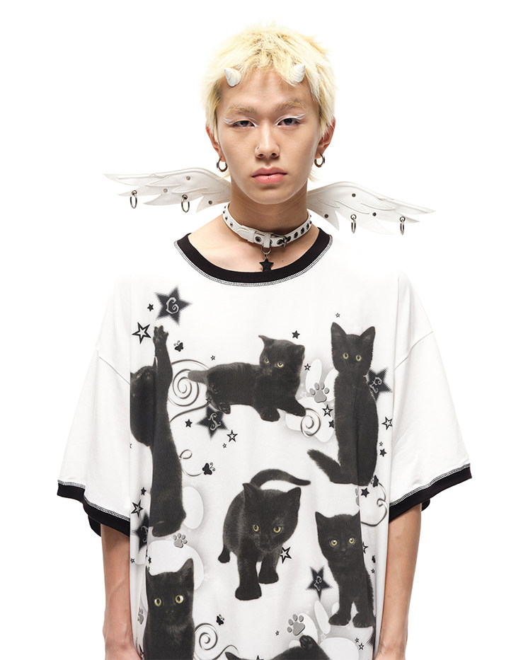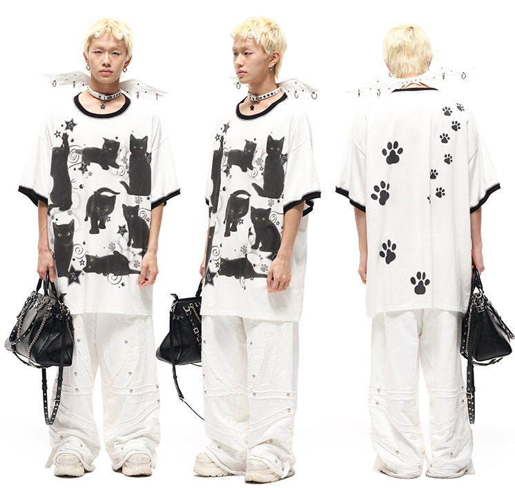 CFIERCE黑猫印花宽大棉质T恤 街头风吸湿排汗夏季新款上衣 [Original Page Link]