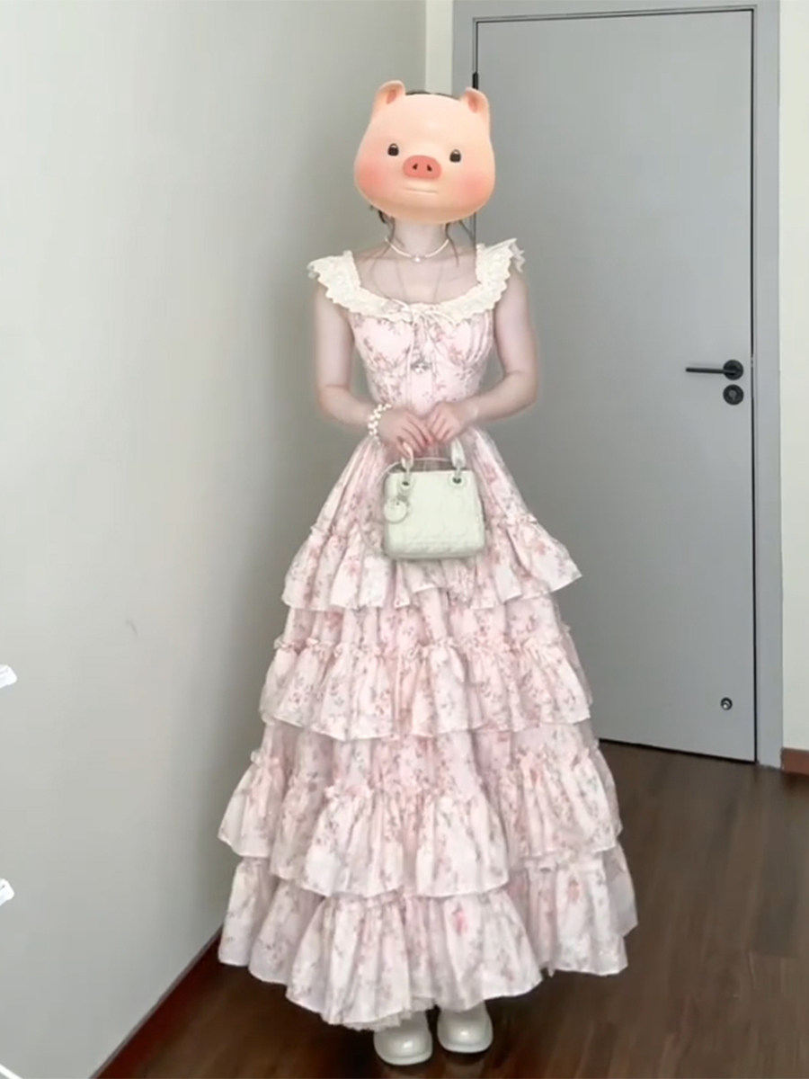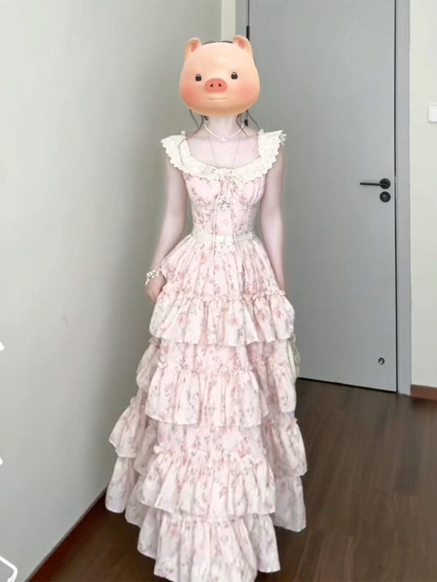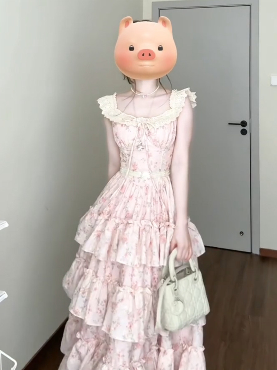 1/4吋套筒扳手袖粉色碎花吊带洋装女夏日绝美温柔风公主蛋糕裙初恋长裙子 [Original Page Link]