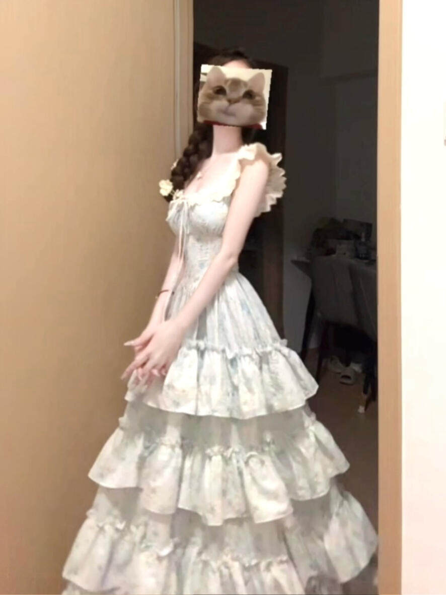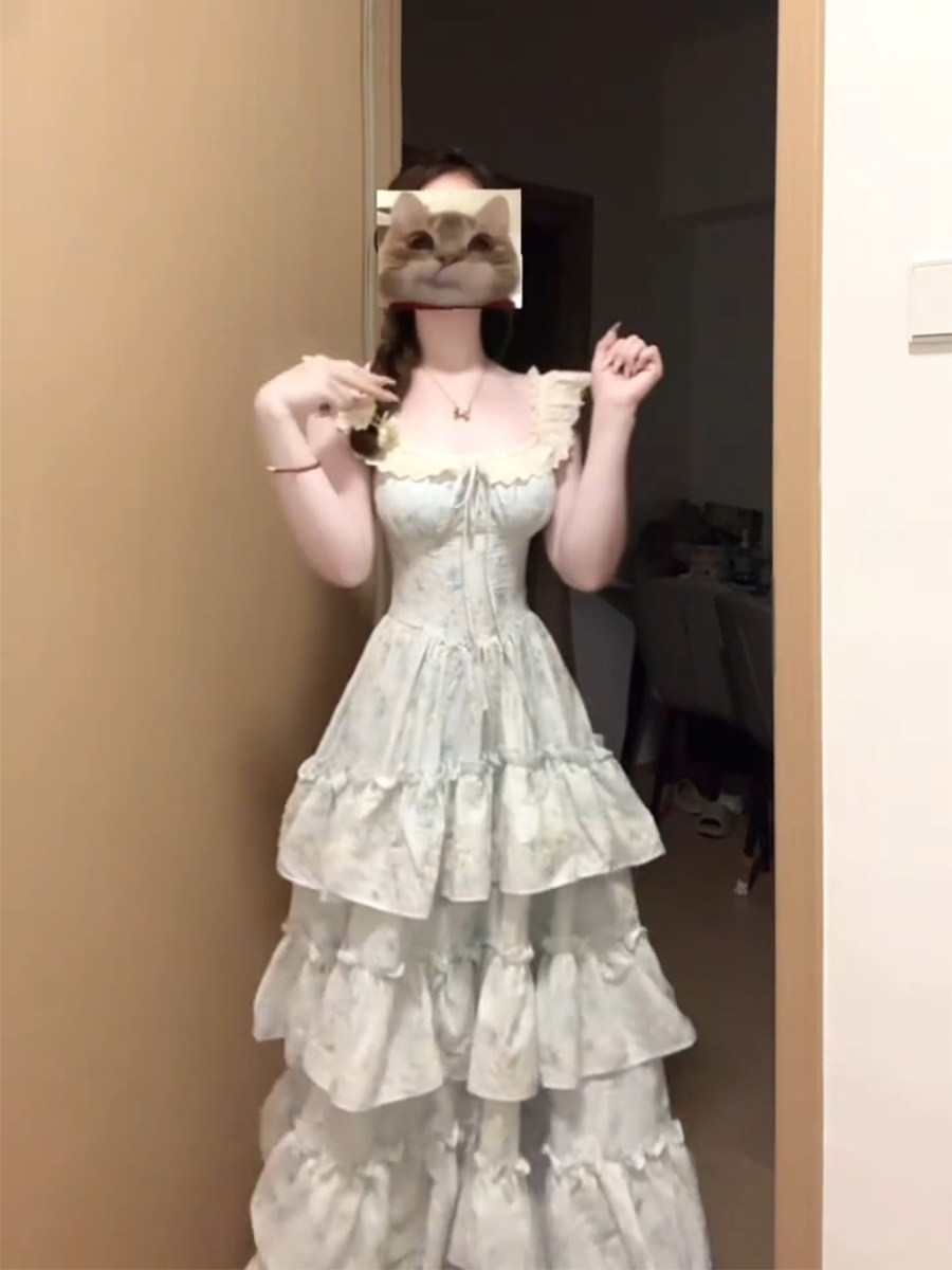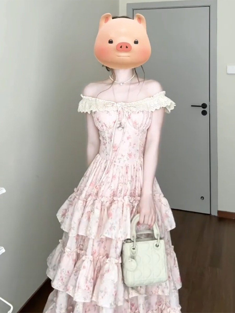 1/4吋套筒扳手袖粉色碎花吊带洋装女夏日绝美温柔风公主蛋糕裙初恋长裙子 [Original Page Link]