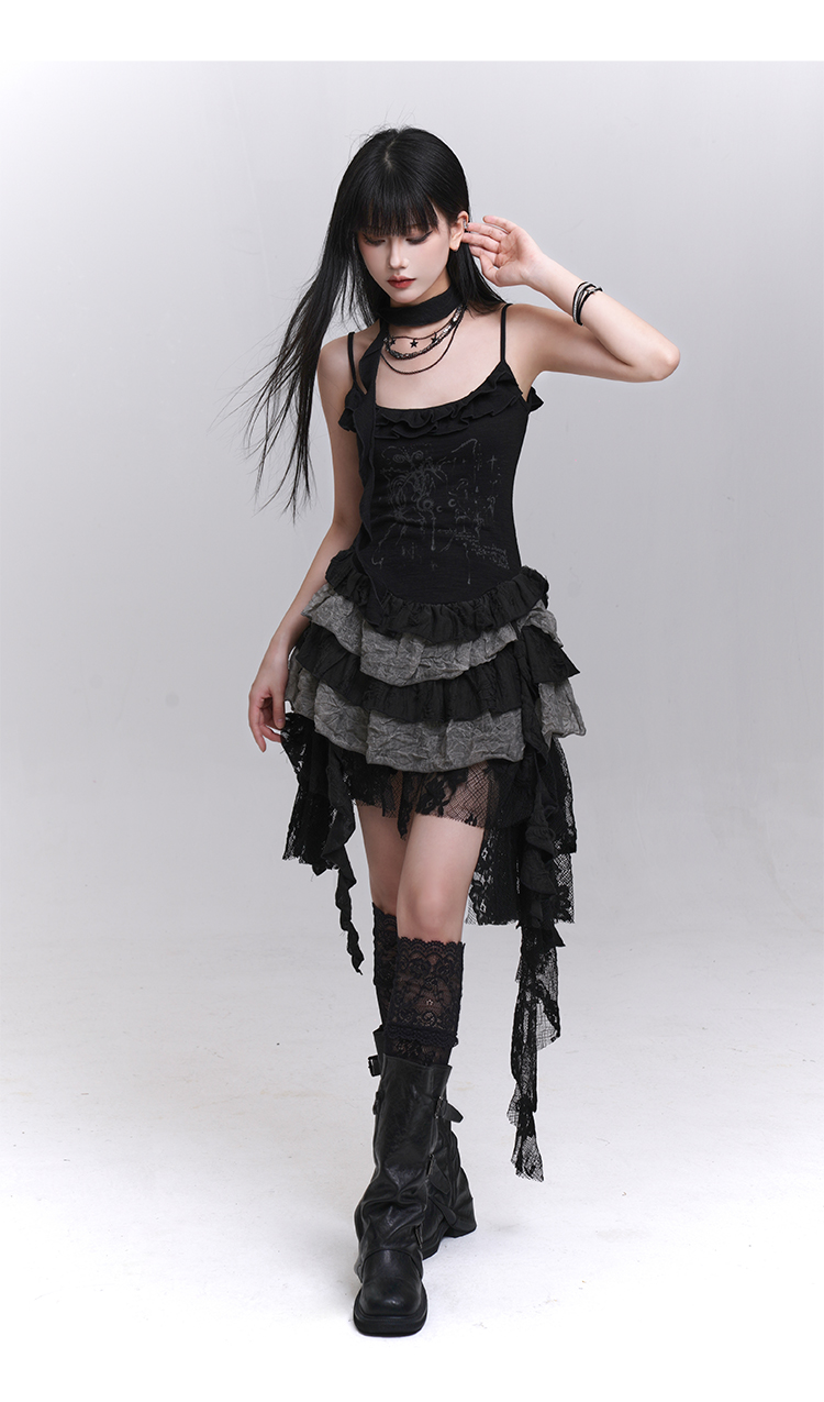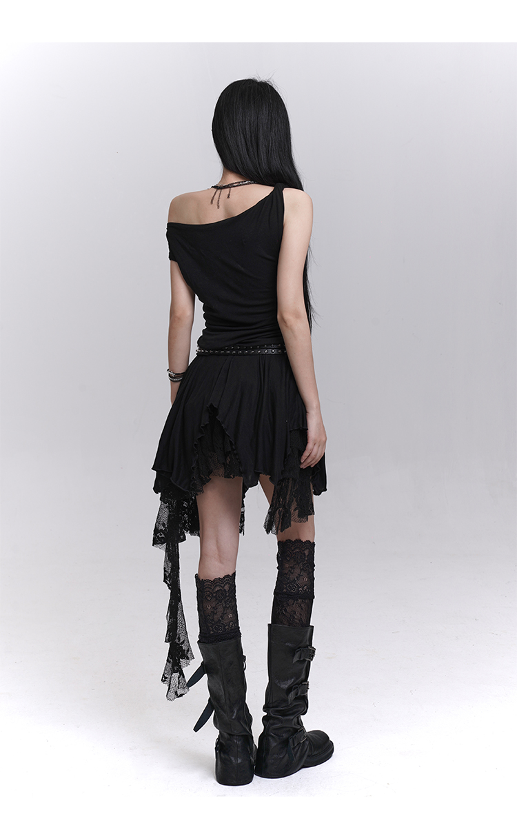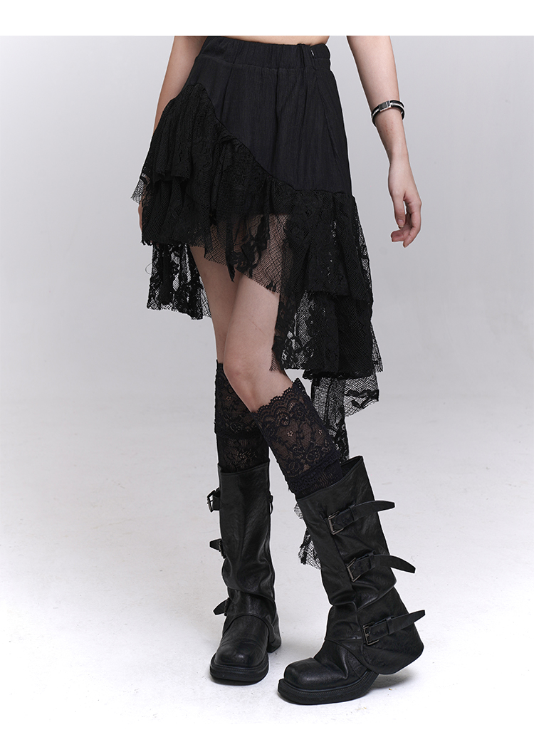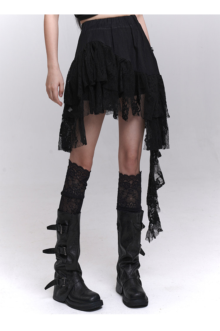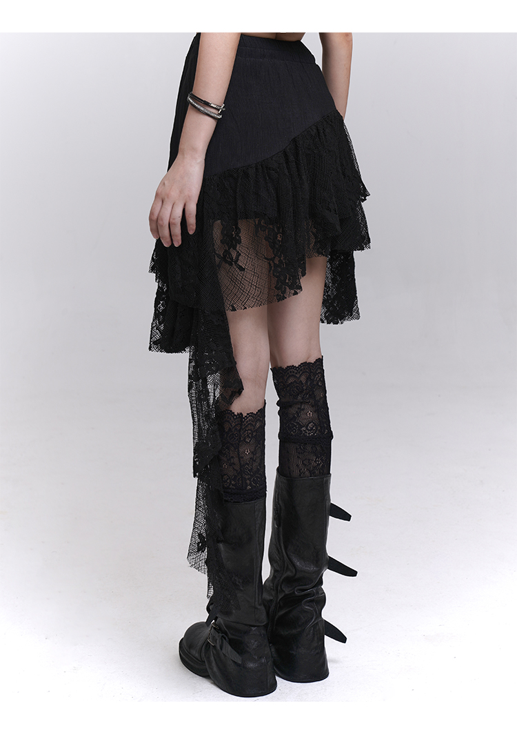 Ghostly Girl Black Irregular Lace Skirt for Summer Music Festival Hot Girl Outfit Base Skirt
