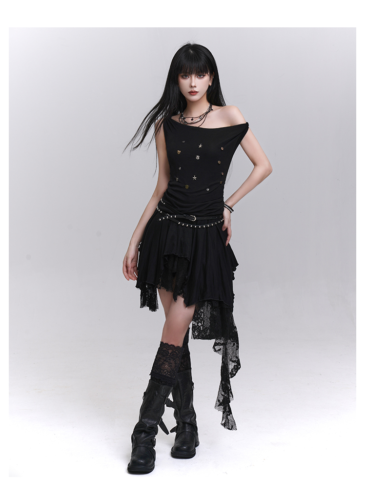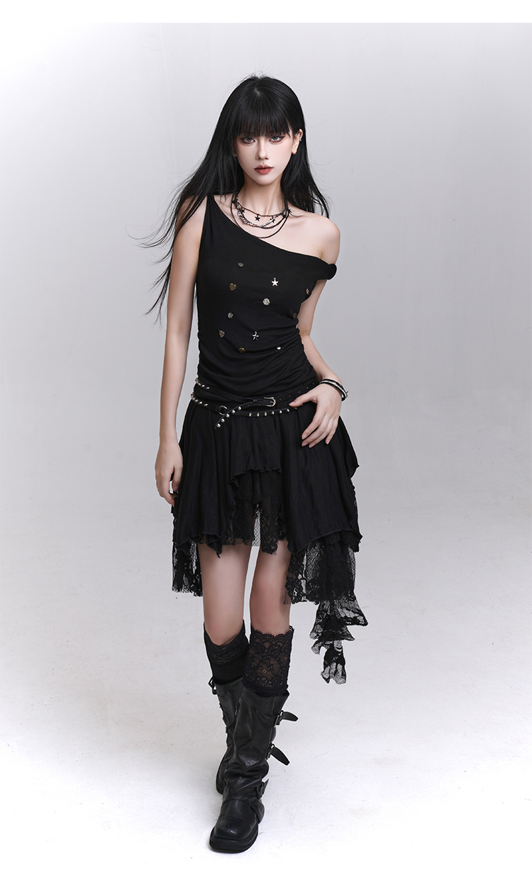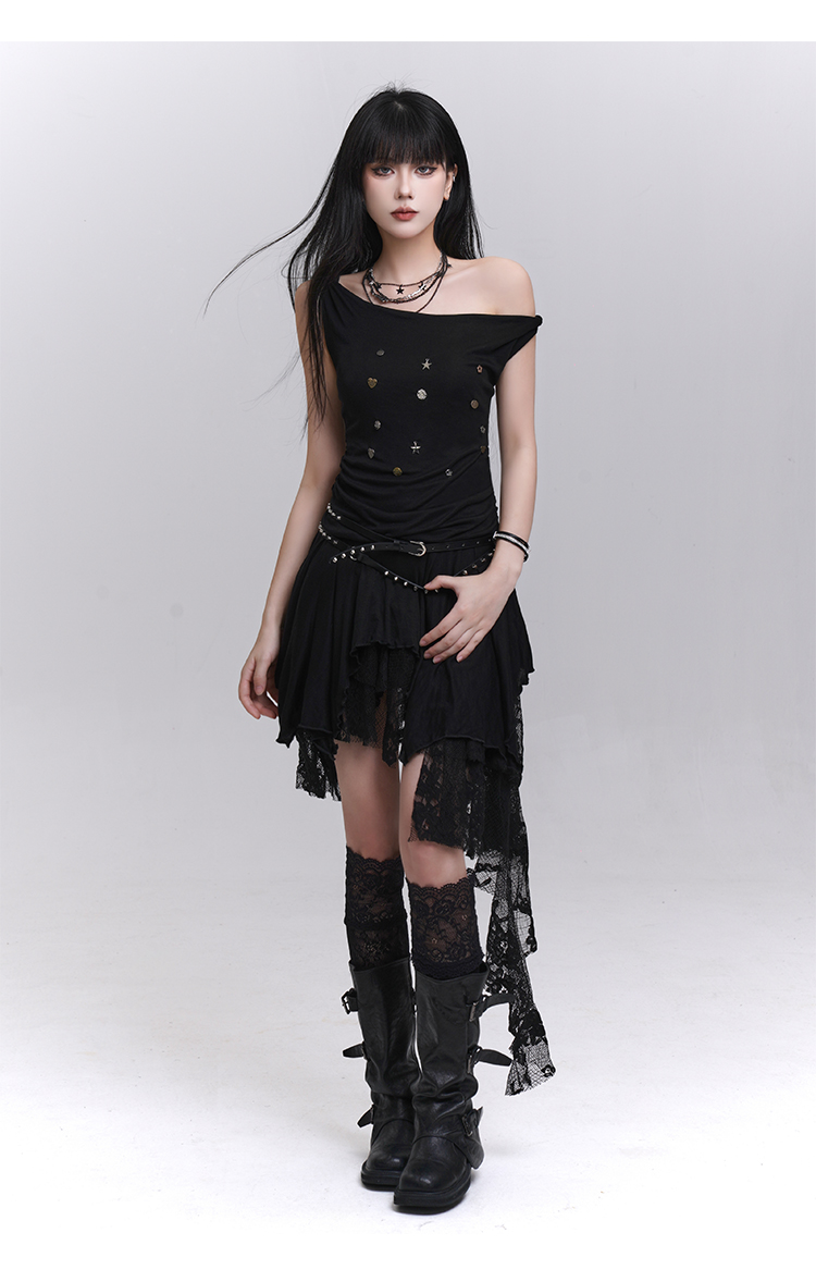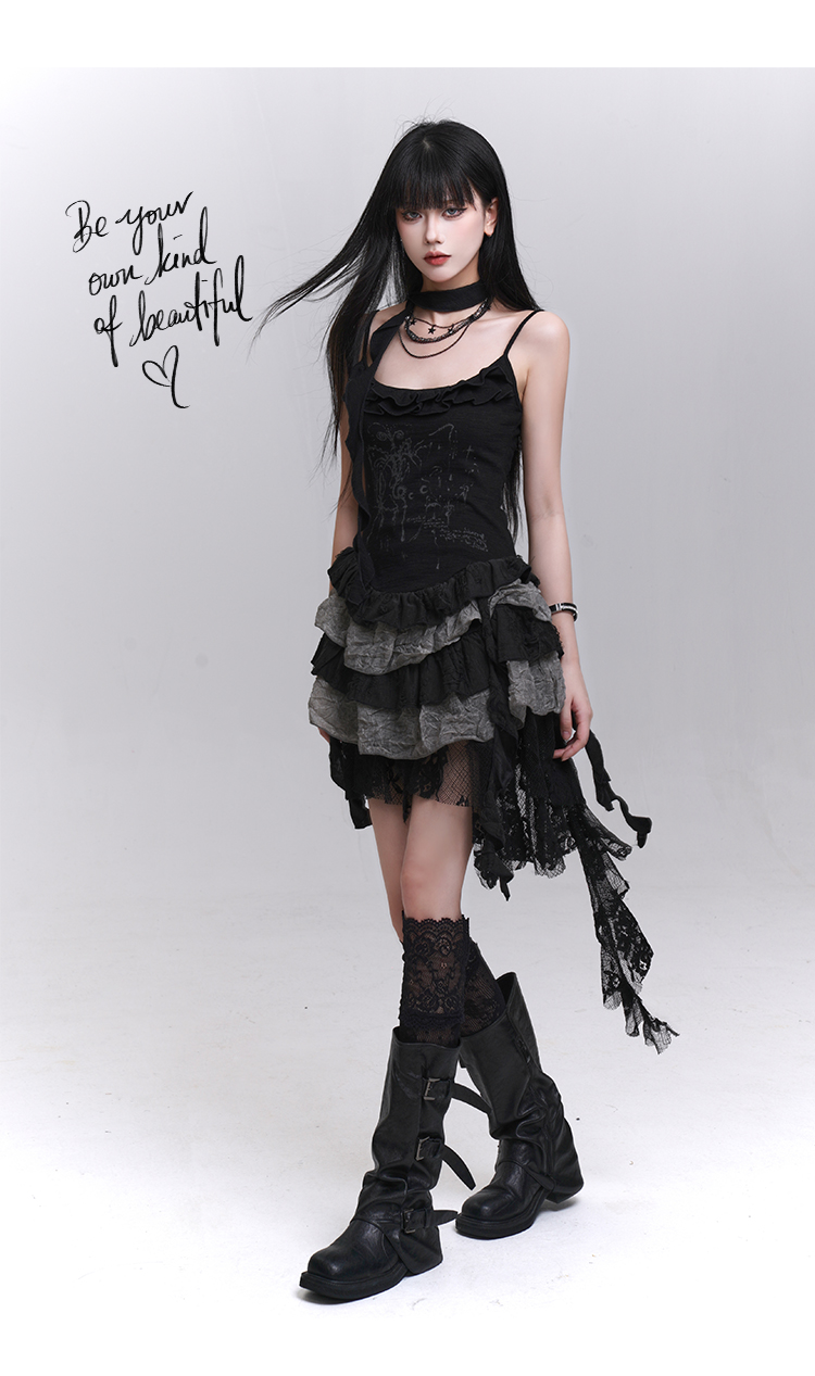 Ghostly Girl Black Irregular Lace Skirt for Summer Music Festival Hot Girl Outfit Base Skirt