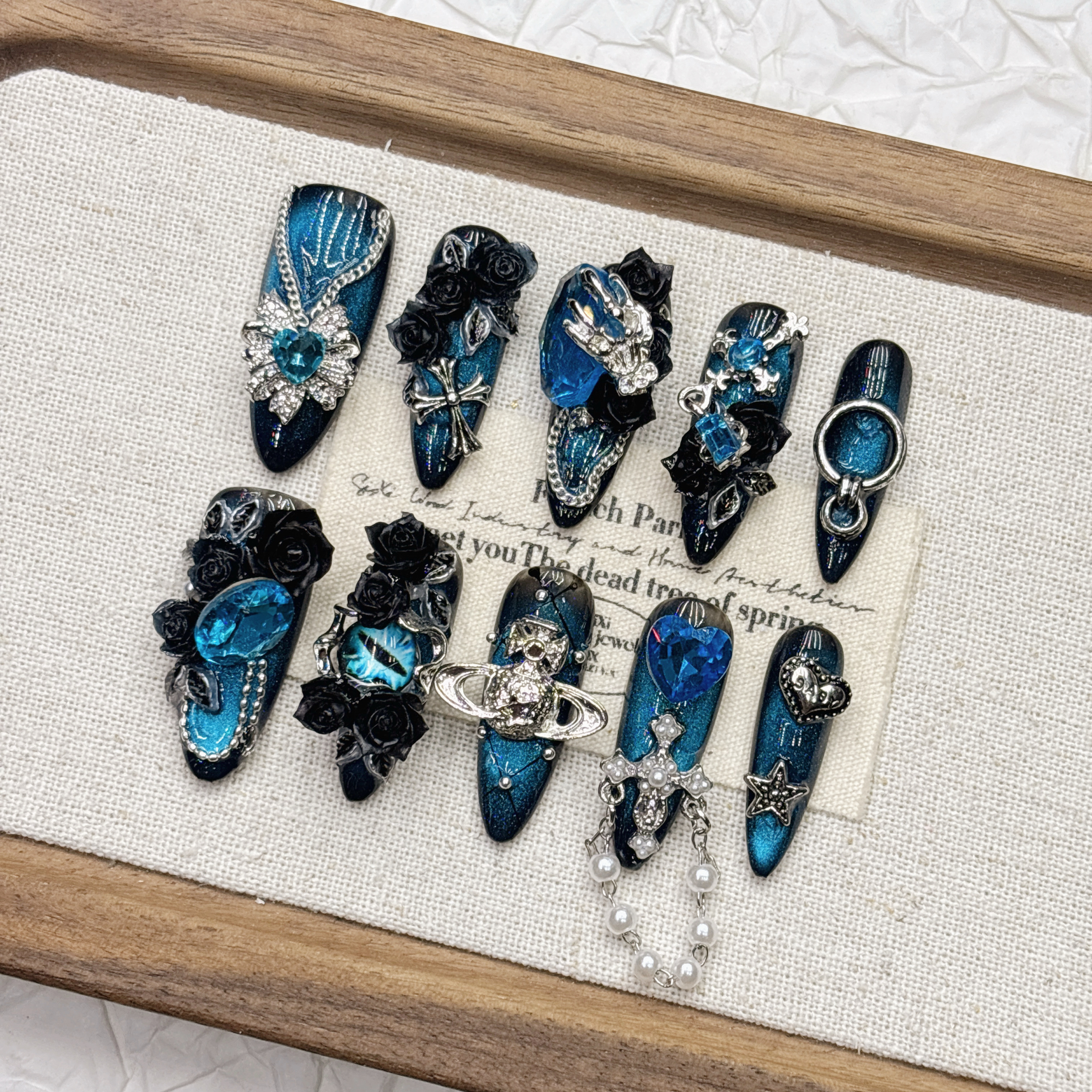 蓝色冰雪奇缘流苏纯手工穿戴甲猫眼满钻美甲重工2025新年中长版 [Original Page Link]
