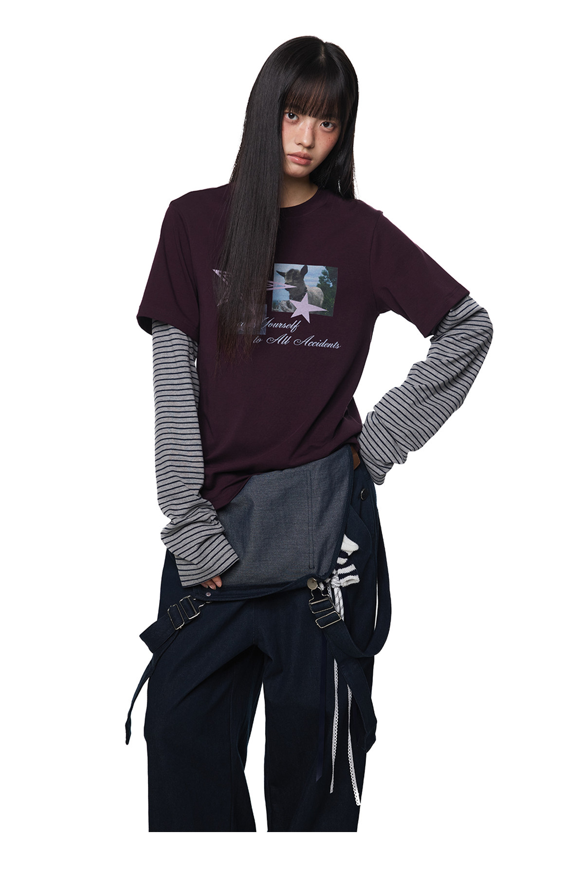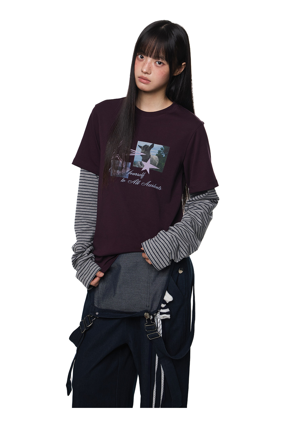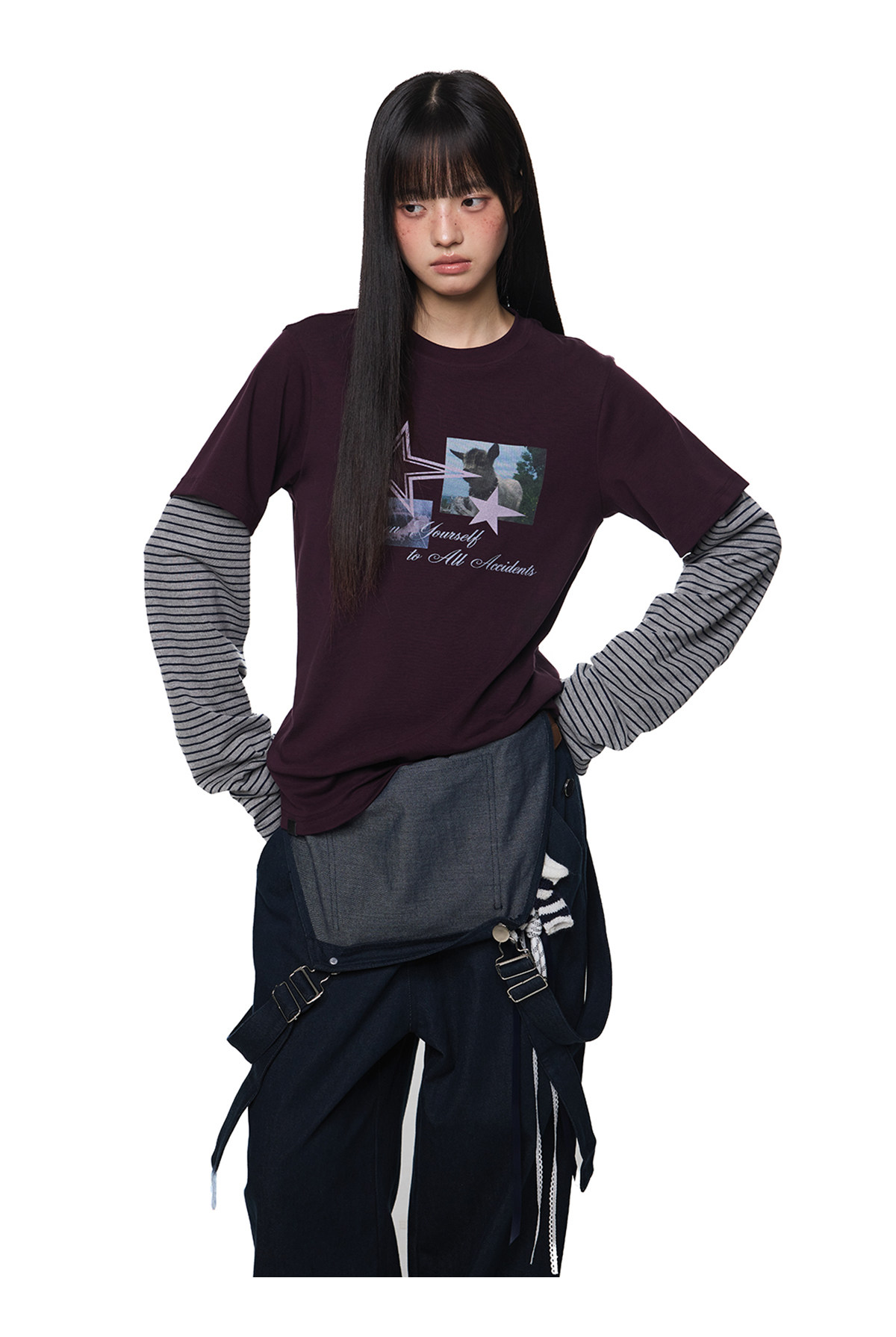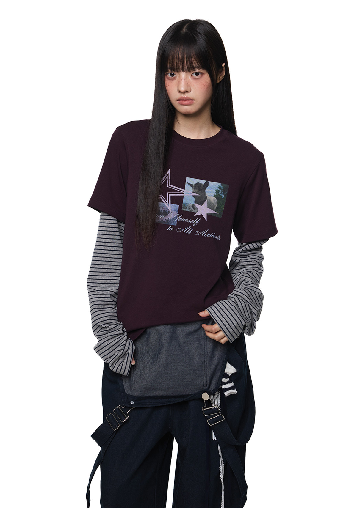 Ezek假两件套图案印花条纹长袖t恤女子夏季美国覆古休闲宽松圆领上衣 [Original Page Link]