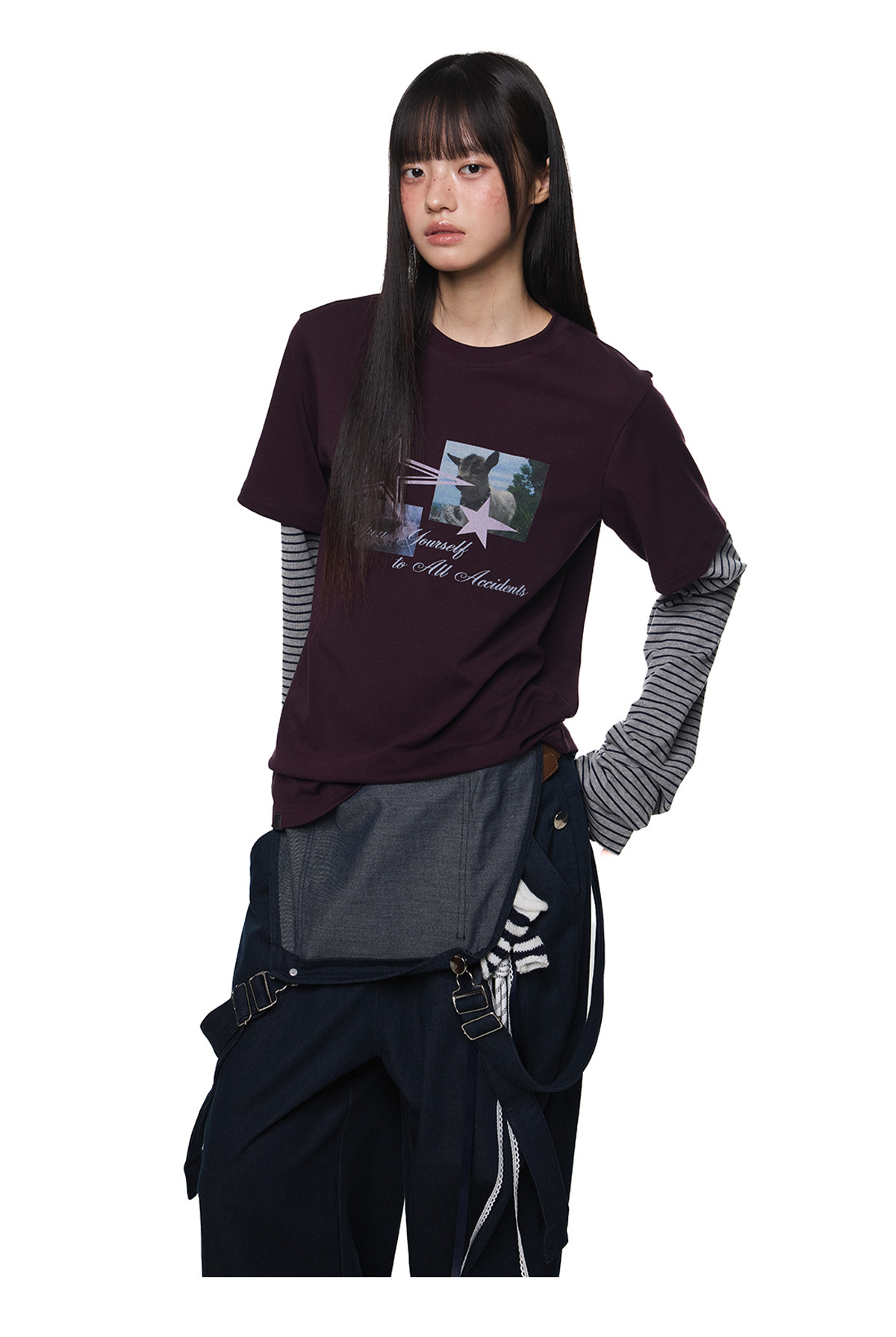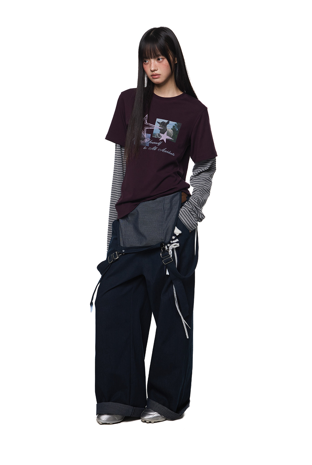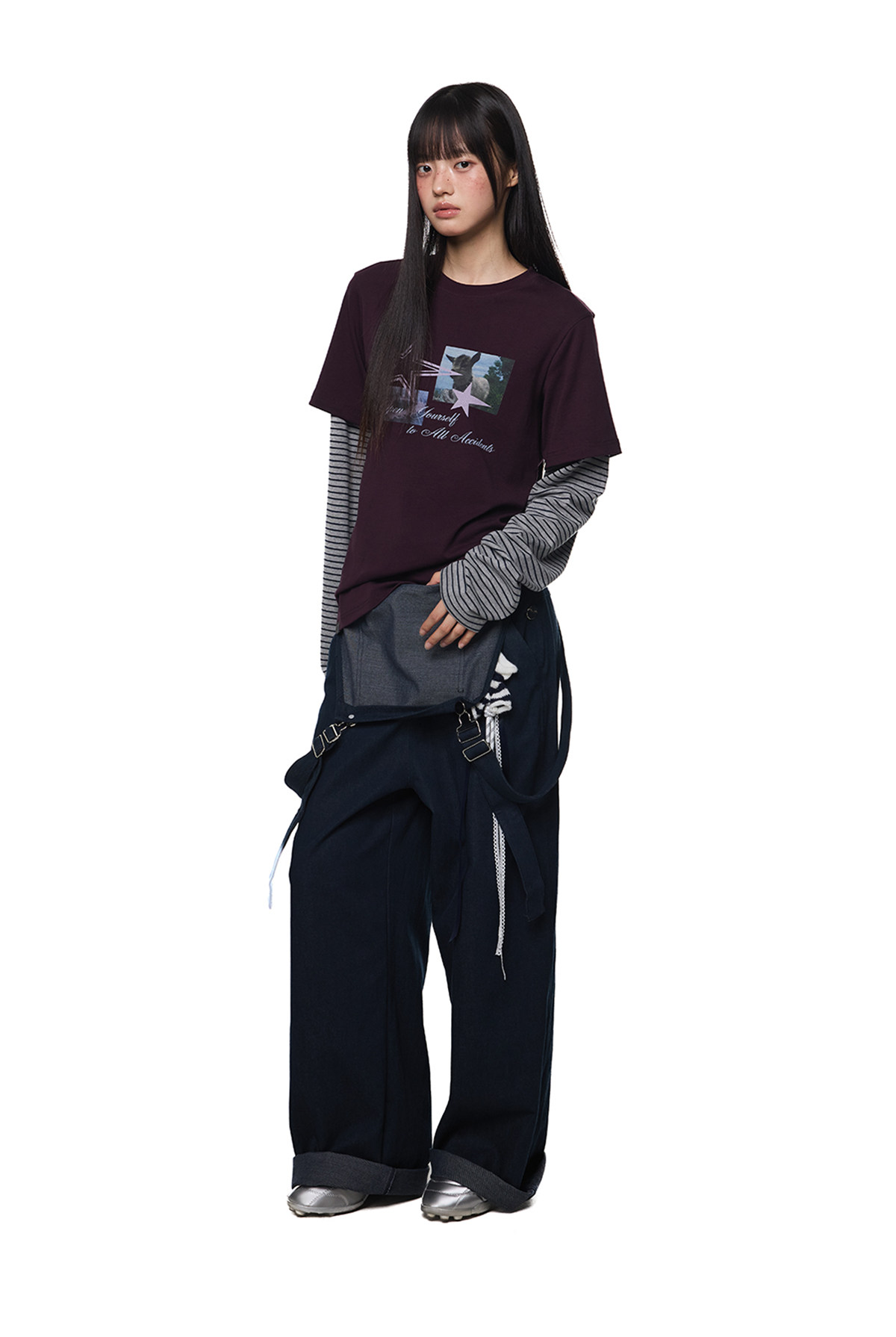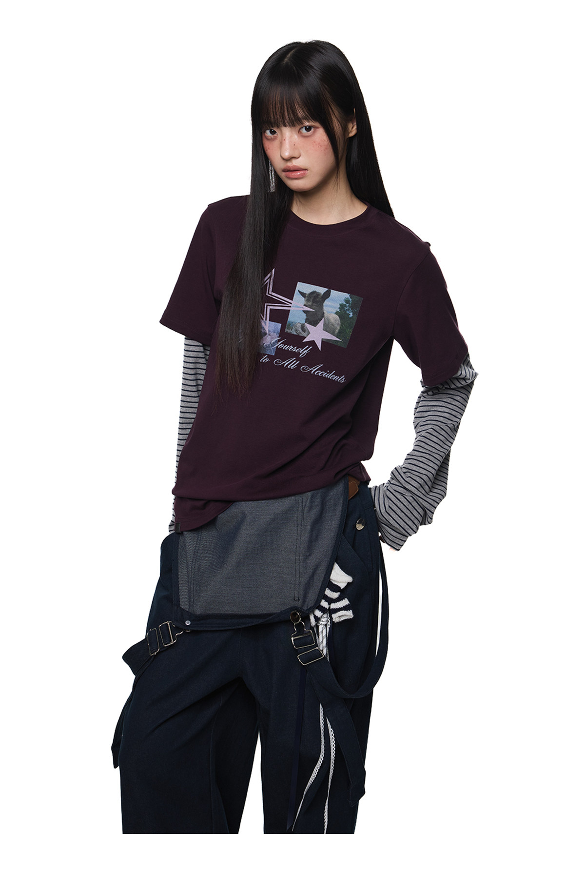Ezek假两件套图案印花条纹长袖t恤女子夏季美国覆古休闲宽松圆领上衣 [Original Page Link]