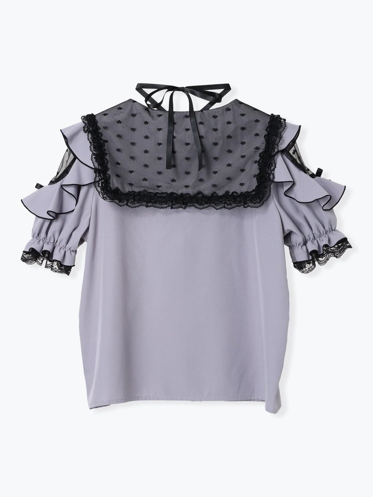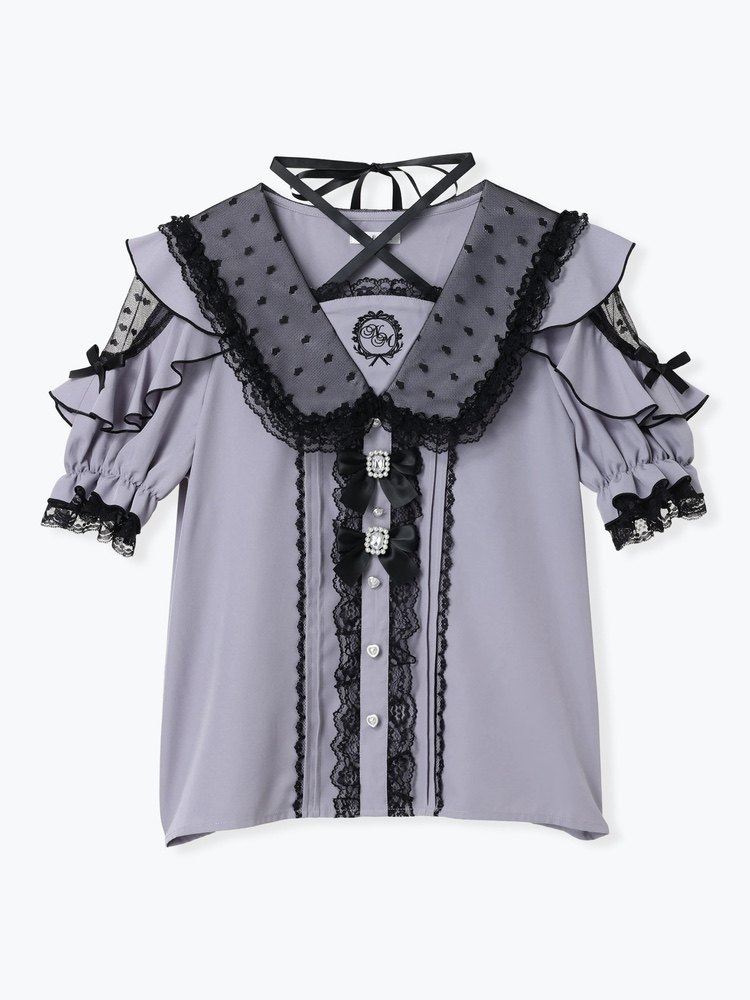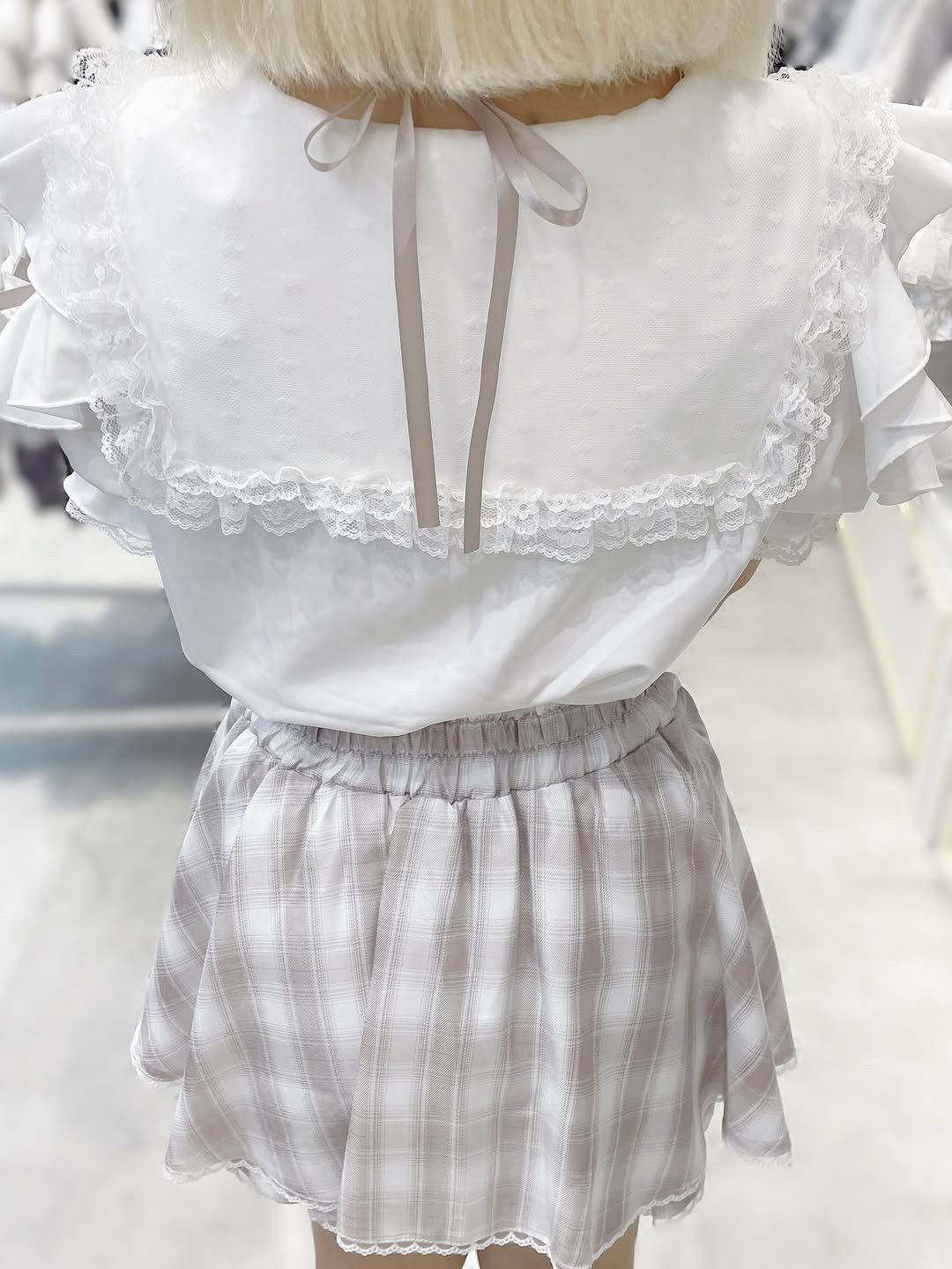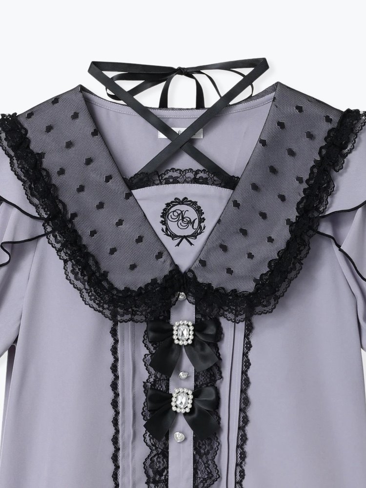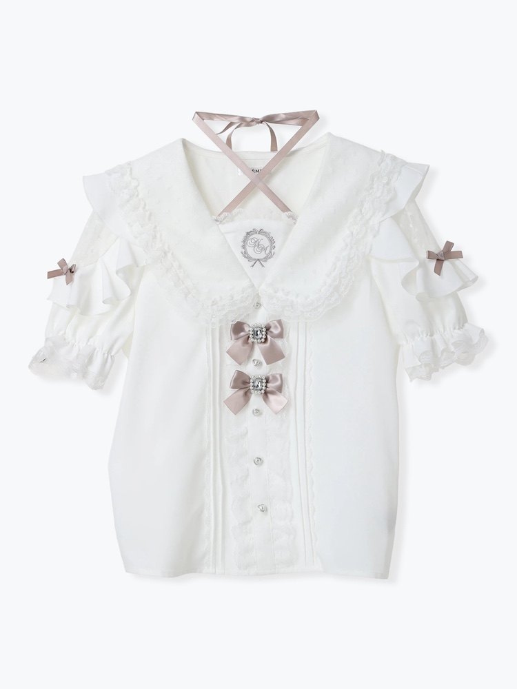 Exclusive real shot of noemie's new mass-produced tie-up embroidered lace off-shoulder short-sleeved shirt